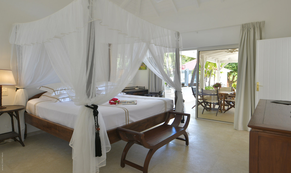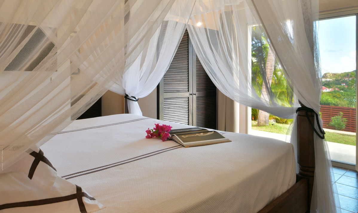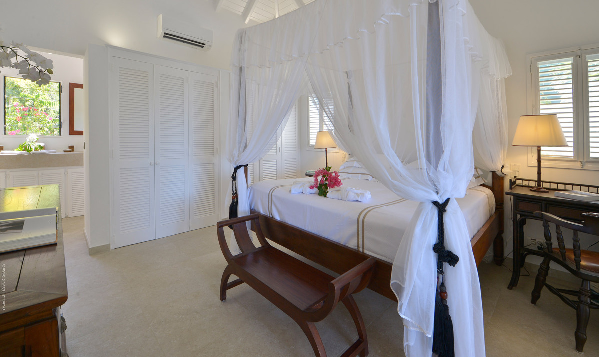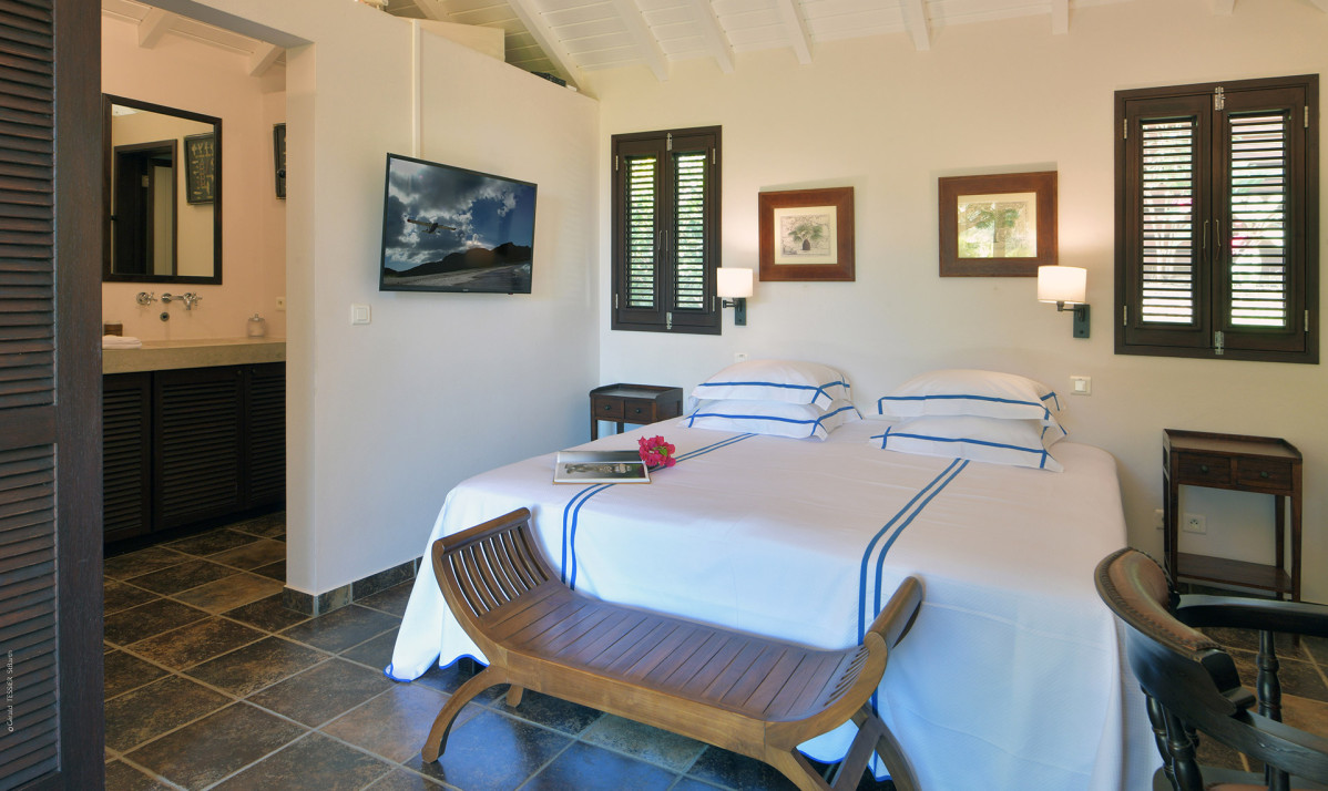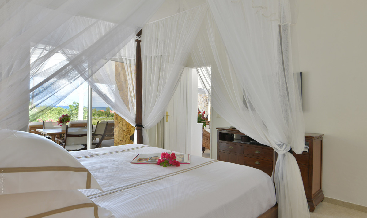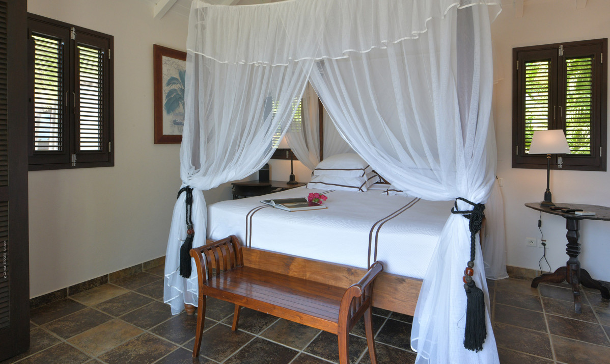In a separate pavilion, two additional bedrooms offer privacy from the main house, making Kir Royal an ideal choice for couples or families traveling together. Four-poster beds swathed in white muslin, wooden shutters crafted from dark exotic wood and artistic accents using vintage botanical illustrations add beautifully to the unassuming sophistication of this fantastic home away from home.
