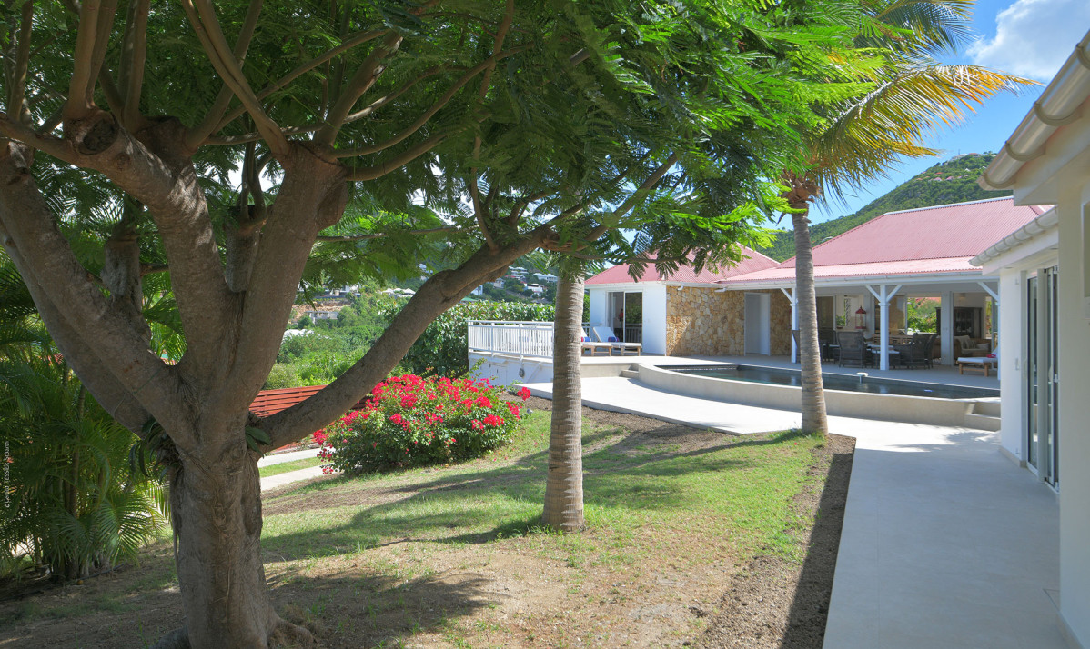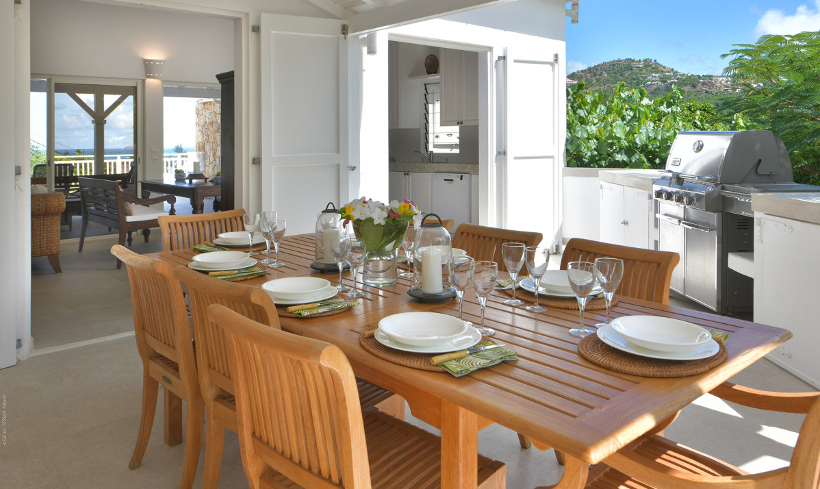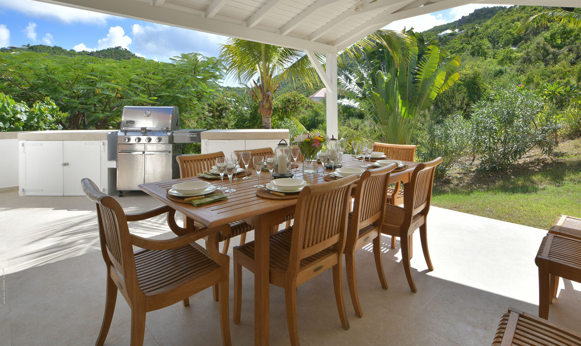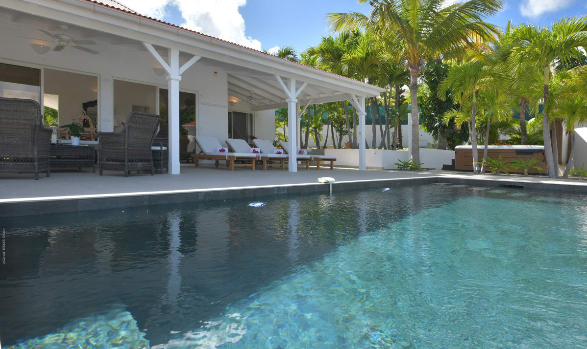 Handsomely landscaped gardens display fragrant frangipanis, bougainvillea, swaying palms and a flaming flamboyant under which a slumber in the hammock is highly recommendable. Guests will find the large swimming pool, Jacuzzi and outdoor shower in the garden’s midst absolutely delightful. Also, two covered dining terraces, one with an impressive gas BBQ grill, are ideal for garden party merry-making.