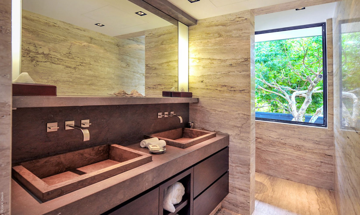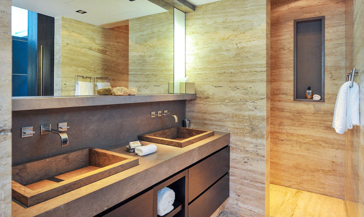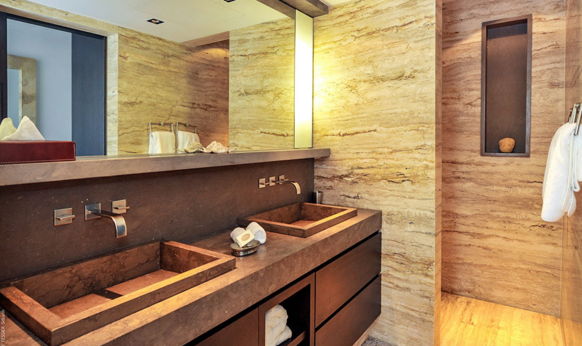 The property boasts 5 impeccably designed bedrooms, each offering a haven of relaxation. These well-appointed sanctuaries feature plush beds and high-quality linens, promising a restful night's sleep. To enhance the guest experience, every bedroom is equipped with rain-head showers and discreetly hidden flat-screen TVs within custom-made cabinets. Two of these lavish bedrooms grace the main level, ensuring convenience and easy access. The remaining three bedrooms, located on the lower level, each include a queen-sized bed and an ensuite bathroom with a shower and his-and-her vanities. Notably, the lower-level bedrooms can interconnect, making them ideal for families with young children or teenagers. For added flexibility, an office off the common area can serve as an additional bedroom for 1 guest if needed.