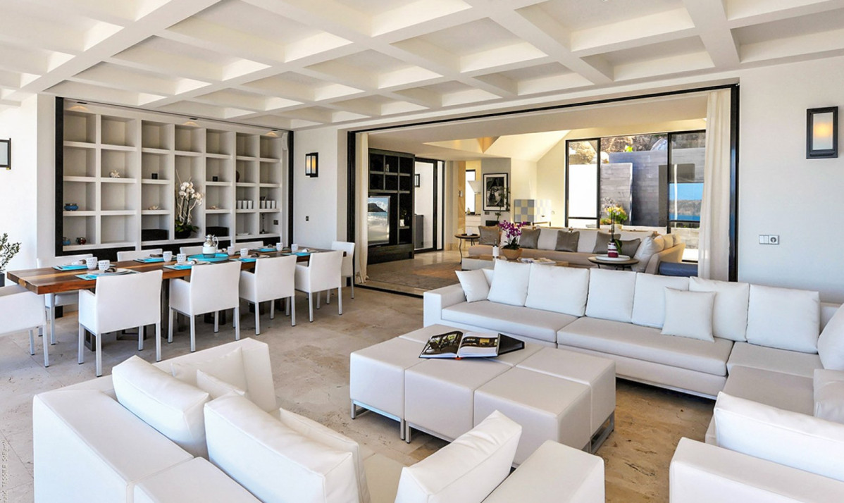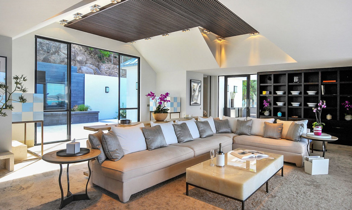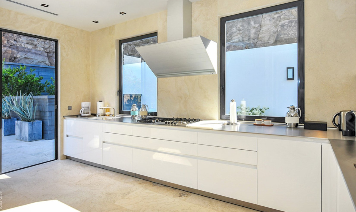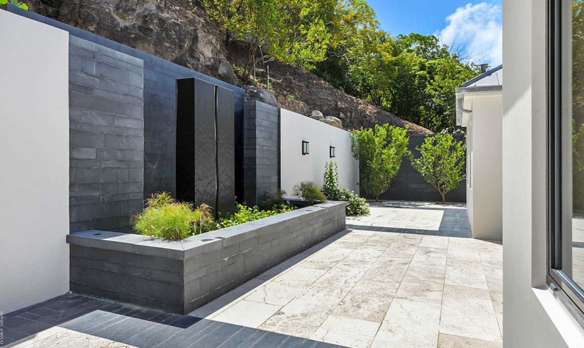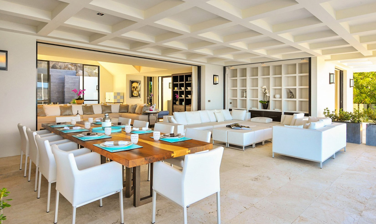 The property spread over two levels, encapsulates luxury and comfort in its interior design. The main floor features an open-plan great room, where the blend of contemporary design and coziness is evident. Recessed lighting and adaptable doors create a versatile space, perfect for both relaxing days and enchanting evenings. The living room, with its plush sectional sofa and elegant marble table, invites guests to unwind and enjoy the stunning view, leading out to the covered terrace ideal for sunset admiration. The kitchen, discreetly located, is the realm of a private chef, offered complimentary during the festive season, ensuring an exceptional dining experience. Meals are enjoyed on the covered patio, where dining amid incredible view and under starlit skies becomes a memorable experience. Additionally, an interior courtyard behind the house, complete with a gas grill and second seating for eight guests or more, offers a perfect setting for intimate gatherings.