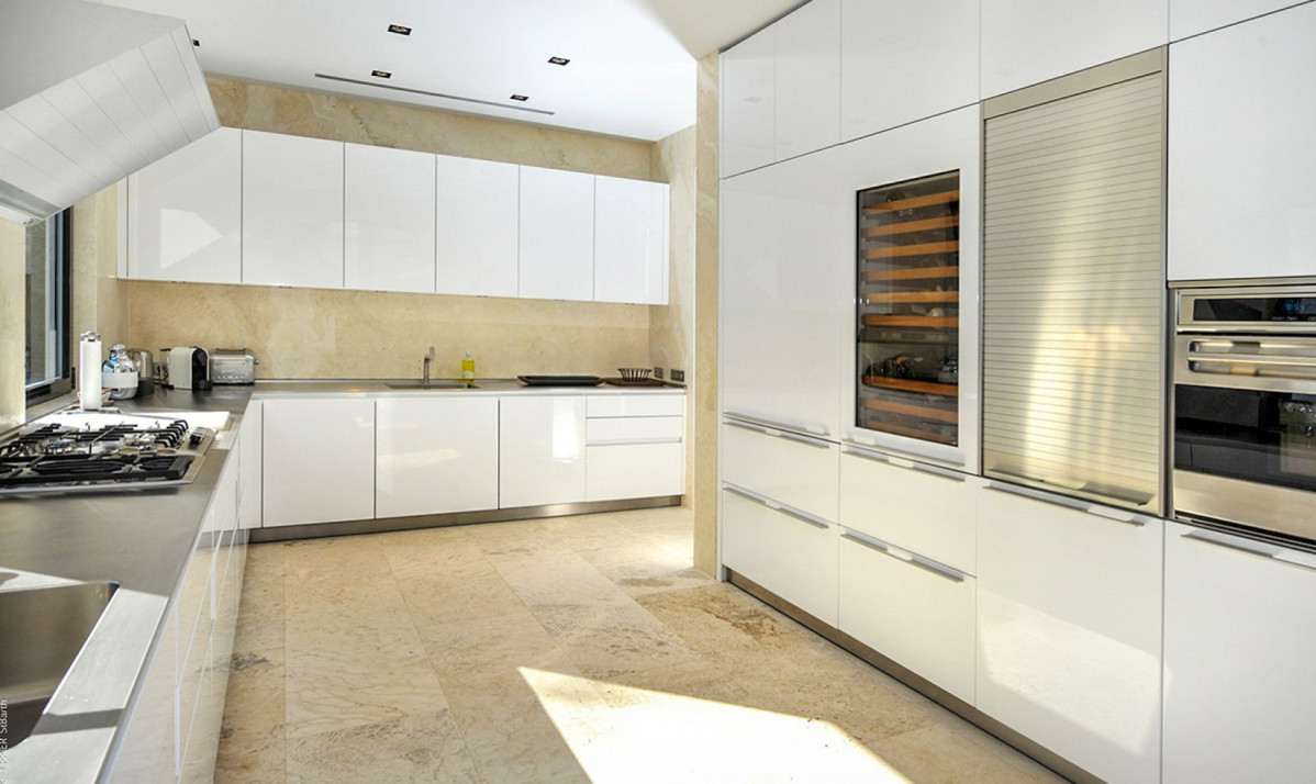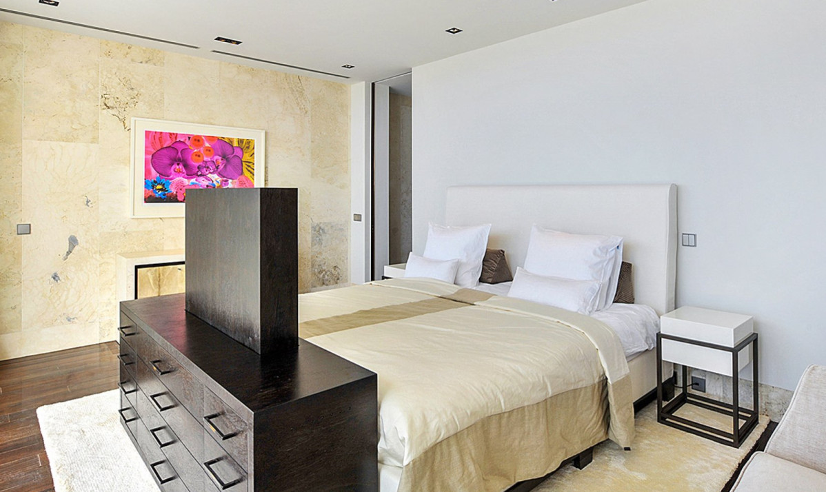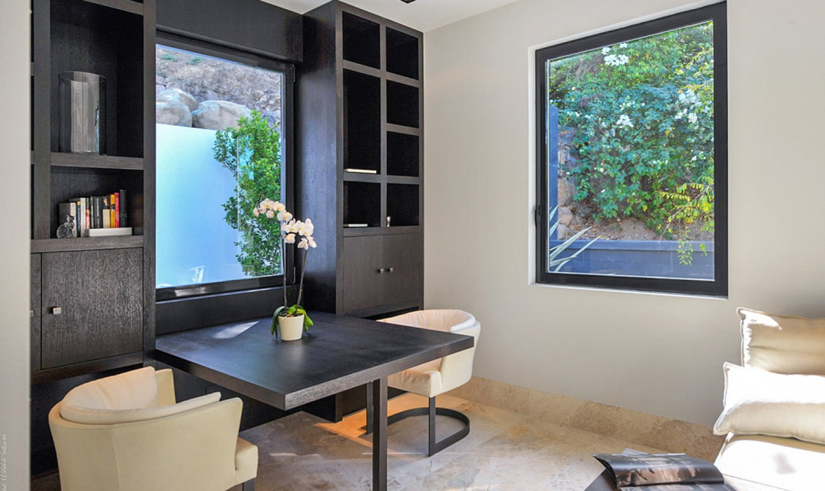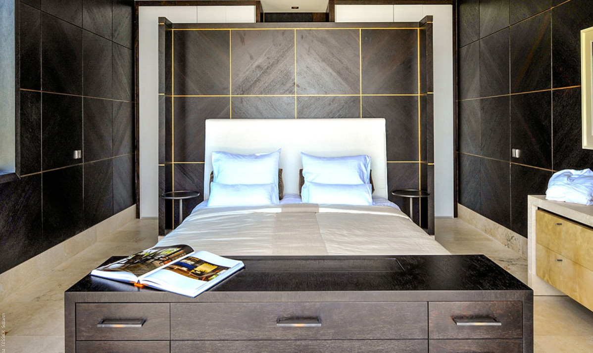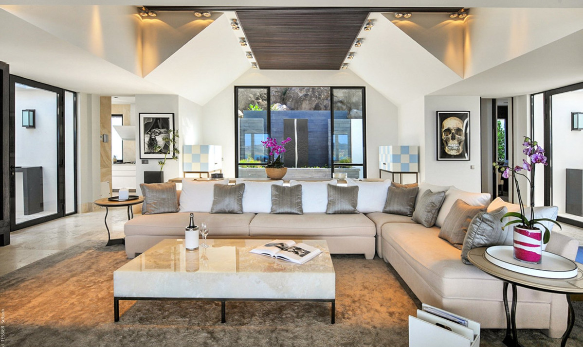 The property spread over two levels, encapsulates luxury and comfort in its interior design. The main floor features an open-plan great room, where the blend of contemporary design and coziness is evident. Recessed lighting and adaptable doors create a versatile space, perfect for both relaxing days and enchanting evenings. The living room, with its plush sectional sofa and elegant marble table, invites guests to unwind and enjoy the stunning view, leading out to the covered terrace ideal for sunset admiration. The kitchen, discreetly located, is the realm of a private chef, offered complimentary during the festive season, ensuring an exceptional dining experience. Meals are enjoyed on the covered patio, where dining amid incredible view and under starlit skies becomes a memorable experience. Additionally, an interior courtyard behind the house, complete with a gas grill and second seating for eight guests or more, offers a perfect setting for intimate gatherings.