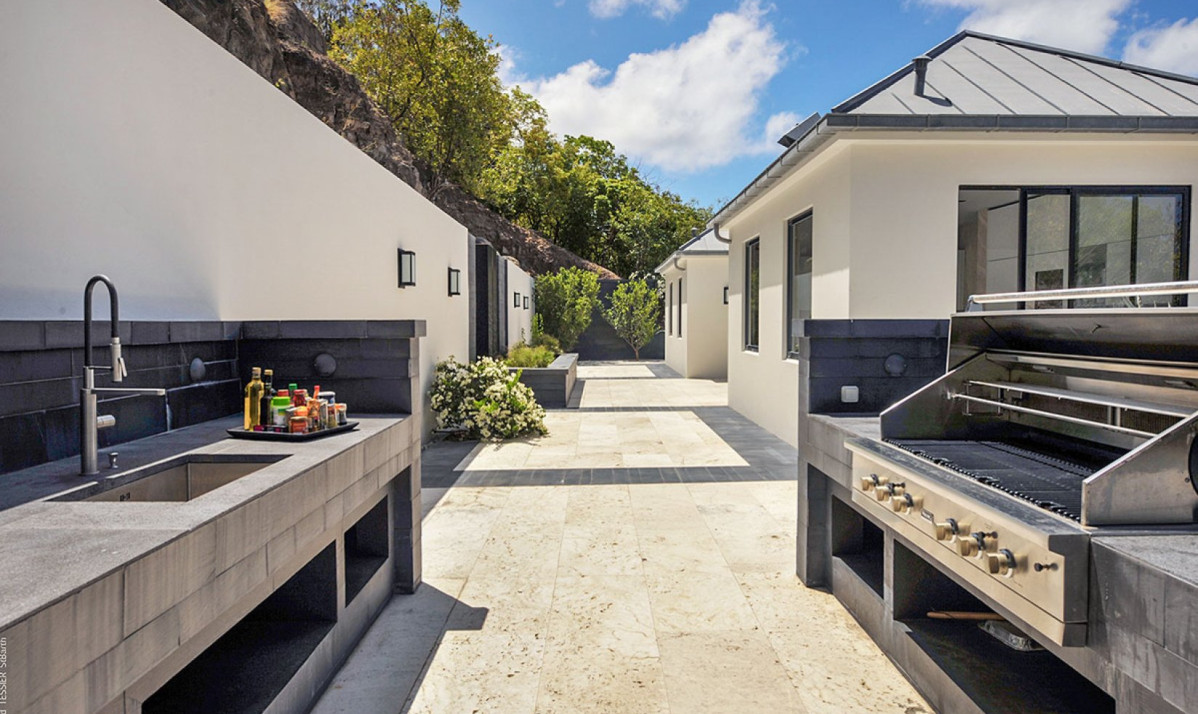 The exterior of the property is a masterpiece of design, offering an unparalleled outdoor experience. This exquisite house boasts not one, but two heated pools, ensuring a luxurious and refreshing escape. The lower level features a large lap pool, perfect for exercise or leisure, while the smaller pool upstairs provides a more intimate setting. This upper pool area is adorned with comfortable loungers, inviting guests to bask in the Caribbean sun or immerse themselves in the stunning ocean view. Adding to the property's charm is the grand twin staircase, elegantly connecting the two levels of outdoor space. It serves as a striking architectural feature, enhancing the sophisticated ambiance. At the rear of the property, guests will find a well-appointed BBQ area, ideal for al fresco dining or evening gatherings under the stars. The home's exterior is thoughtfully designed to blend luxury, comfort, and the natural beauty of the island.