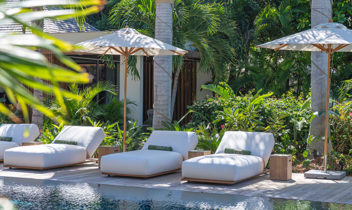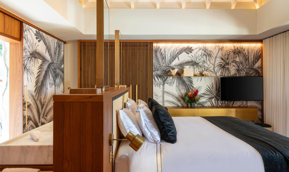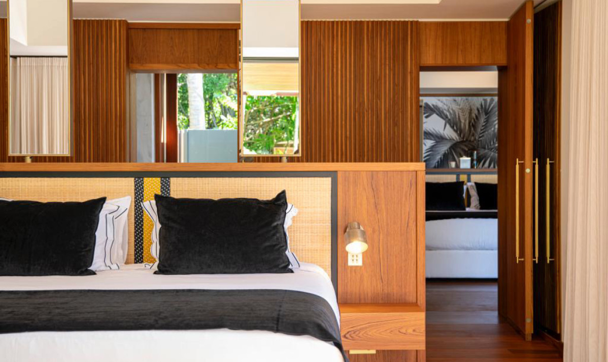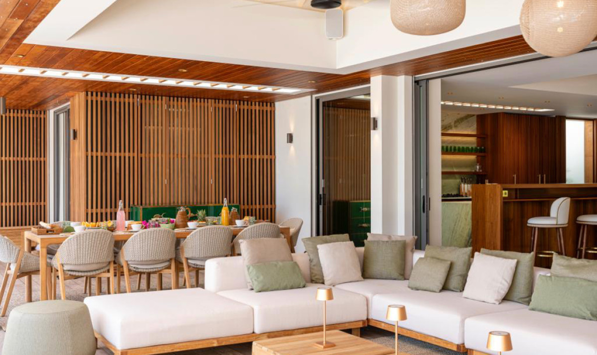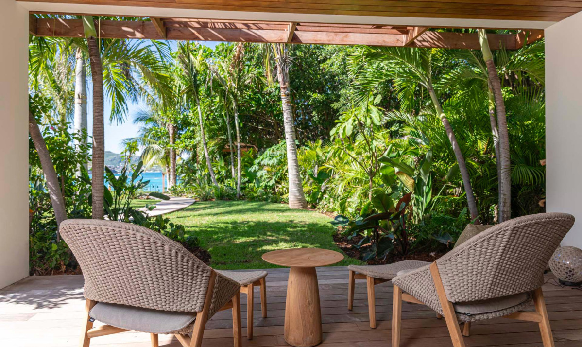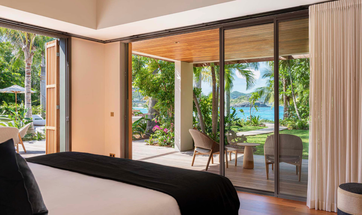 Villa Palm Beach St Barth features five luxurious bedrooms, each a haven of tranquility with plush beds crafted from dark island teak. The main house hosts four bedrooms, two on either side of the living area, each offering stunning views across the pool towards Lorient Bay. These bedrooms combine elegance with comfort, including air conditioning and en-suite showers. The fifth bedroom, a unique retreat, is located in a separate bungalow at the property's rear. It includes a king-sized bed, en-suite bathroom, and its own kitchenette and dining area on the terrace, perfect for guests seeking extra privacy, such as teenagers or a nanny.