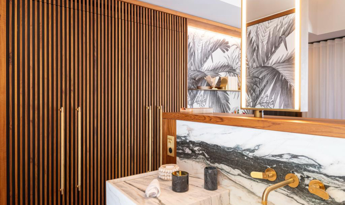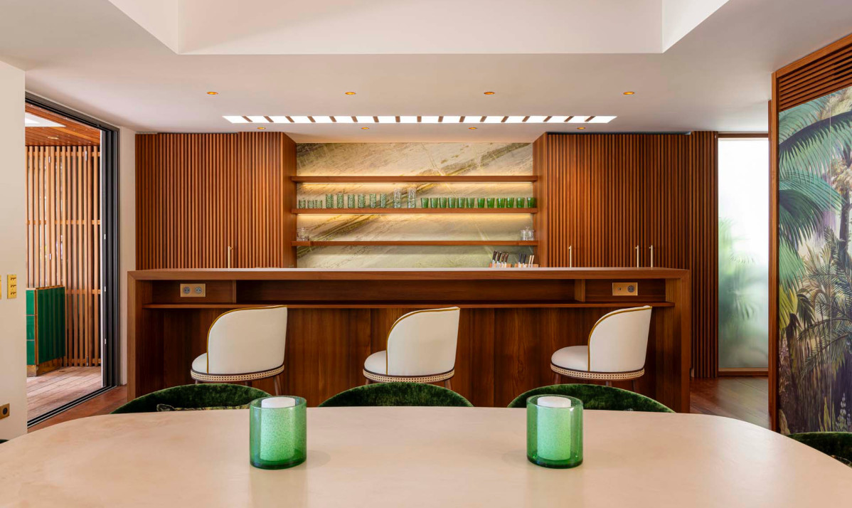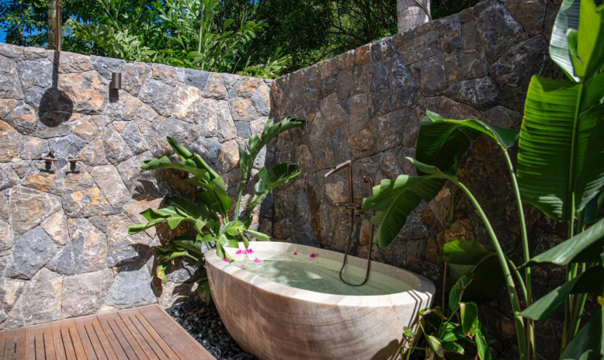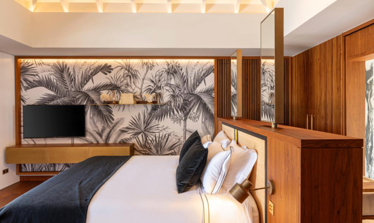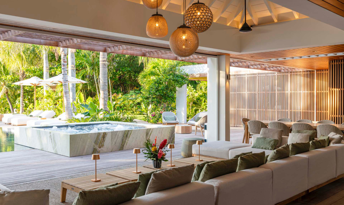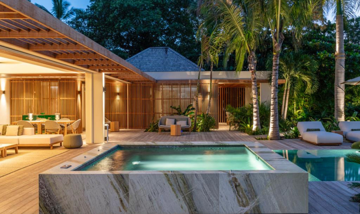 Villa Palm Beach St Barth features five luxurious bedrooms, each a haven of tranquility with plush beds crafted from dark island teak. The main house hosts four bedrooms, two on either side of the living area, each offering stunning views across the pool towards Lorient Bay. These bedrooms combine elegance with comfort, including air conditioning and en-suite showers. The fifth bedroom, a unique retreat, is located in a separate bungalow at the property's rear. It includes a king-sized bed, en-suite bathroom, and its own kitchenette and dining area on the terrace, perfect for guests seeking extra privacy, such as teenagers or a nanny.