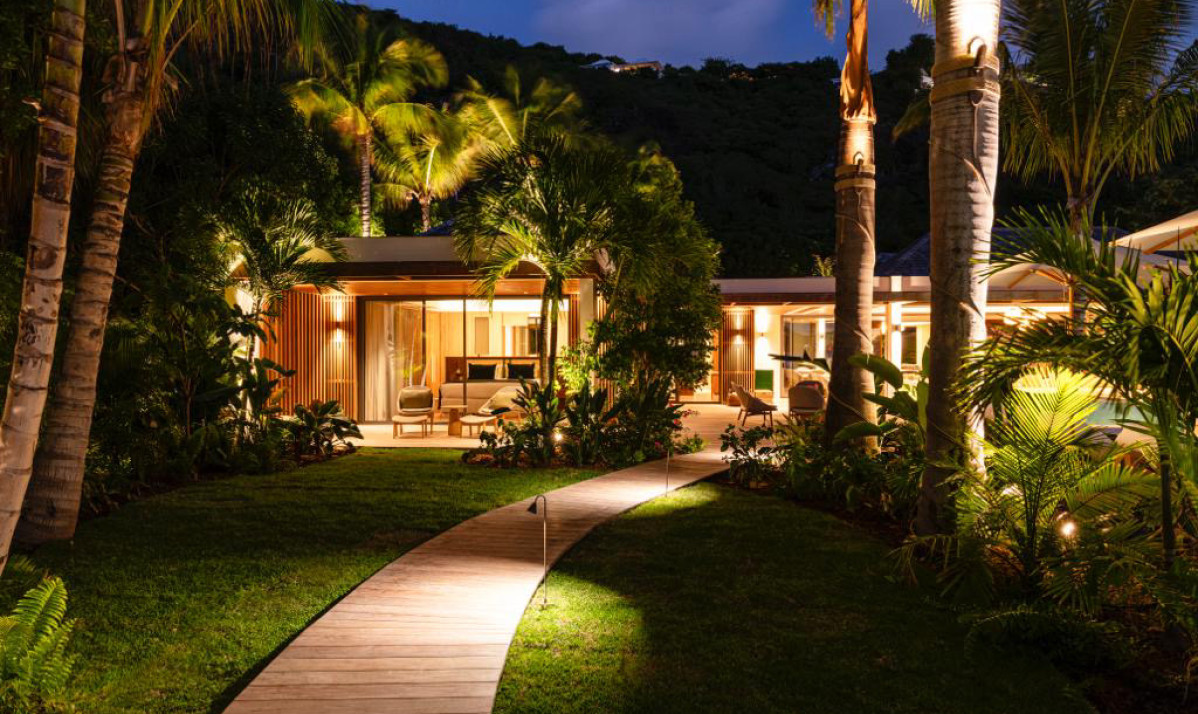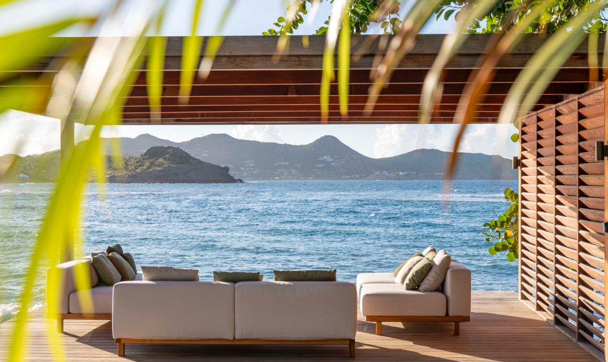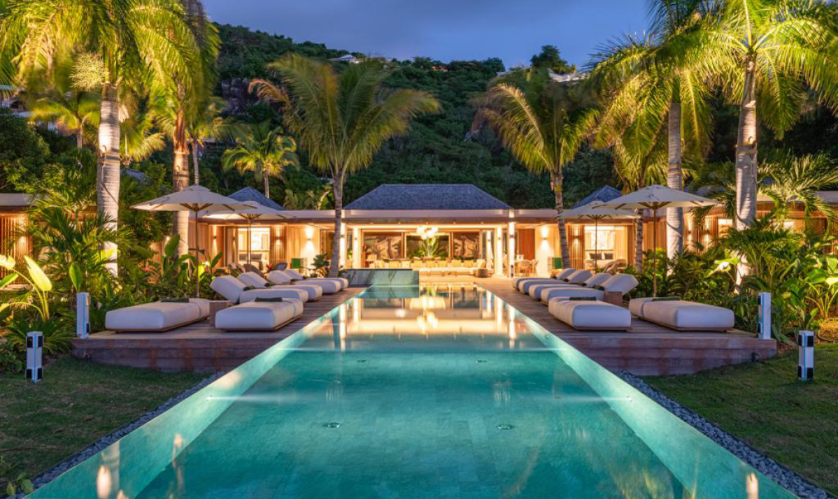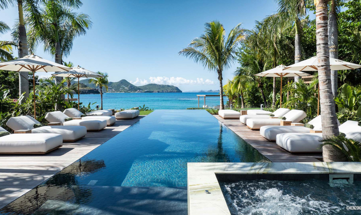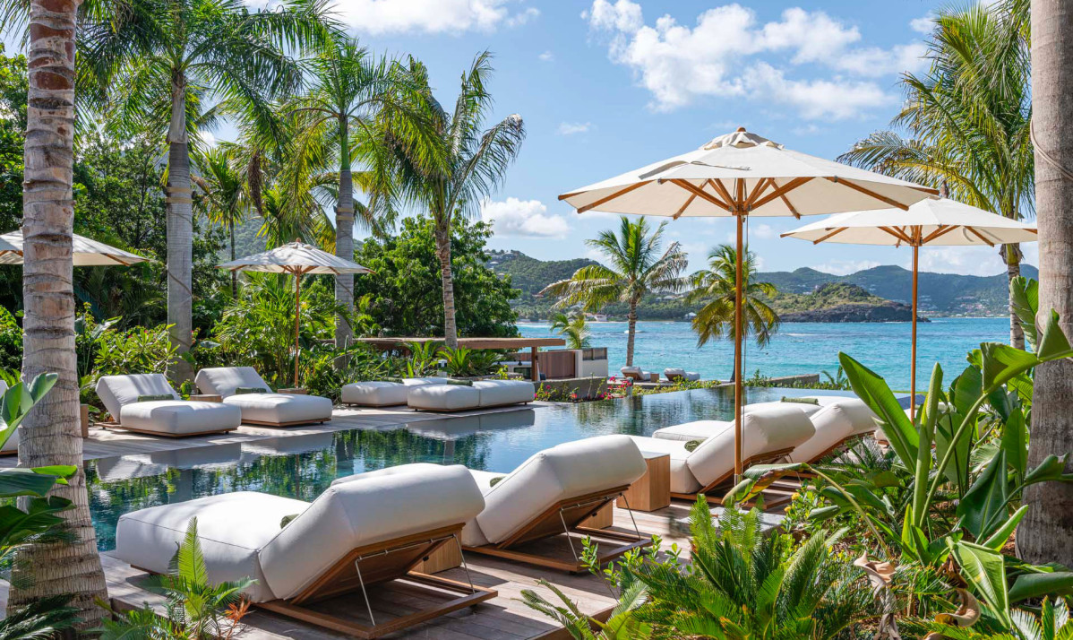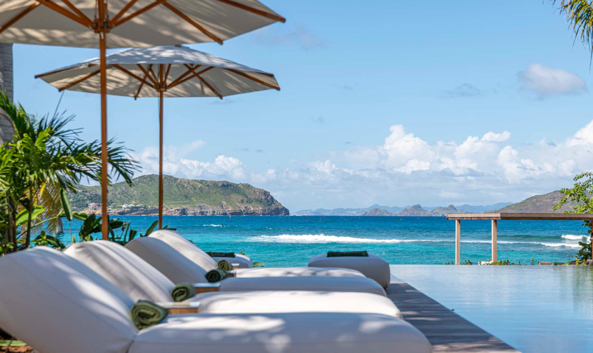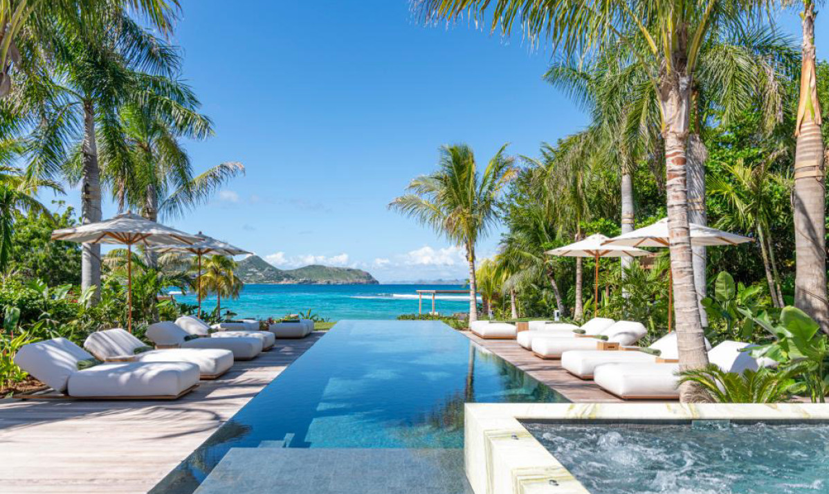 The exterior of Villa Palm Beach St Barth, located in the heart of Lorient, St. Barts, is an entertainer's dream. Its stunning infinity pool, the centerpiece of the property, is flanked by sun loungers and umbrellas, all under the sway of majestic palm trees. The lush gardens offer unparalleled privacy, transforming the space into a serene oasis perfect for relaxation. Guests can enjoy breathtaking ocean views while relaxing on the beach or in the pool. The outdoor area, featuring a cozy sofa, ideal for hosting sunset cocktail parties. Each space of the villa, including the luxurious bedrooms, is designed to provide comfort and a spectacular view of the surroundings. A tranquil daybed under a gazebo offers a peaceful spot for guests to unwind or delve into a good book. As night falls, the poolside jacuzzi, overlooking the beach and the ocean, becomes a magical place to relax under the starlit sky.