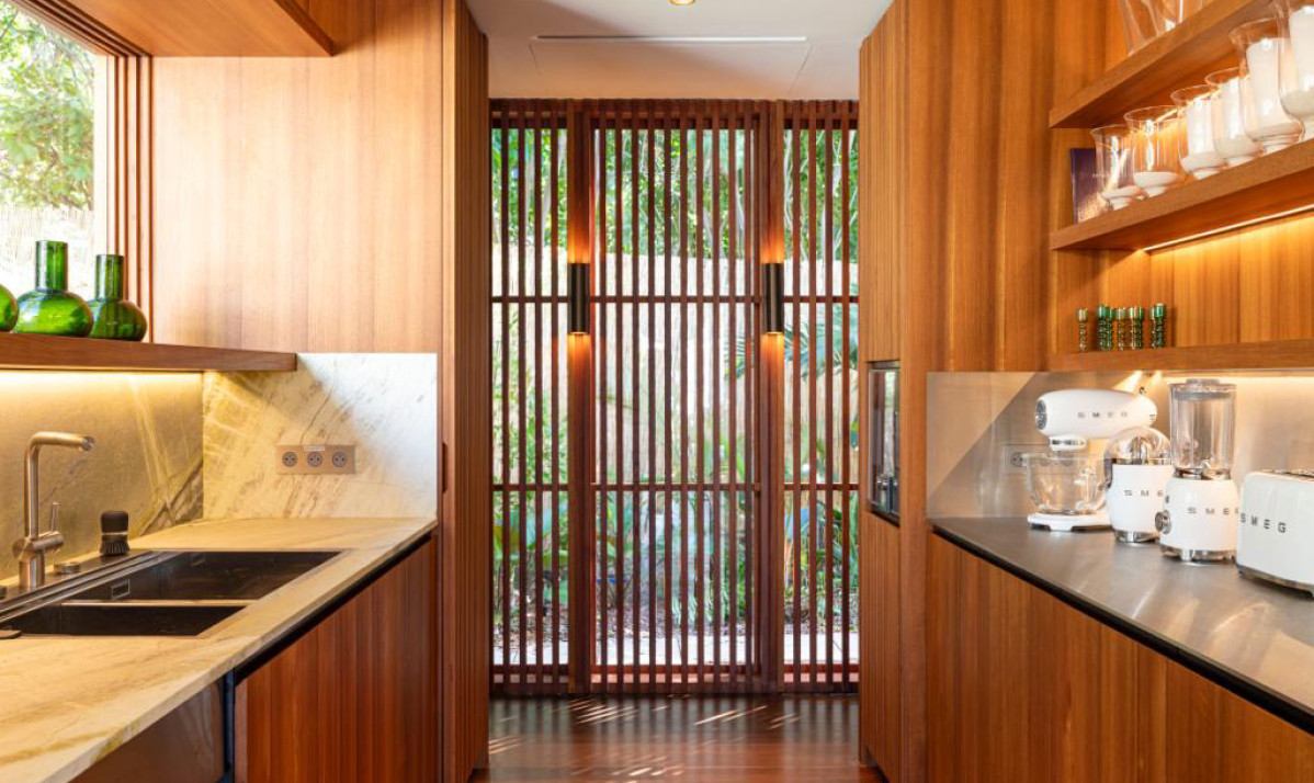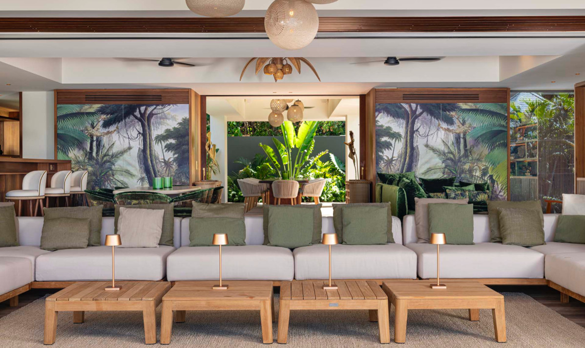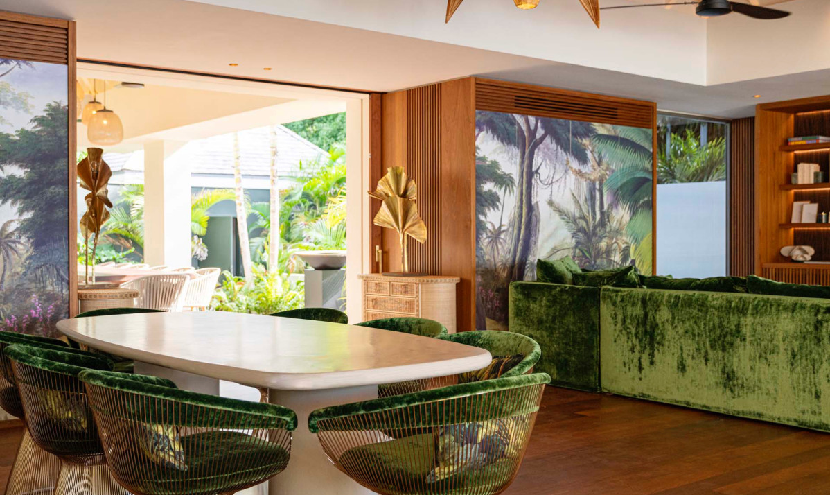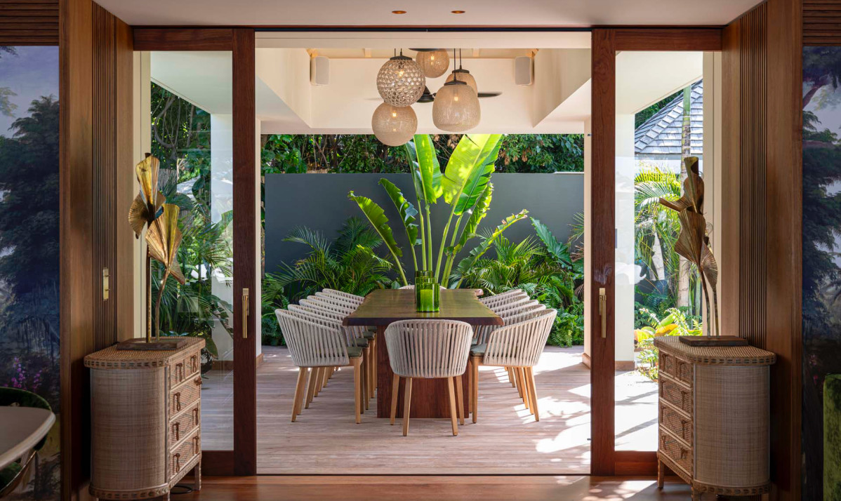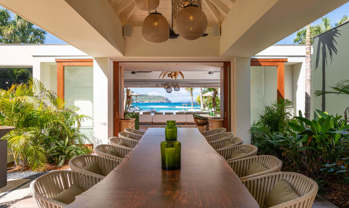 Inside Villa Palm Beach St Barth, the essence of luxury and comfort is captured in every detail, creating an inviting atmosphere for visitors. The house opens up to a spacious great room, combining a living space with plush sofas - perfect for enjoying morning coffee and a state-of-the-art entertainment unit for memorable movie nights. Overlooking the stunning beach and ocean, the large windows frame breathtaking views, seamlessly integrating the beauty of St. Barts into the house. The heart of the property is the gourmet kitchen, fully equipped for culinary adventures, whether experimenting with local French and Creole flavors or enjoying catered meals from a private chef, organized effortlessly by our concierge. Adjacent to the kitchen is the dining area, featuring a large table that comfortably seats up to eight guests, ideal for elegant dinner parties. For those who prefer feasting al fresco, the covered terrace outside offers an alternative dining space, allowing guests to savor their meals while gazing out at the shimmering Caribbean and the villa's picturesque pool zone, all surrounded by lush palm trees and the serene ambience of the property.