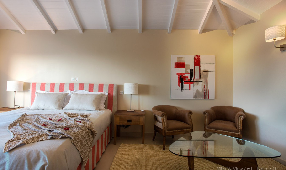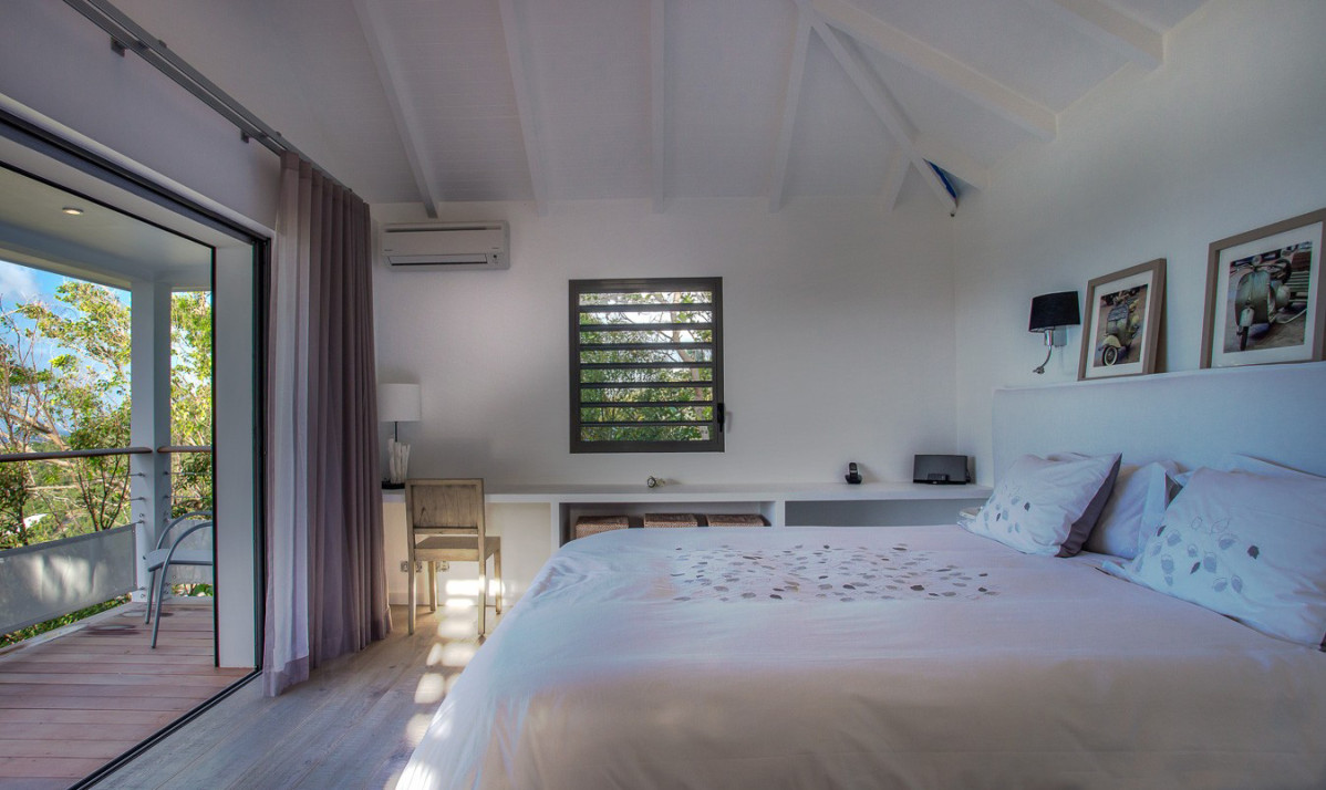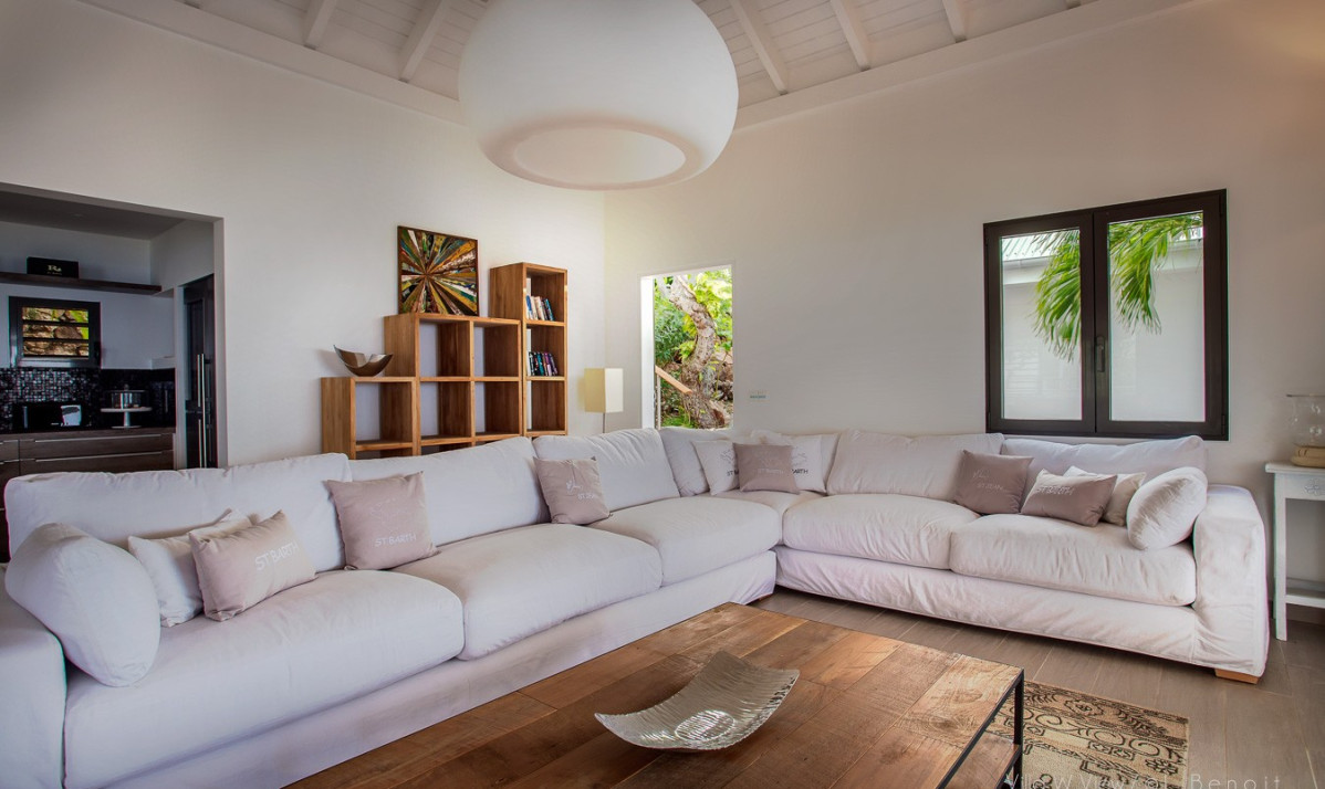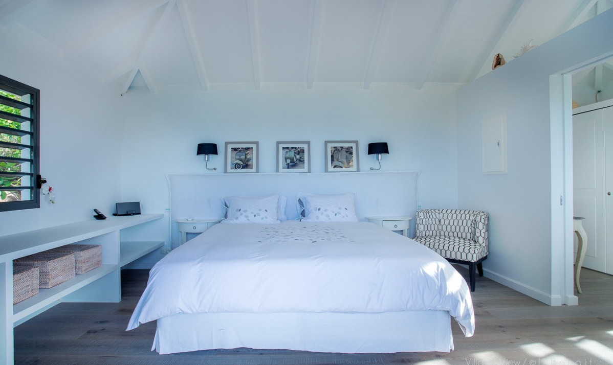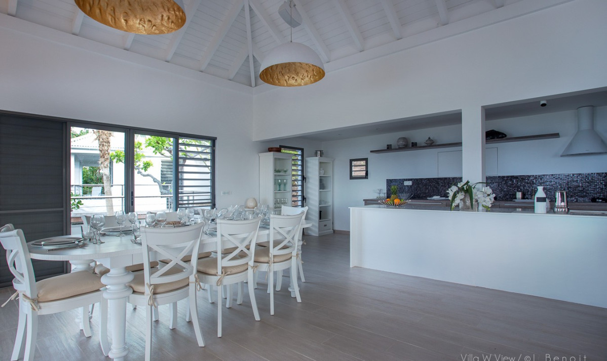 With its large openings from inside to out, the serene views of St Jean Bay can be seen from the entire indoor living space. The theme inside is predominantly white with an even higher ceiling than is typical for St Barts, giving a very bright and airy ambiance. This main living area is divided between dining and living space with the large and very well-equipped kitchen behind, still enjoying the views. The whiteness of the room is broken up here by the warm wood of the lower cabinets, and the copper accents within the light fixtures which mimic the sun. Throughout the villa, the sense of space is incredible, providing spots for quiet retreat or conviviality, depending on the mood.