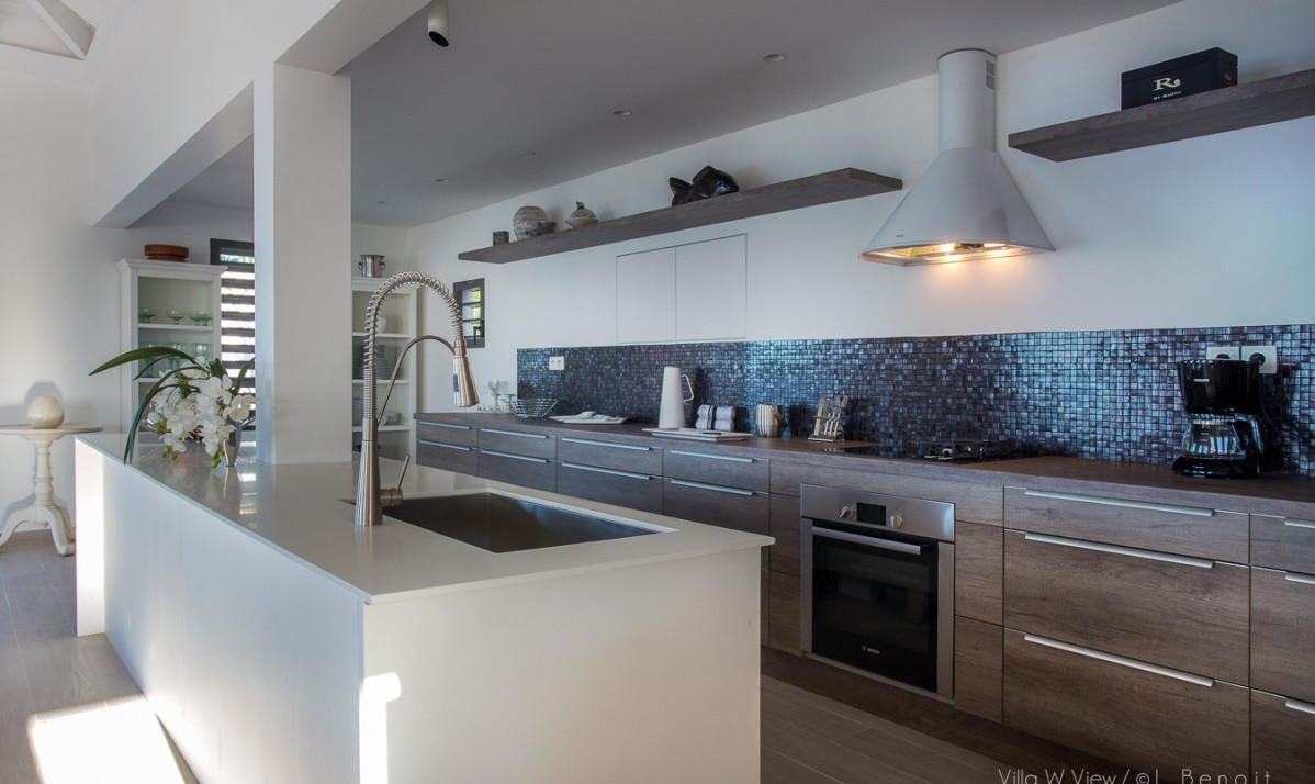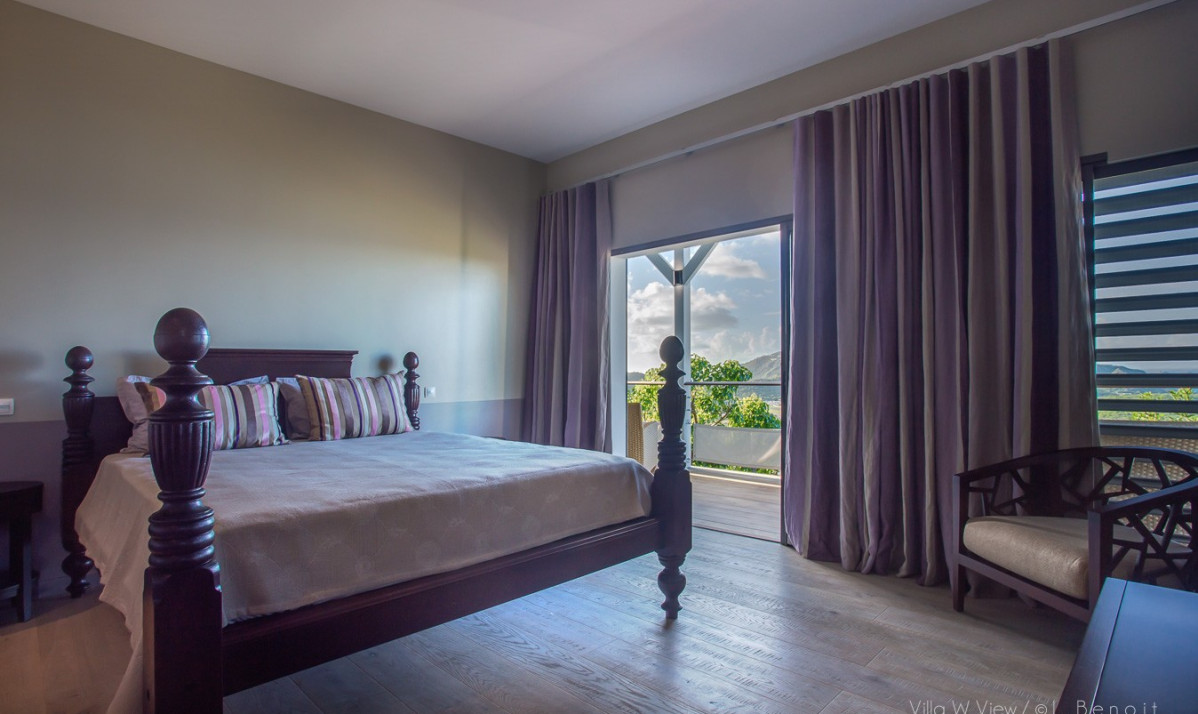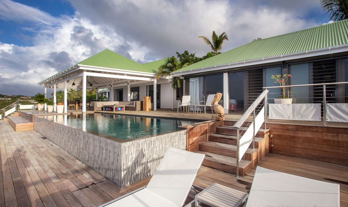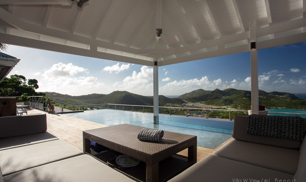 While unmistakably Caribbean, Villa W View has some differences that make it beautifully unique. The green roofs of this vacation rental villa echo the lush tropical plants surrounding it, and the 32ft infinity pool is covered in one corner by the massive terrace roof, unique because of its high, vaulted ceilings and because one of the roof’s supporting columns seemingly floats in the pool! The huge covered terrace provides so much more living space for guests, including places to sit and relax or dine alfresco while pondering the wonderful views, and the sun decks are set over several levels to give the sense of even more space.