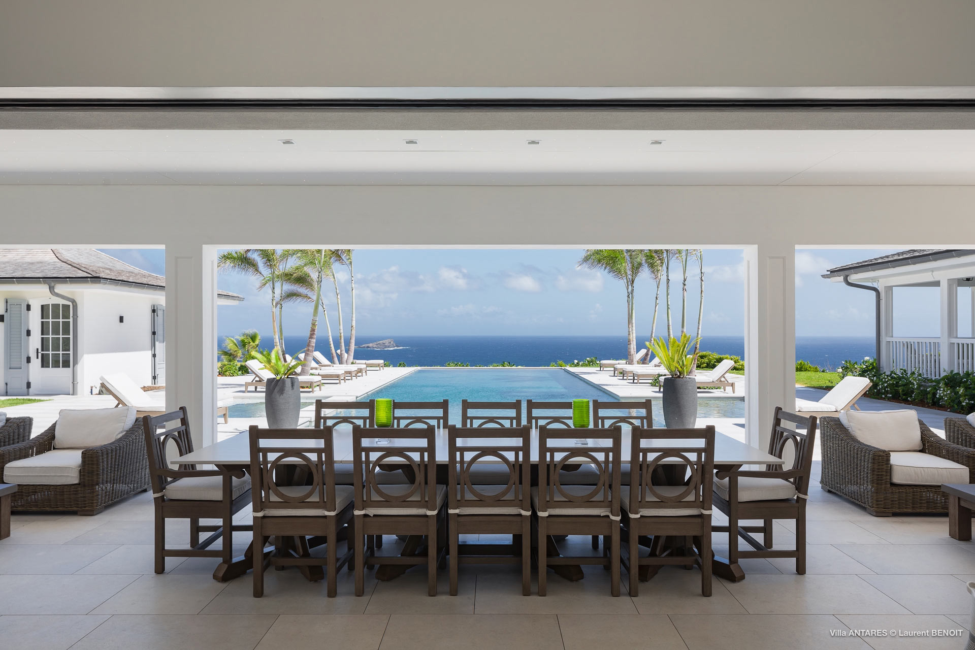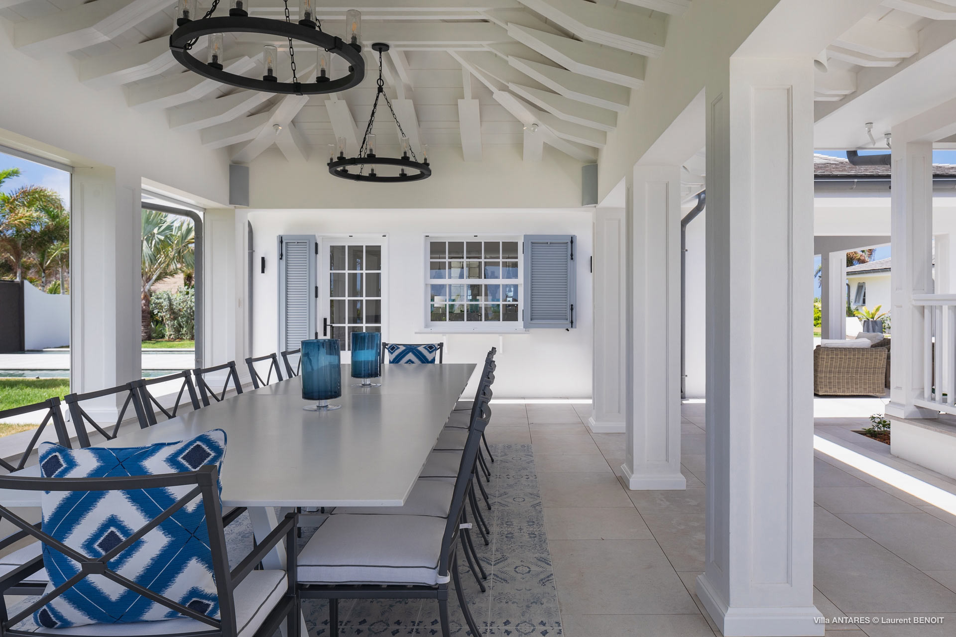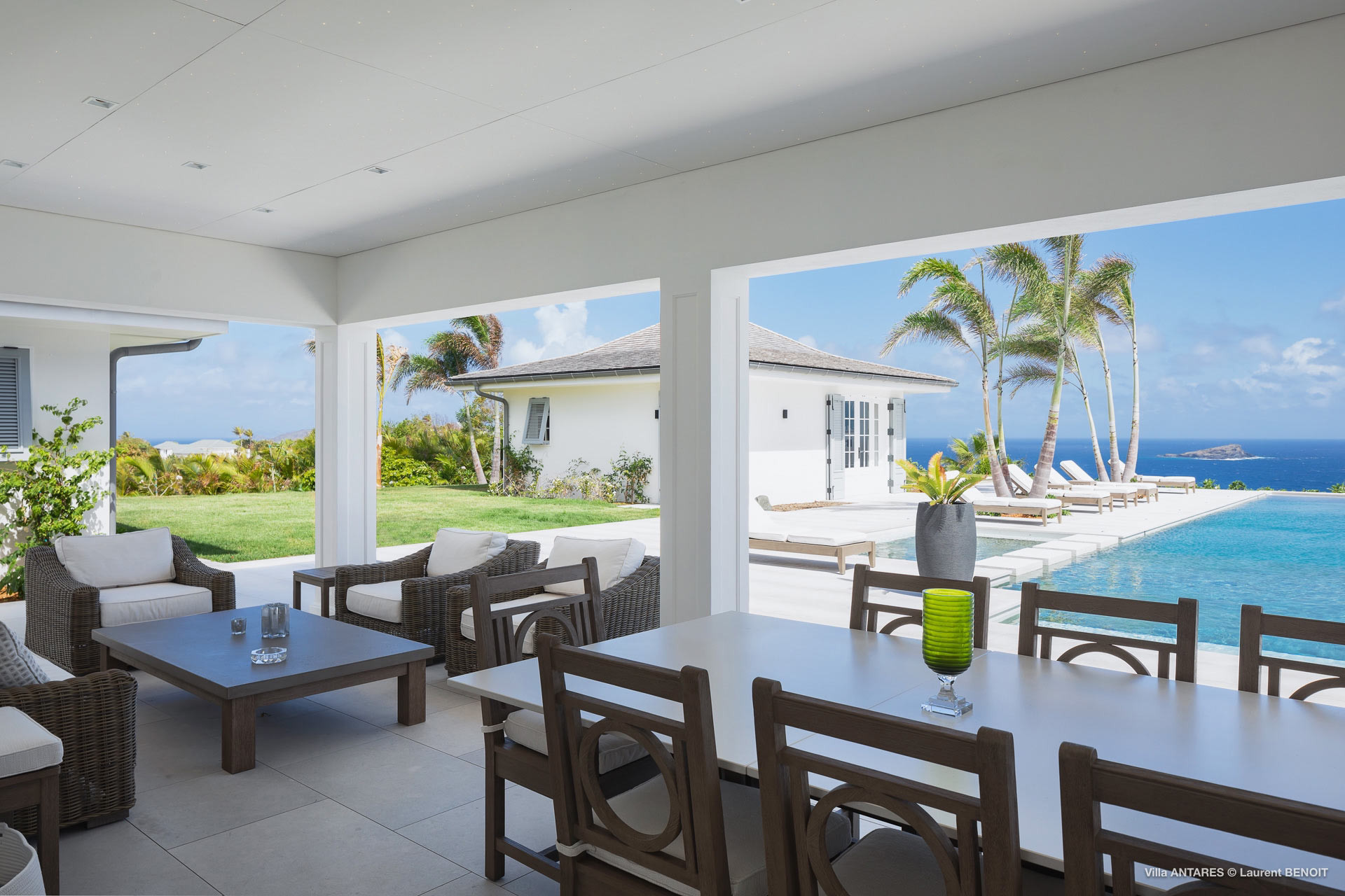 Villa Antares exterior radiates timeless elegance and grandeur. With its colonial-style architecture, the villa boasts a substantial size and a pristine white façade that embodies sophistication. As you step onto the expansive terrace, your attention is immediately captivated by the magnificent swimming pool, its crystal-clear waters glistening like a serene ocean. Accompanied by comfortable sun loungers on both sides, the pool stand's as one of the largest on the island. The villa offers two distinct dining areas, one is conveniently situated just outside, adjacent to the kitchen, providing a sheltered terrace for your dining needs. The other dining area is located separately beneath a covered gazebo, thoughtfully designed for delightful BBQ gatherings. Enjoy many outside sitting areas to experience the sophistication of the villa and the view.