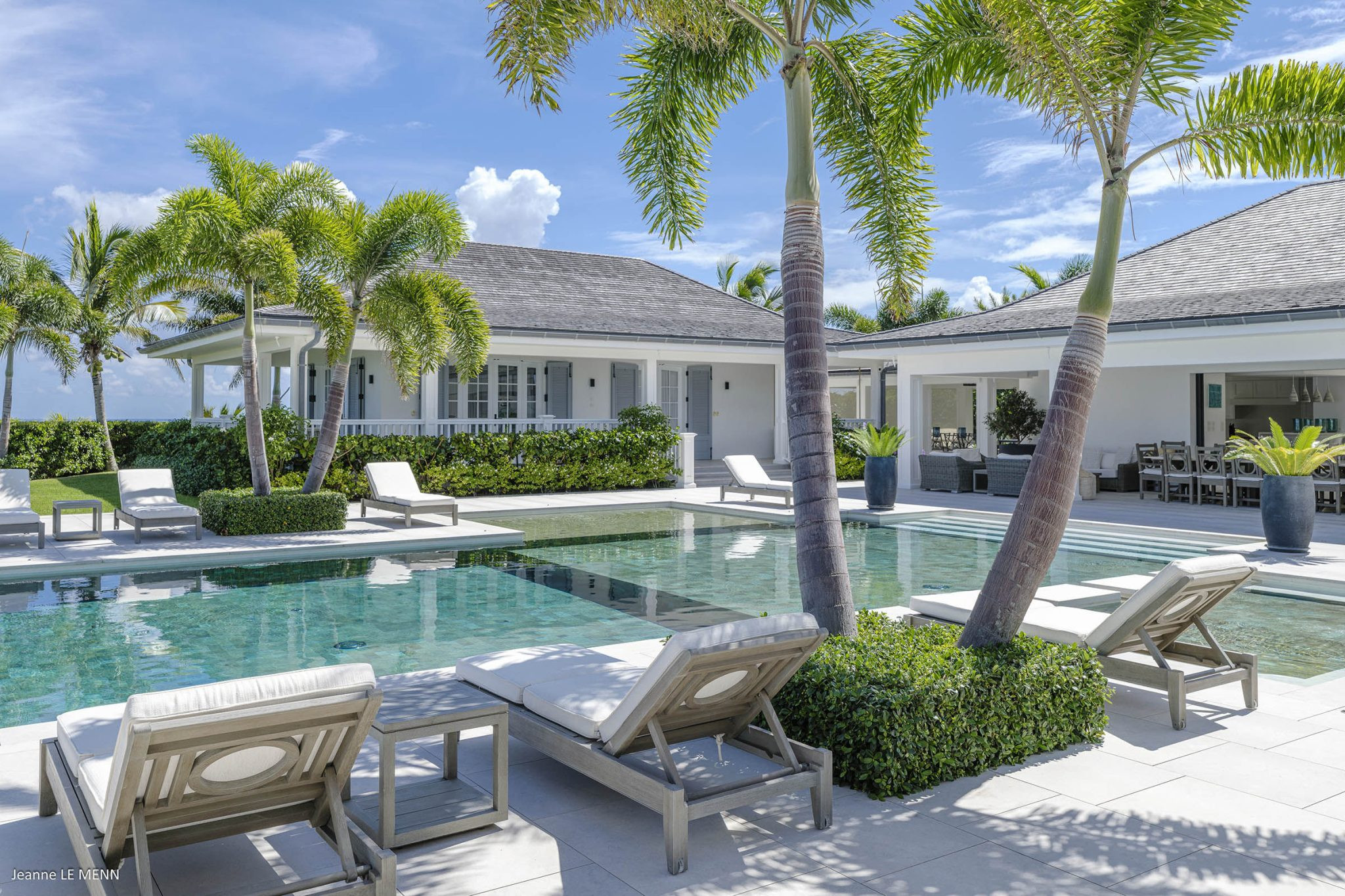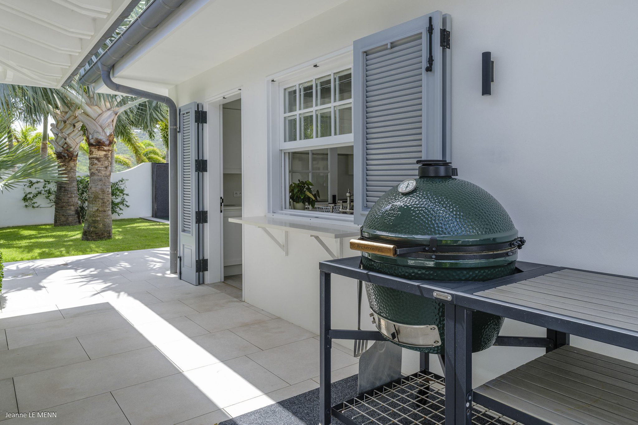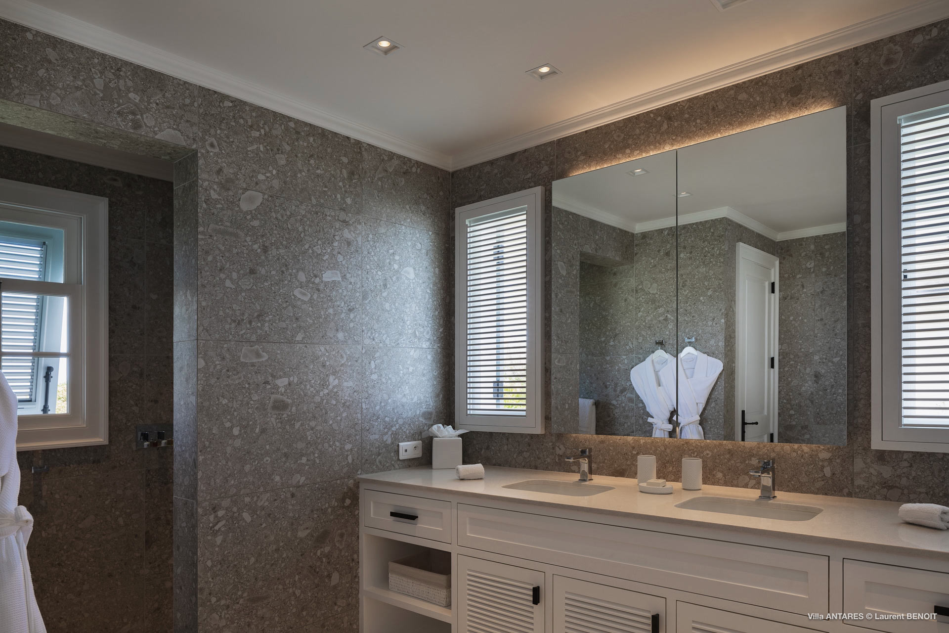 Villa Antares exterior radiates timeless elegance and grandeur. With its colonial-style architecture, the villa boasts a substantial size and a pristine white façade that embodies sophistication. As you step onto the expansive terrace, your attention is immediately captivated by the magnificent swimming pool, its crystal-clear waters glistening like a serene ocean. Accompanied by comfortable sun loungers on both sides, the pool stand's as one of the largest on the island. The villa offers two distinct dining areas, one is conveniently situated just outside, adjacent to the kitchen, providing a sheltered terrace for your dining needs. The other dining area is located separately beneath a covered gazebo, thoughtfully designed for delightful BBQ gatherings. Enjoy many outside sitting areas to experience the sophistication of the villa and the view.