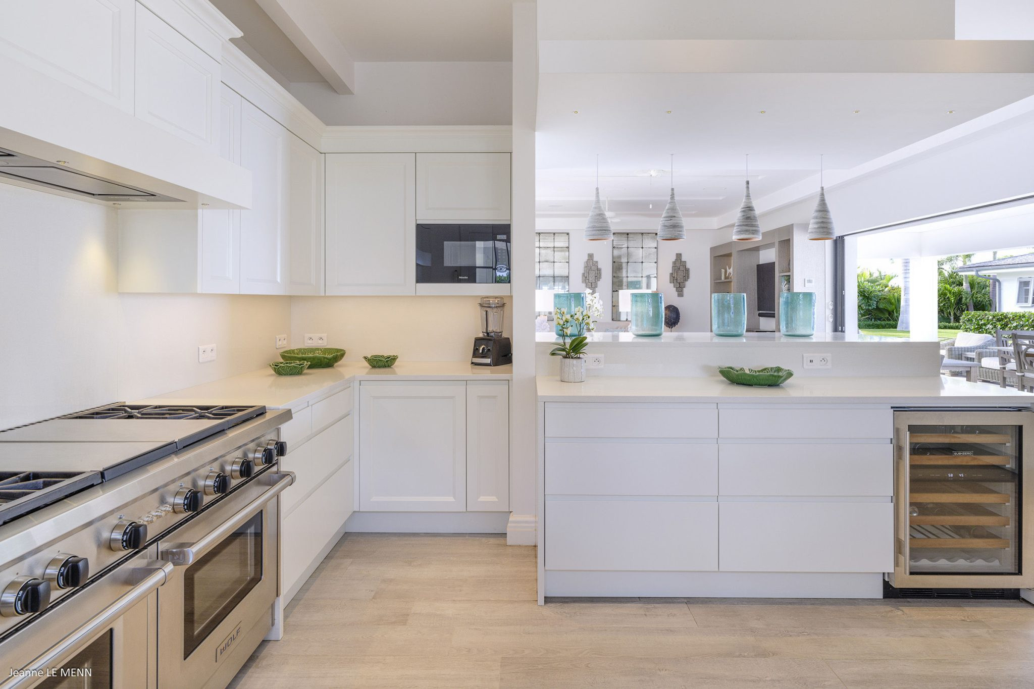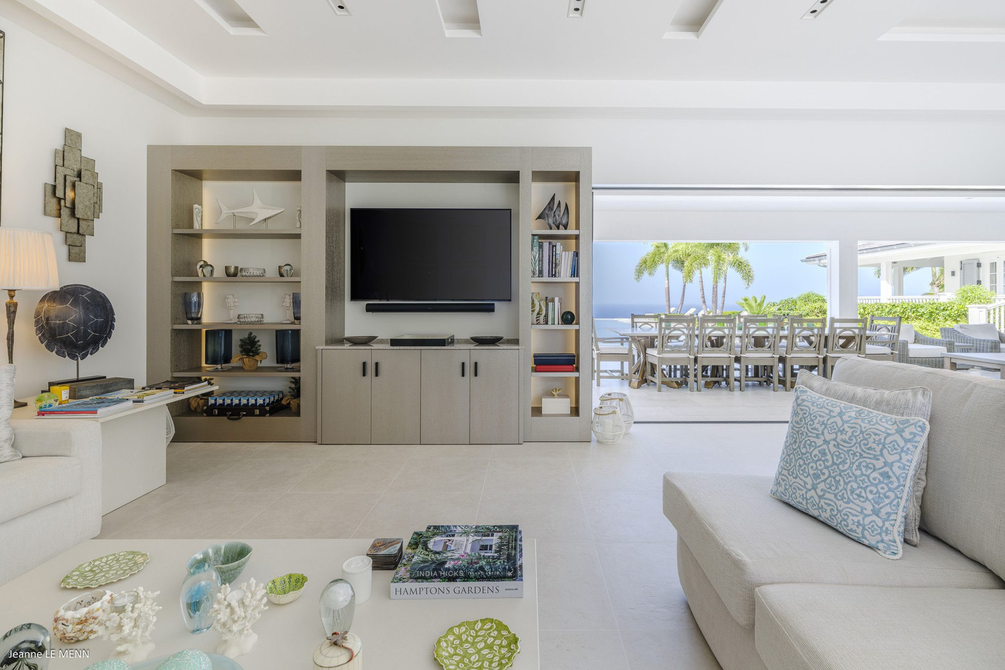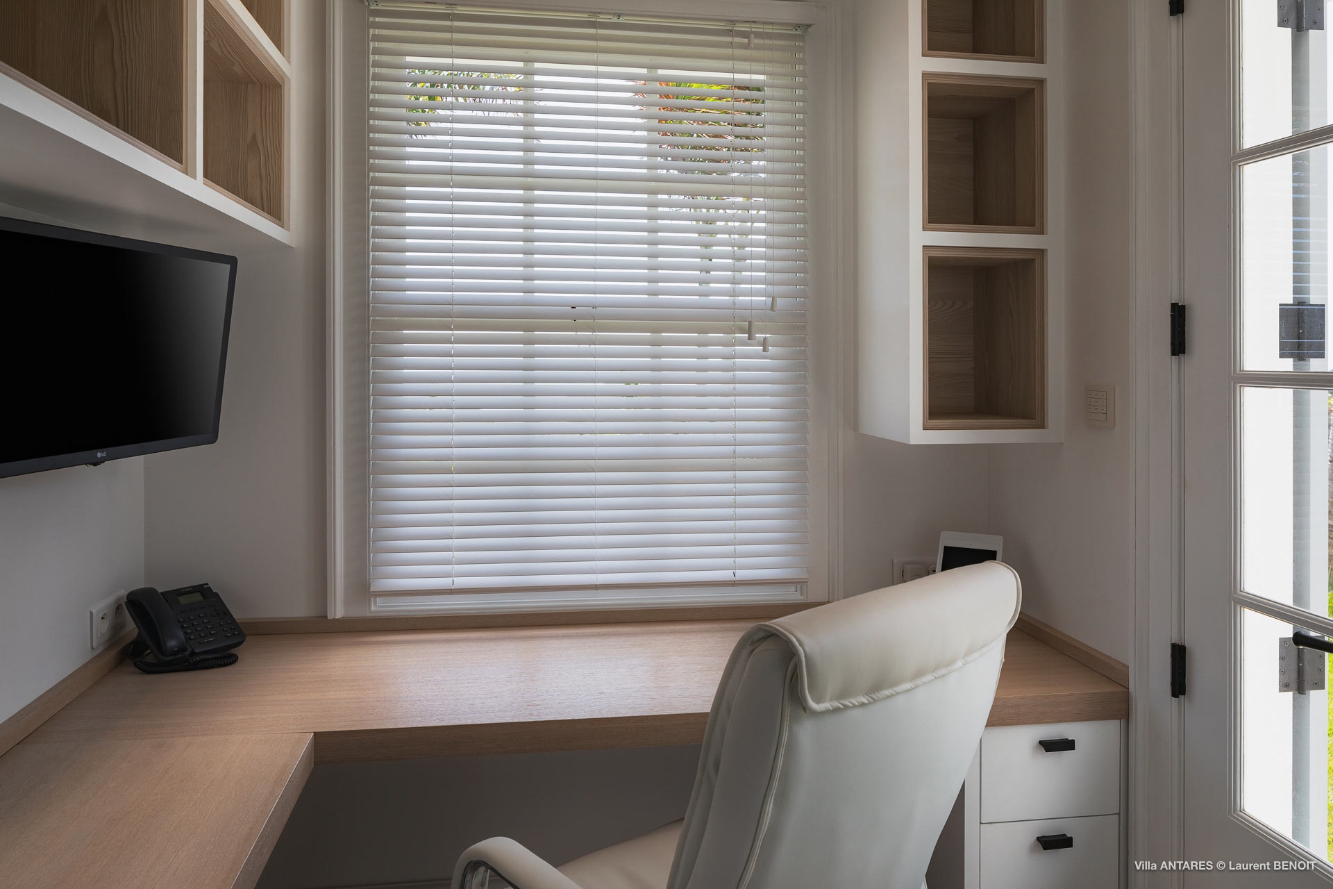 The villa's interior is a harmonious blend of privacy and practicality. The chef's kitchen, featuring a breakfast bar with stylish high chairs, offers an ideal setting for both culinary endeavors and casual dining. This space flows seamlessly into the inviting living room, which connects to the outdoor dining area, ensuring a smooth transition between indoor and outdoor entertaining. For guests seeking a personal space to attend to correspondence or work while on vacation, an office area has been thoughtfully integrated, providing a peaceful retreat within the villa.
