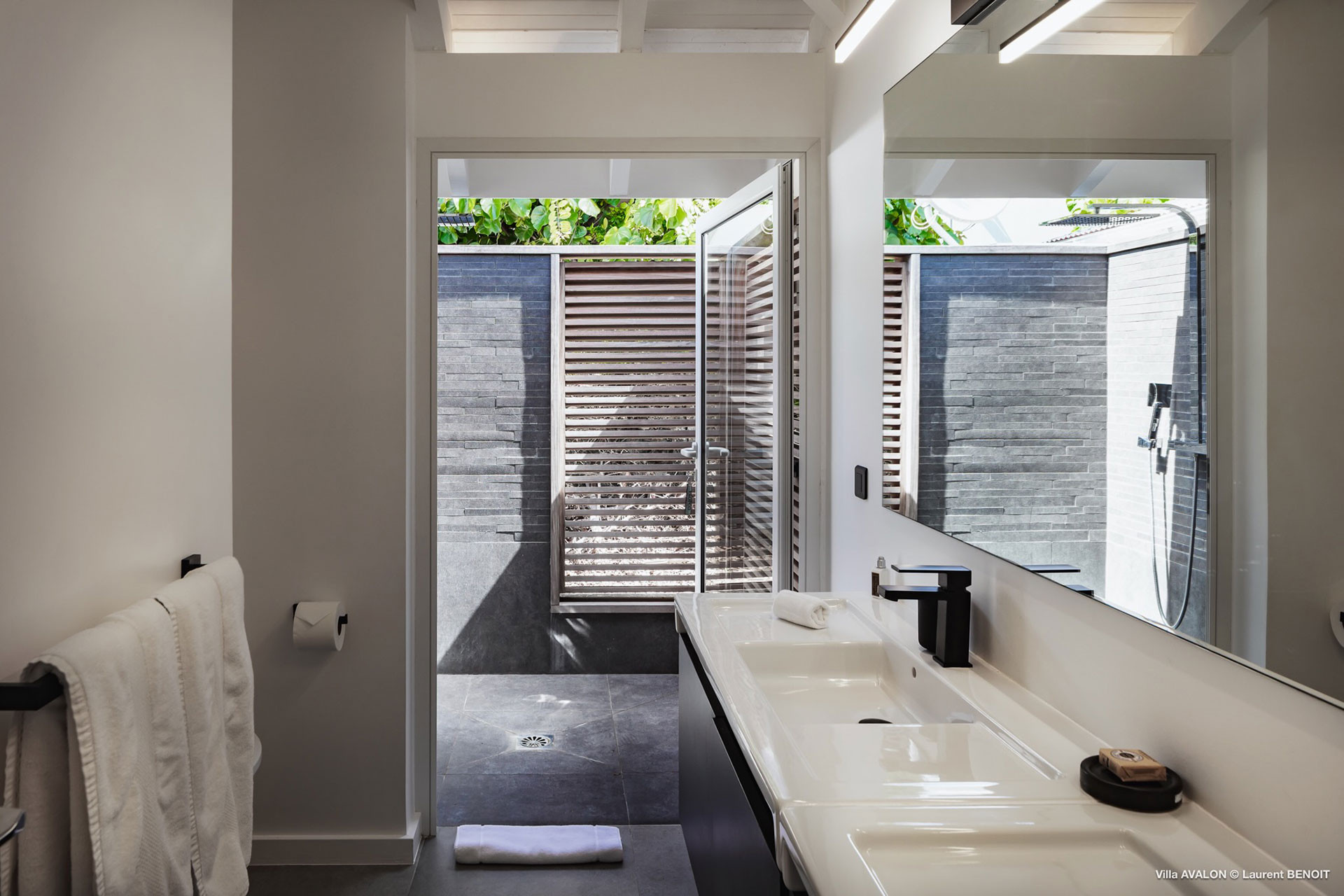 The exterior of Villa Avalon St Barts is a testament to the island's natural beauty, seamlessly blending the tropical landscape. The sprawling garden invites guests to stroll through an Eden-like setting, culminating in Gouverneur beach that promises the softest sands and a minimum of intrusions. The property features a large, infinity-edge pool that mirrors the azure hues of the ocean, offering a refreshing escape under the Caribbean sun. With weekly garden and pool maintenance, the outdoor living space remains an immaculate sanctuary for relaxation or entertainment.