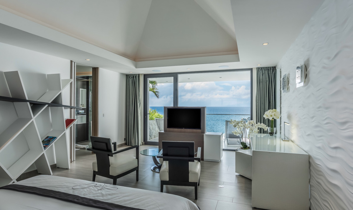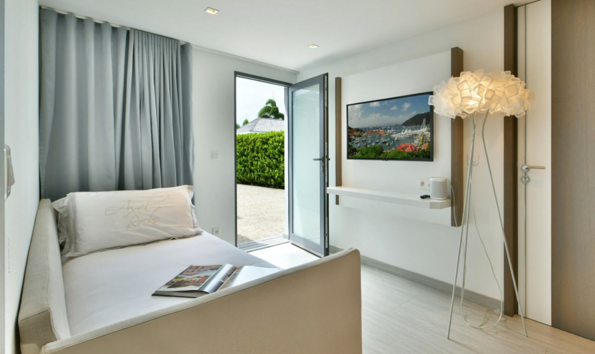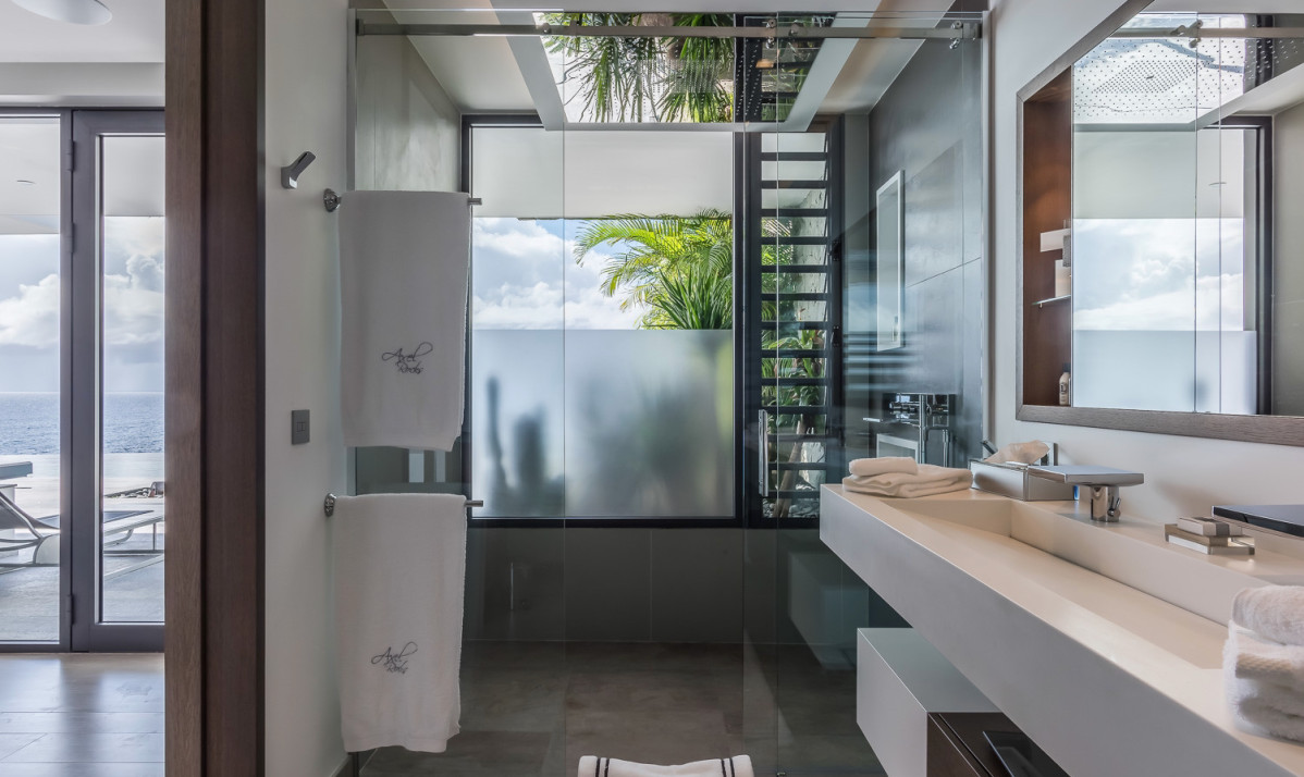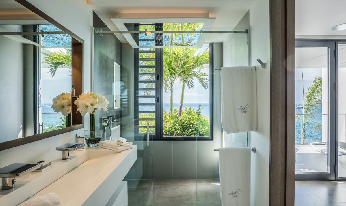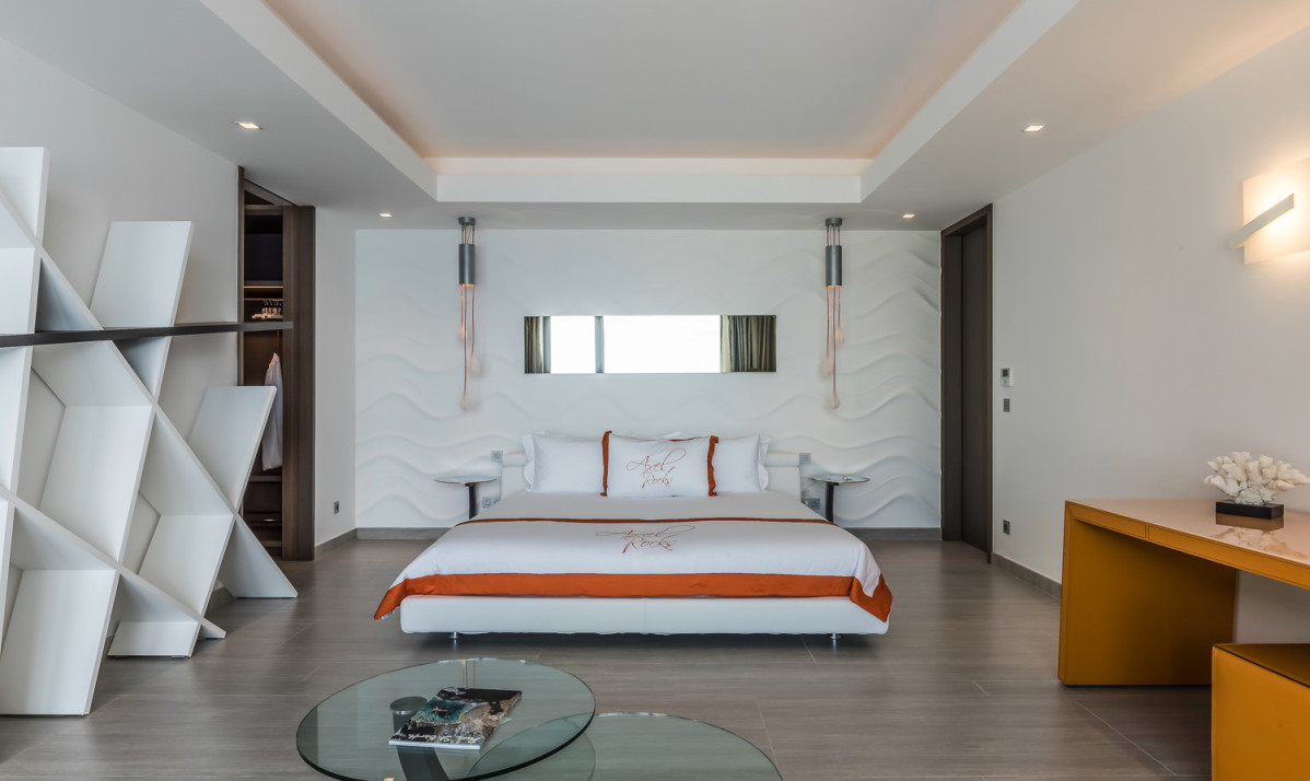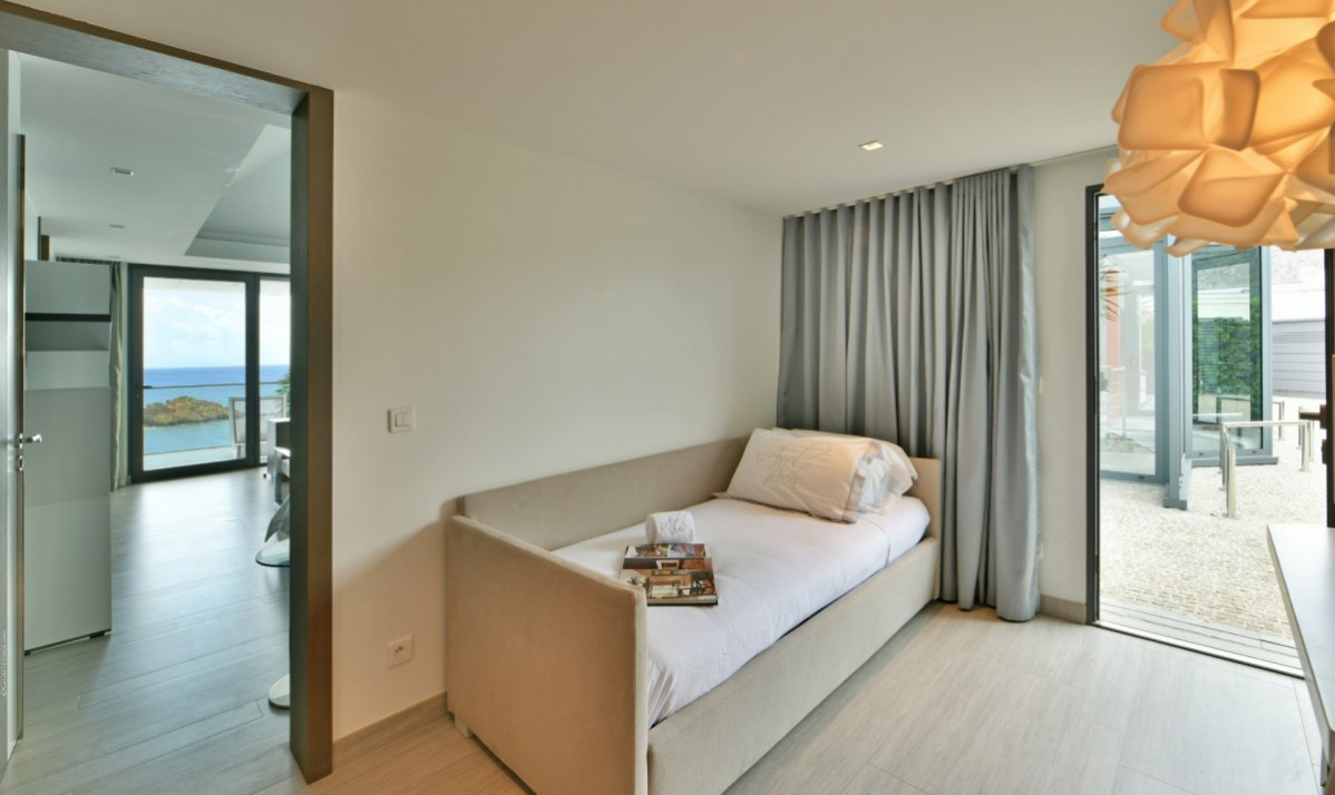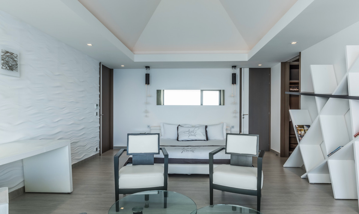 Sprawled across two floors, the grandeur of Villa Axel Rocks St Barts is unmatched. Upstairs three elegant suites offer deliciously sleek en suite baths, with private terraces overlooking the majestic vista. The fourth suite is found on the main floor, opening up onto the pool and terrace. The fifth bedroom is smaller with a single bed designed for a nanny, cook or personal security.