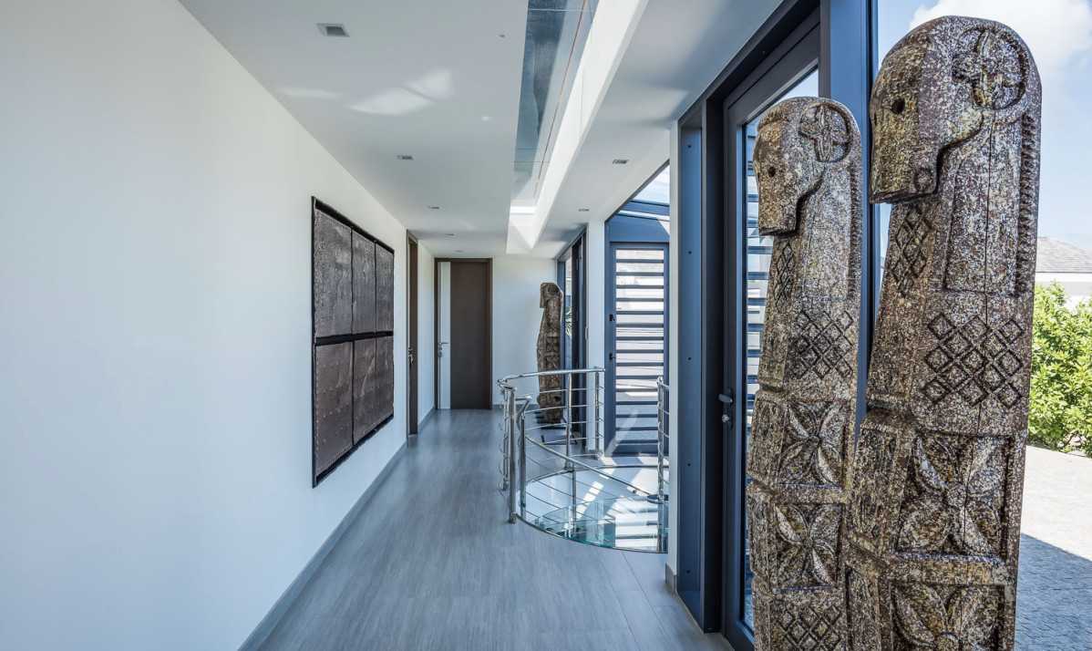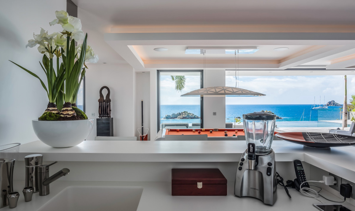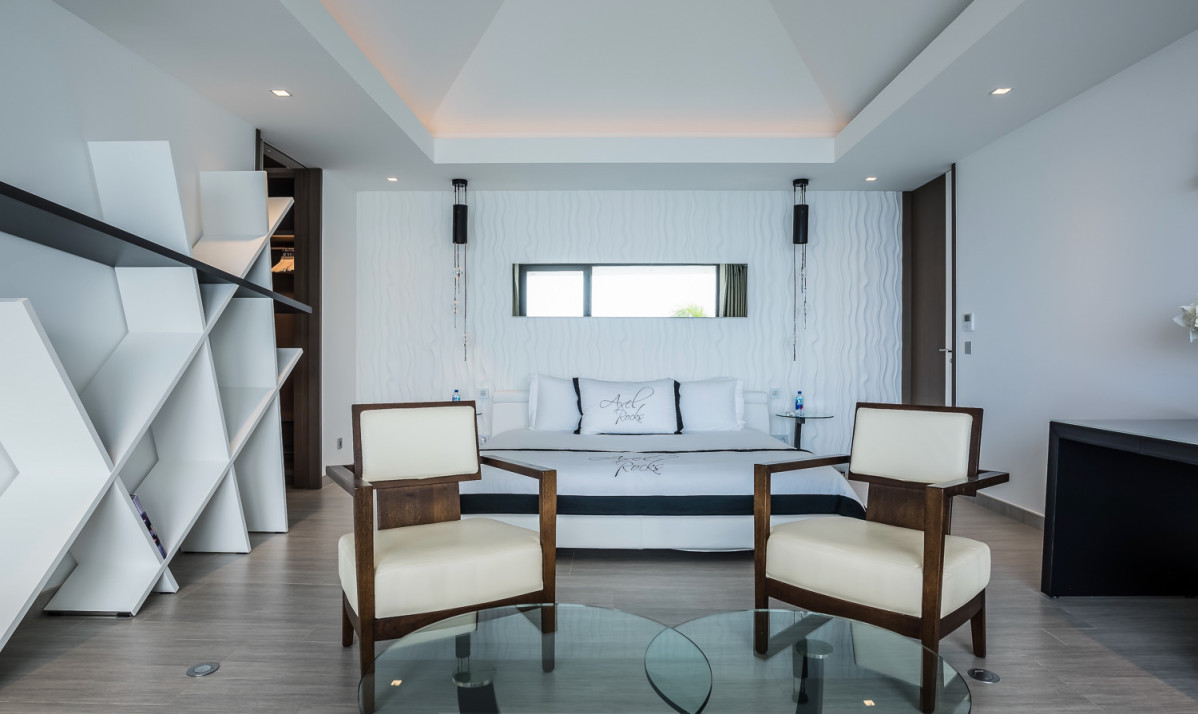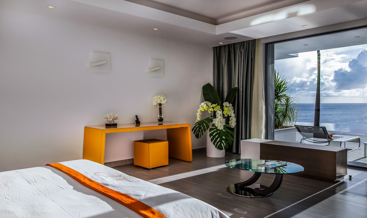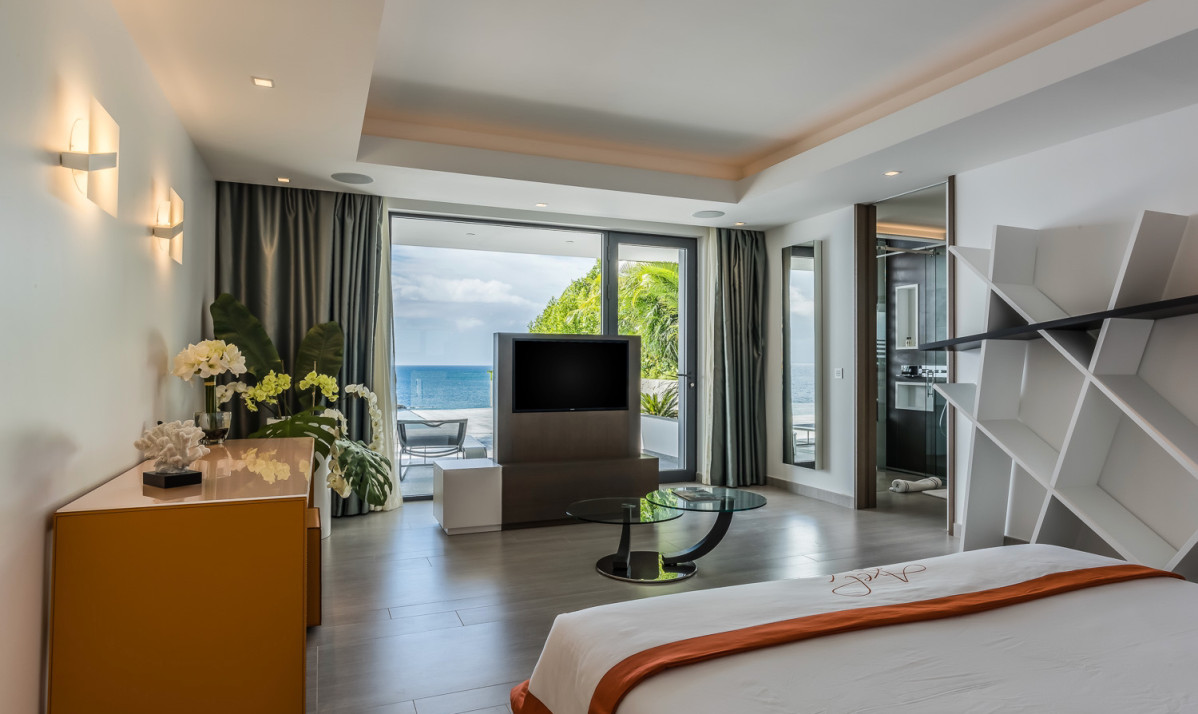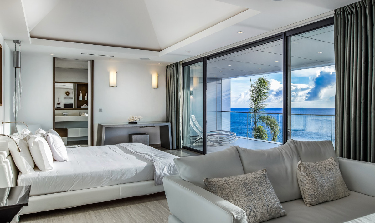 Sprawled across two floors, the grandeur of Villa Axel Rocks St Barts is unmatched. Upstairs three elegant suites offer deliciously sleek en suite baths, with private terraces overlooking the majestic vista. The fourth suite is found on the main floor, opening up onto the pool and terrace. The fifth bedroom is smaller with a single bed designed for a nanny, cook or personal security.