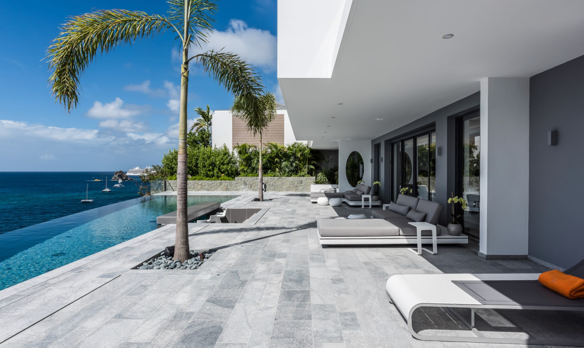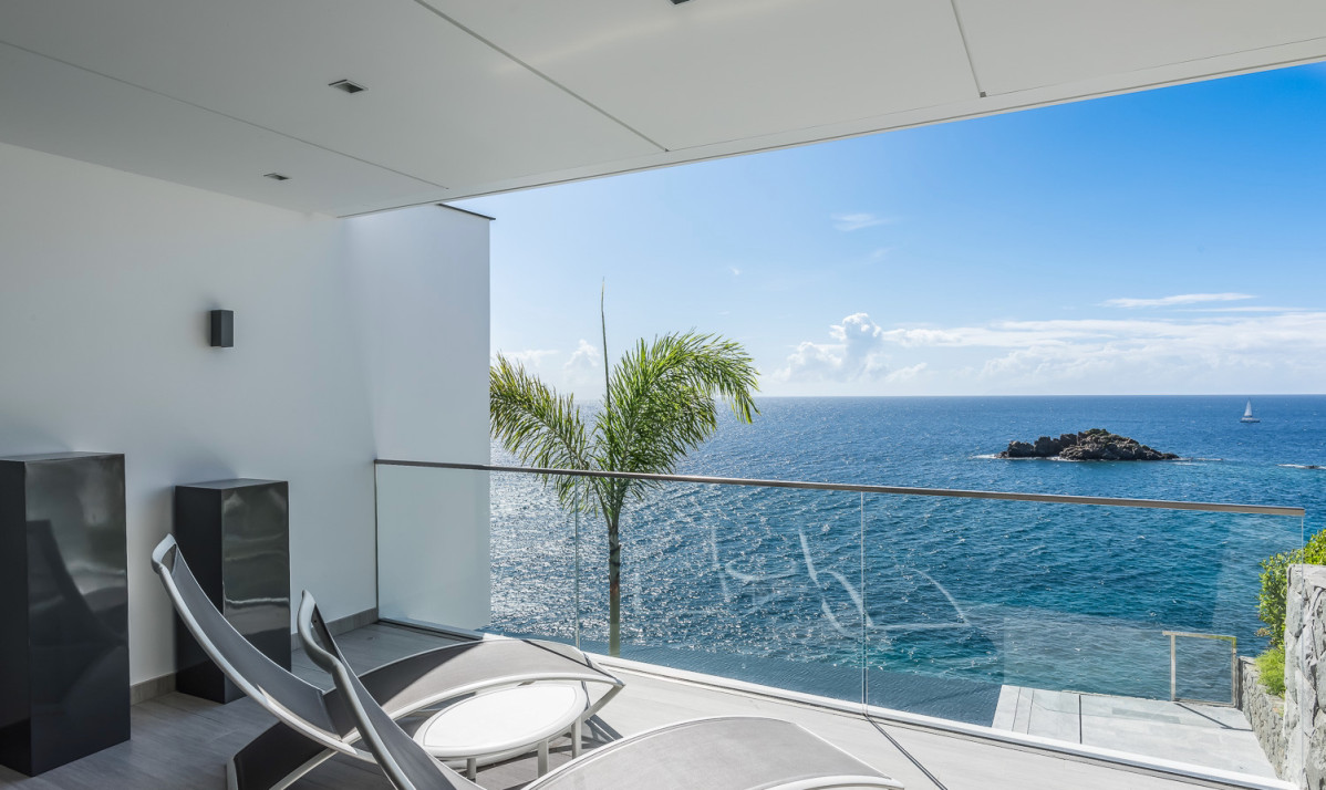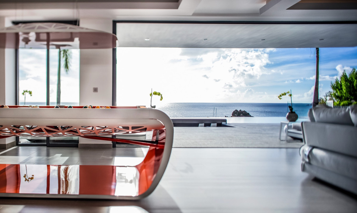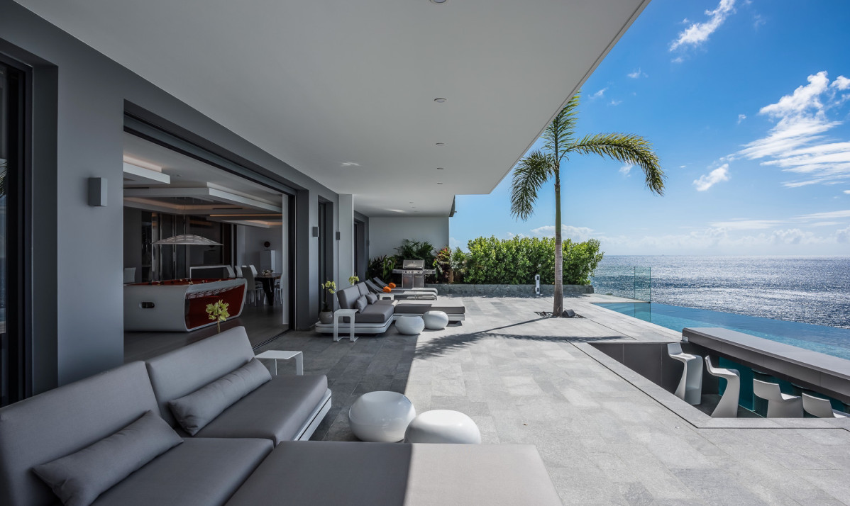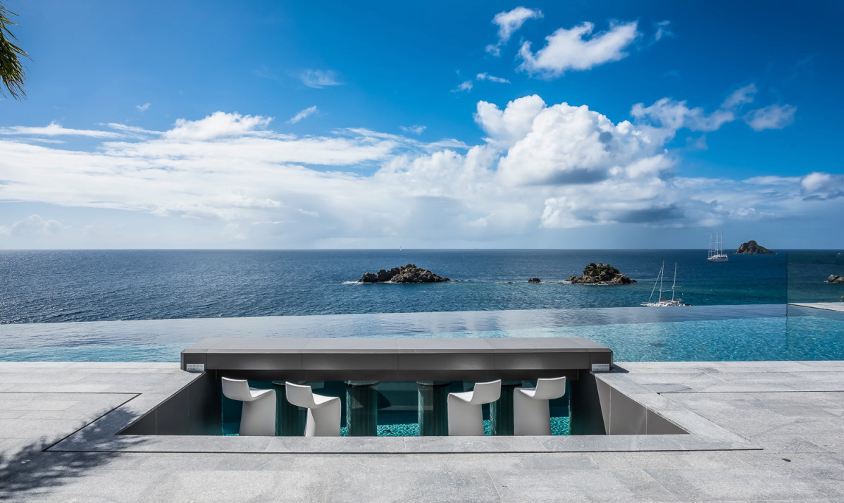 Most striking at Villa Axel Rocks St Barts perhaps is the flawless westward expanse of deep blue sea, flecked with savage islets and the sensual silhouette of the neighboring isle of Saba. Elegant outdoor lounge spaces surround a massive infinity pool with swim-up bar, making the absolute most of the stunning panorama.