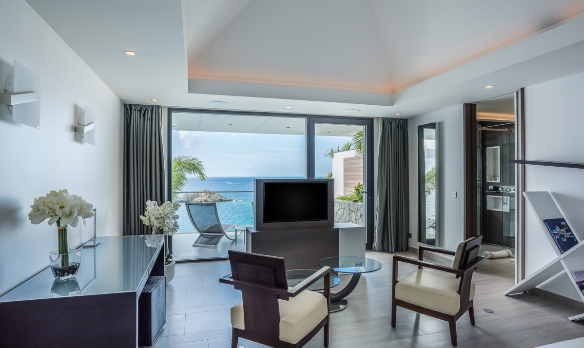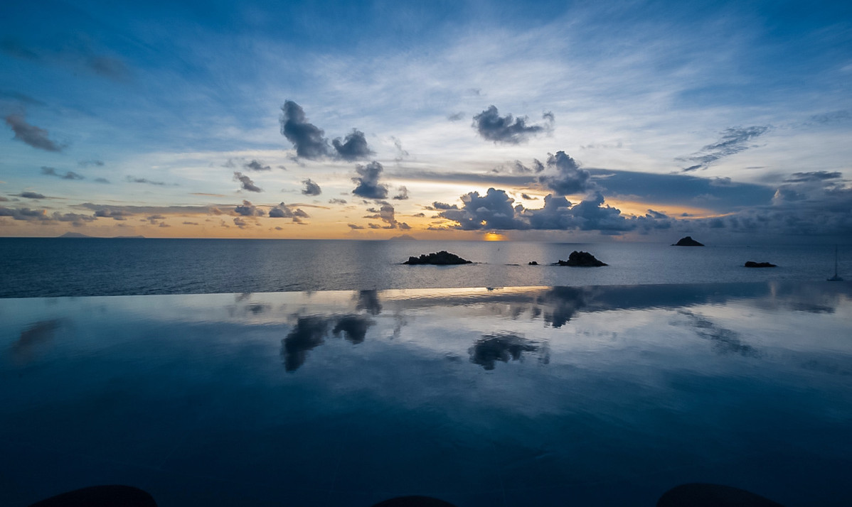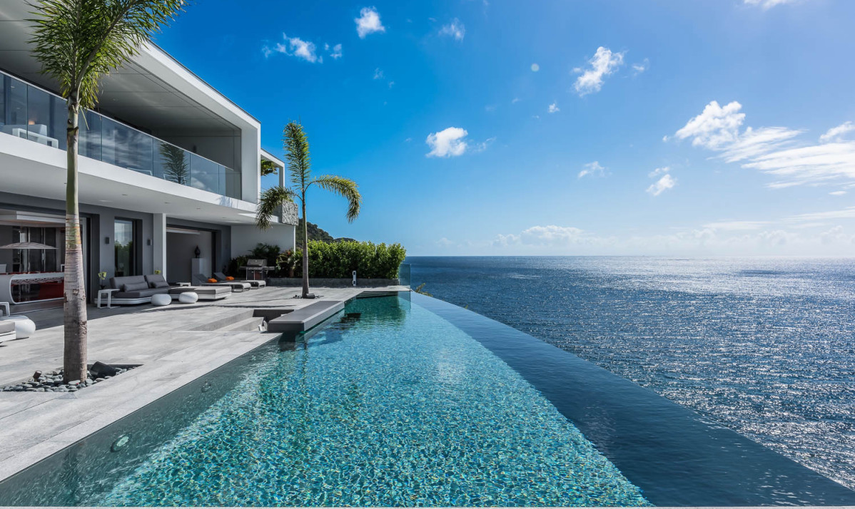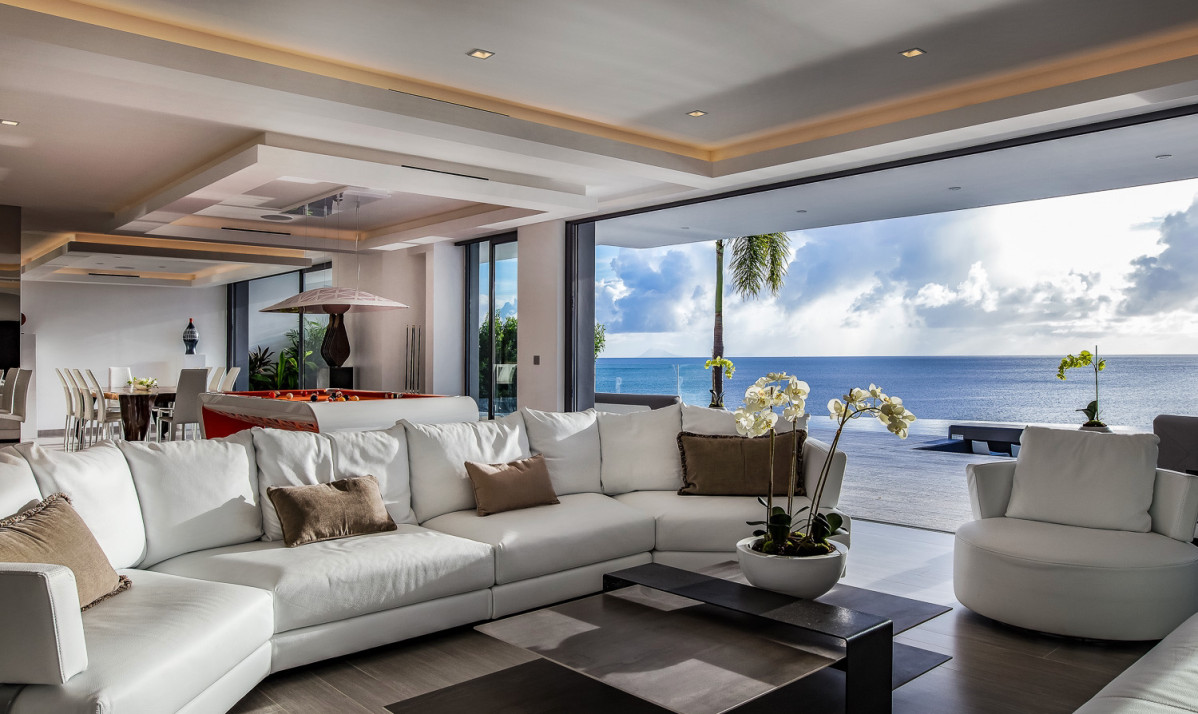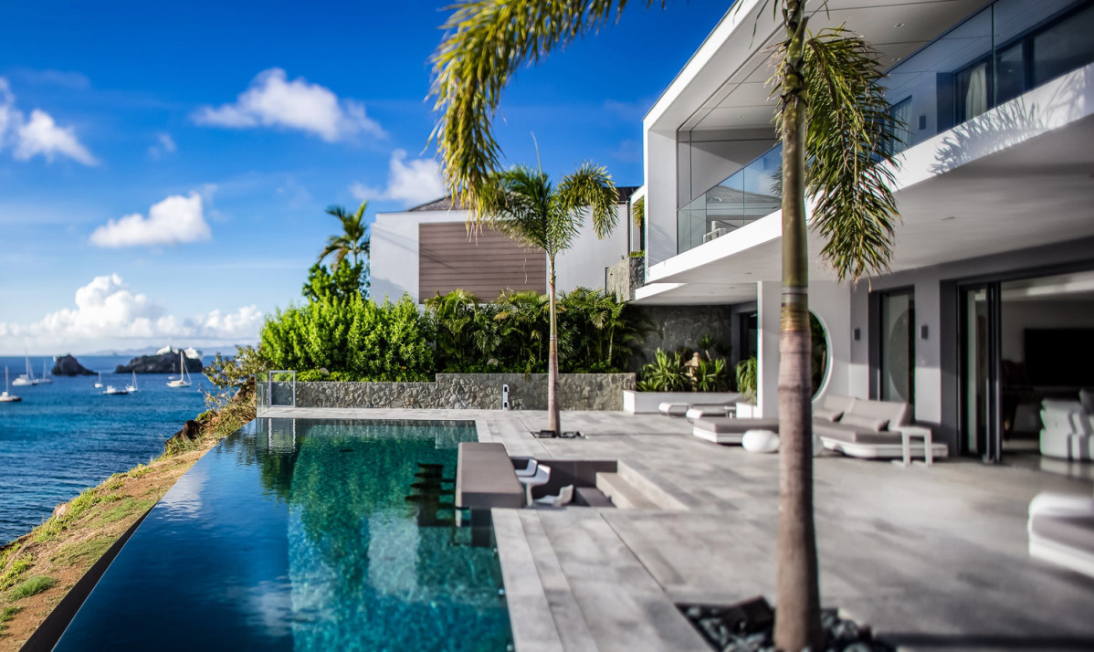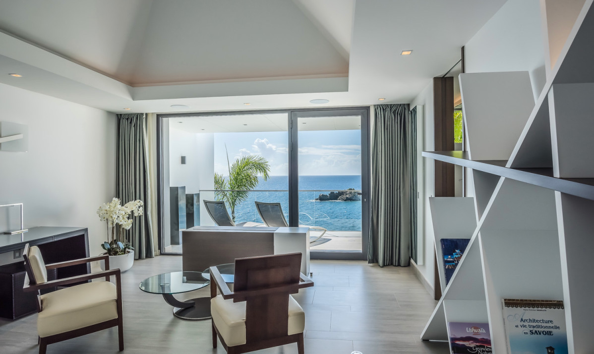 Most striking at Villa Axel Rocks St Barts perhaps is the flawless westward expanse of deep blue sea, flecked with savage islets and the sensual silhouette of the neighboring isle of Saba. Elegant outdoor lounge spaces surround a massive infinity pool with swim-up bar, making the absolute most of the stunning panorama.