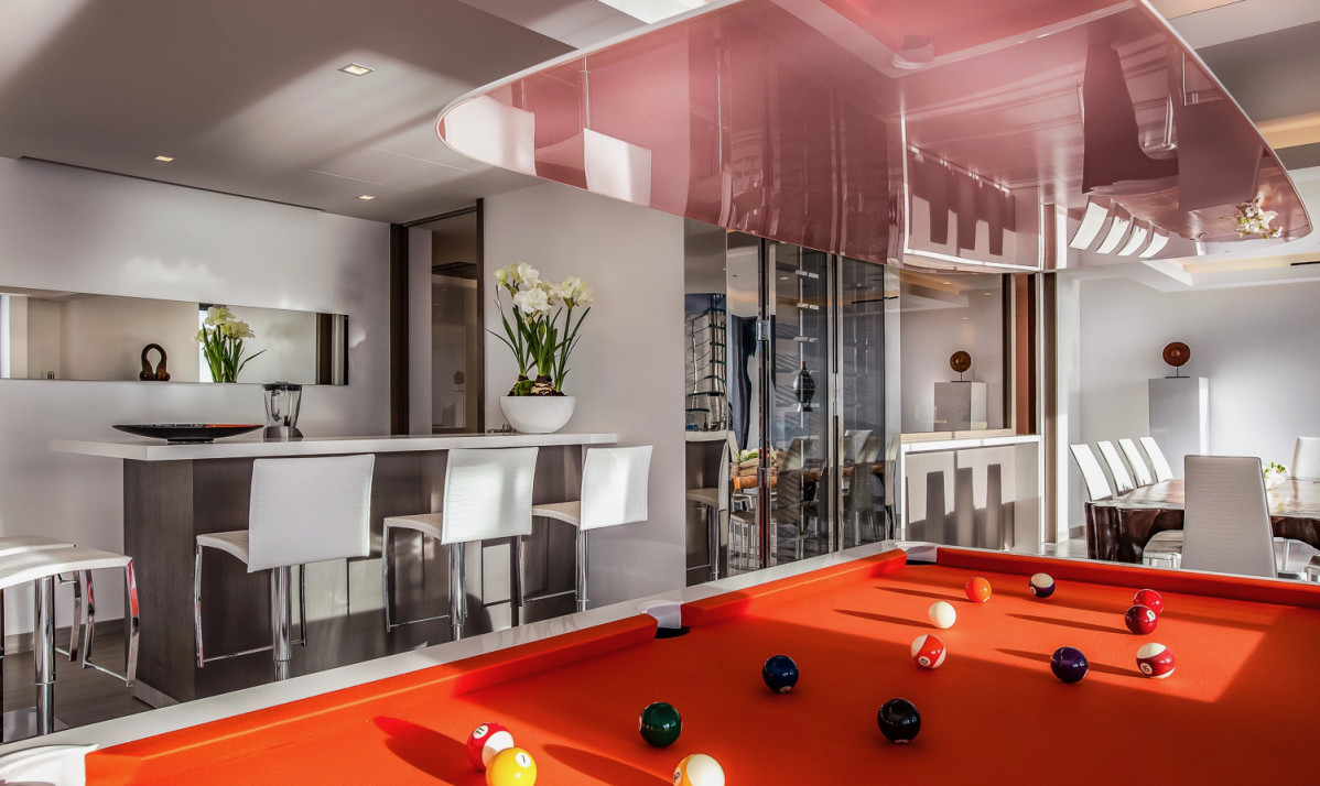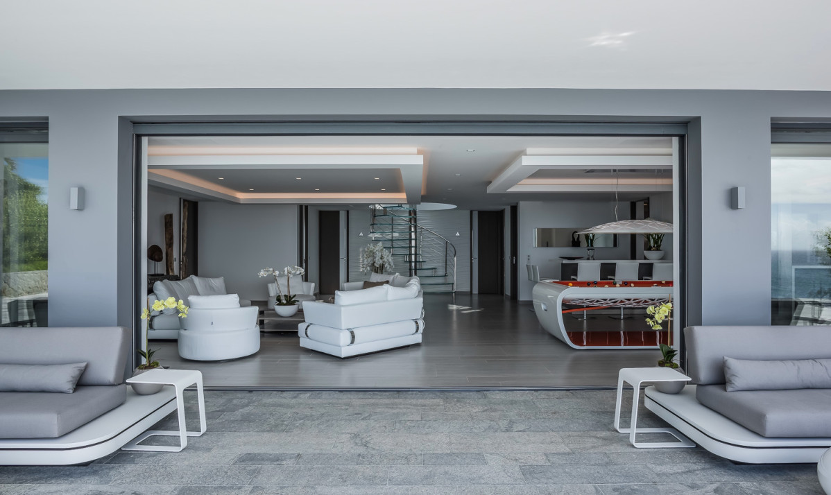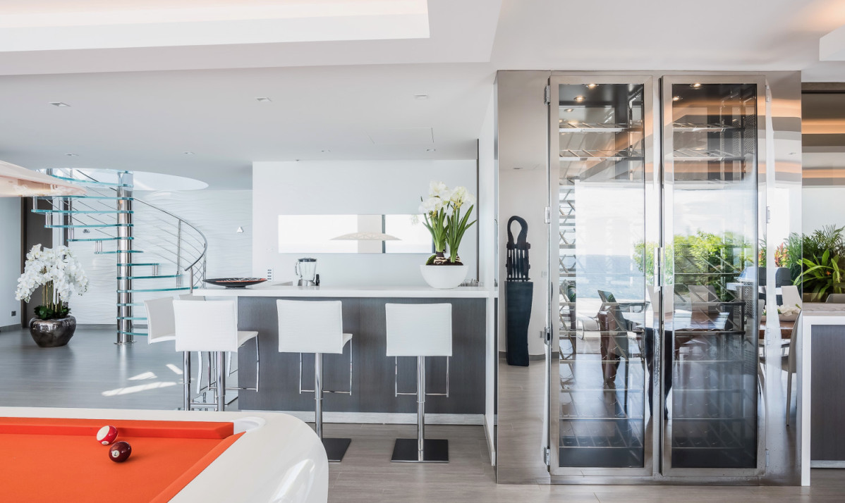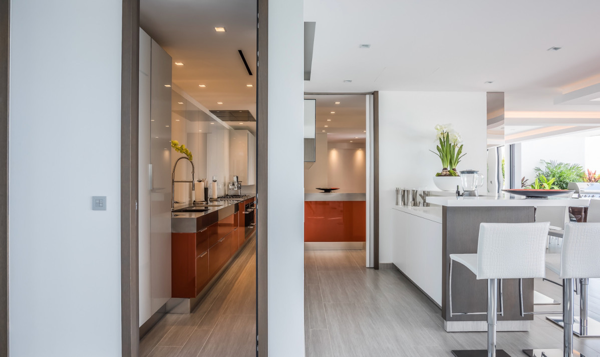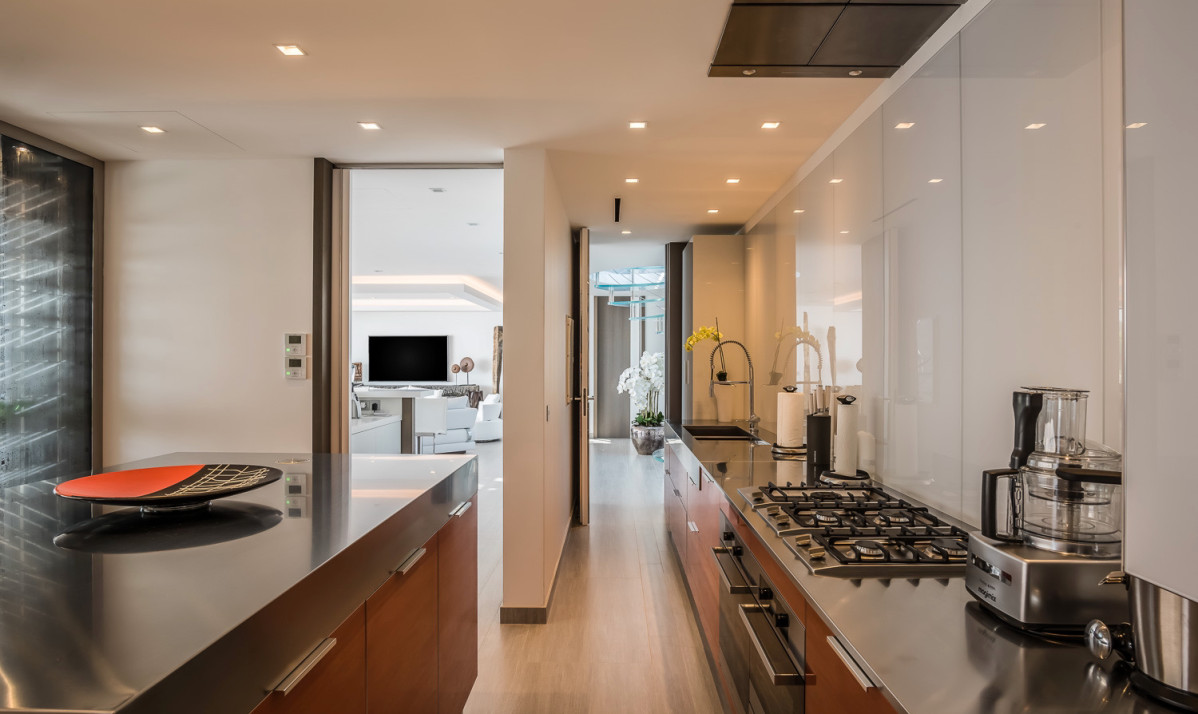 Indoors, impeccable design and inspired creativity abound. A vast central living area provides ample space of convivial gatherings, but if food prep isn’t your bag, an innovative feature of the chef’s kitchen allows for tinted glass walls to keep it all behind closed doors.