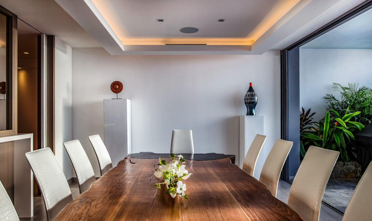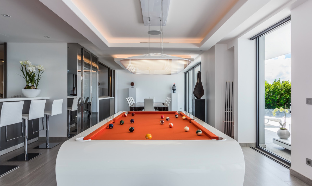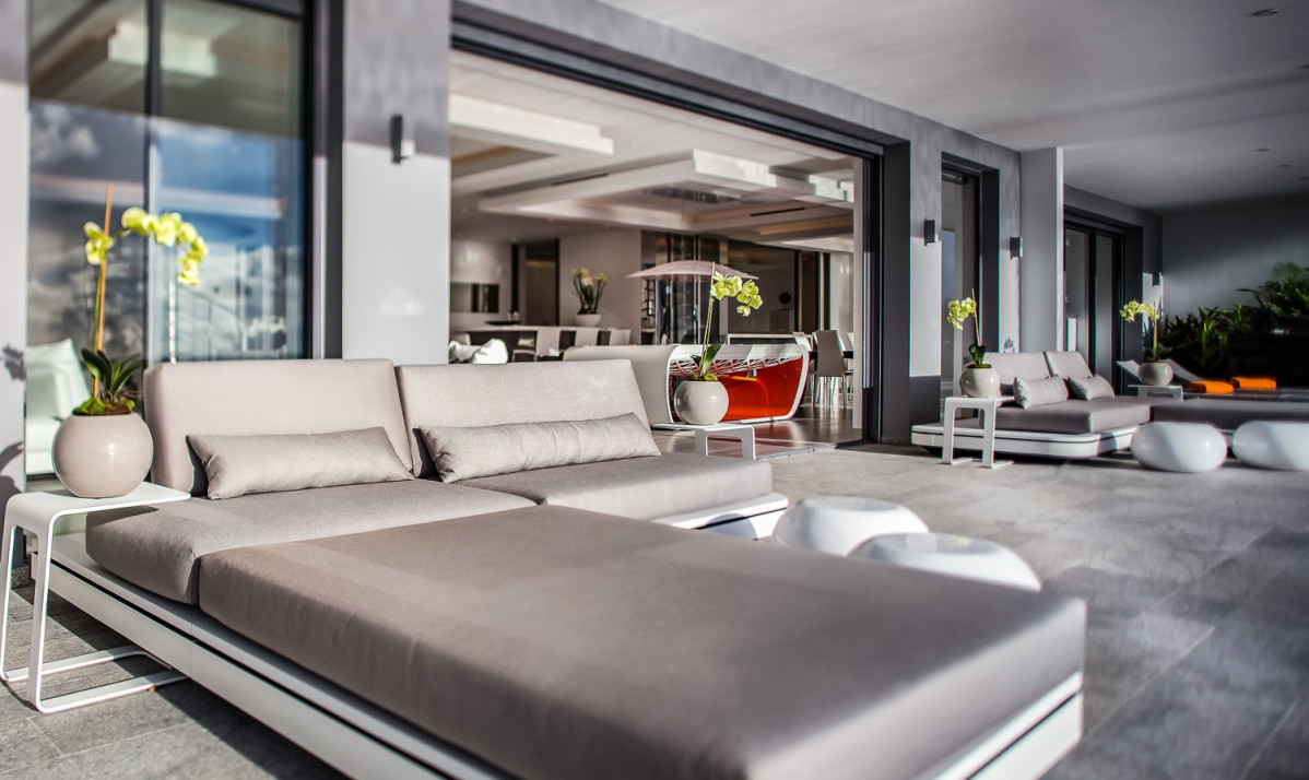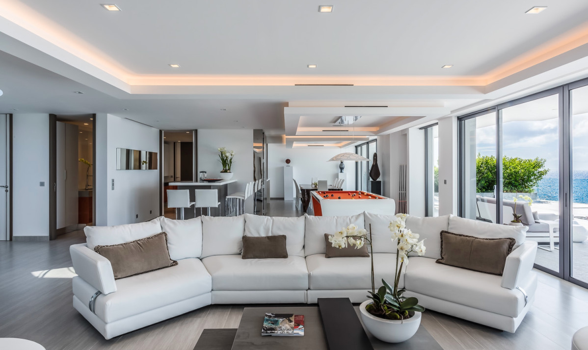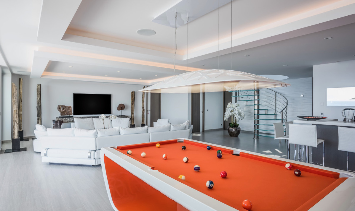 Indoors, impeccable design and inspired creativity abound. A vast central living area provides ample space of convivial gatherings, but if food prep isn’t your bag, an innovative feature of the chef’s kitchen allows for tinted glass walls to keep it all behind closed doors.
