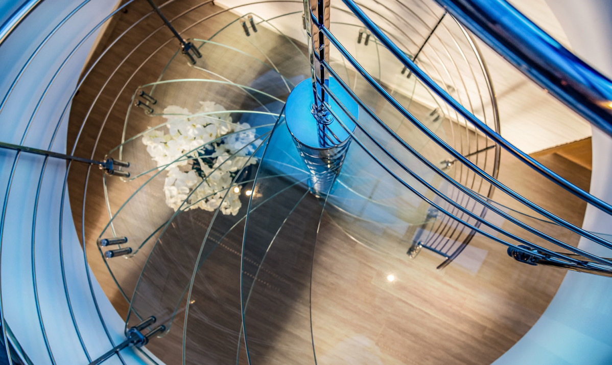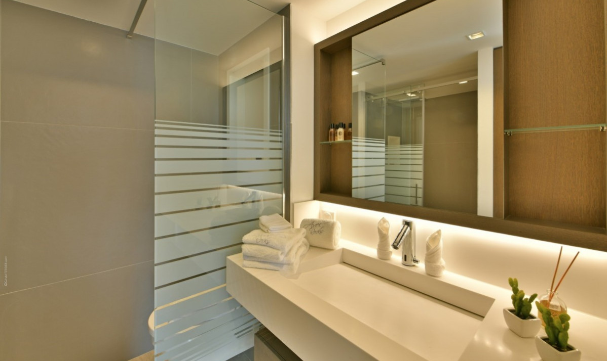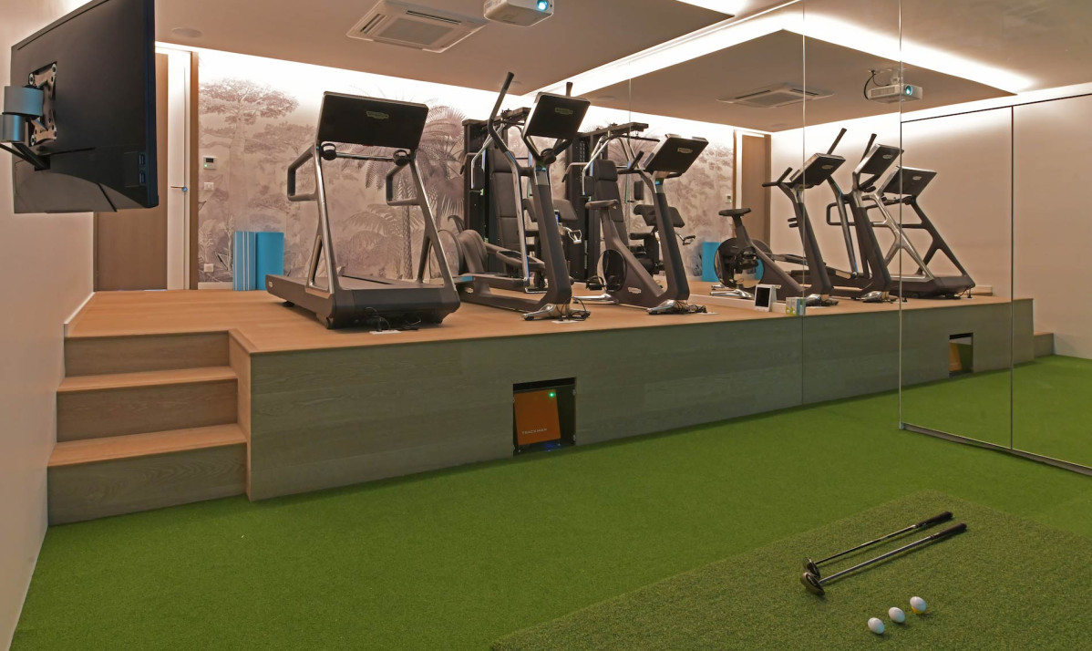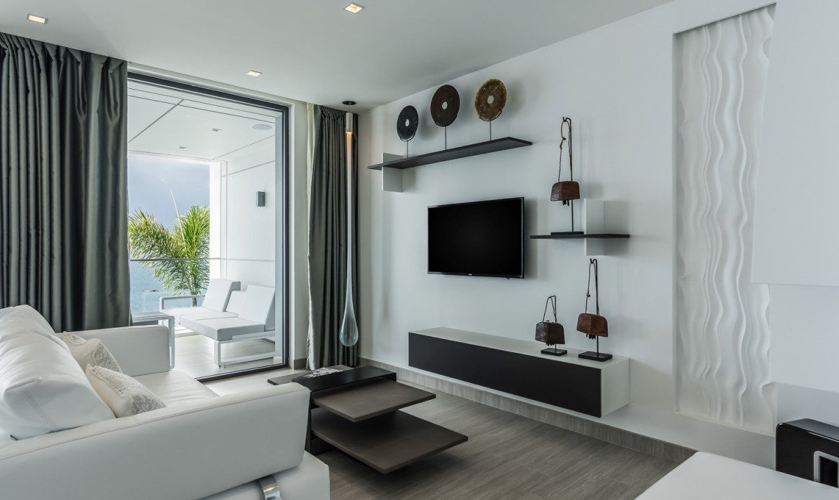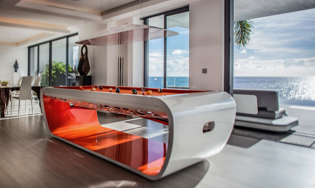 Indoors, impeccable design and inspired creativity abound. A vast central living area provides ample space of convivial gatherings, but if food prep isn’t your bag, an innovative feature of the chef’s kitchen allows for tinted glass walls to keep it all behind closed doors.
