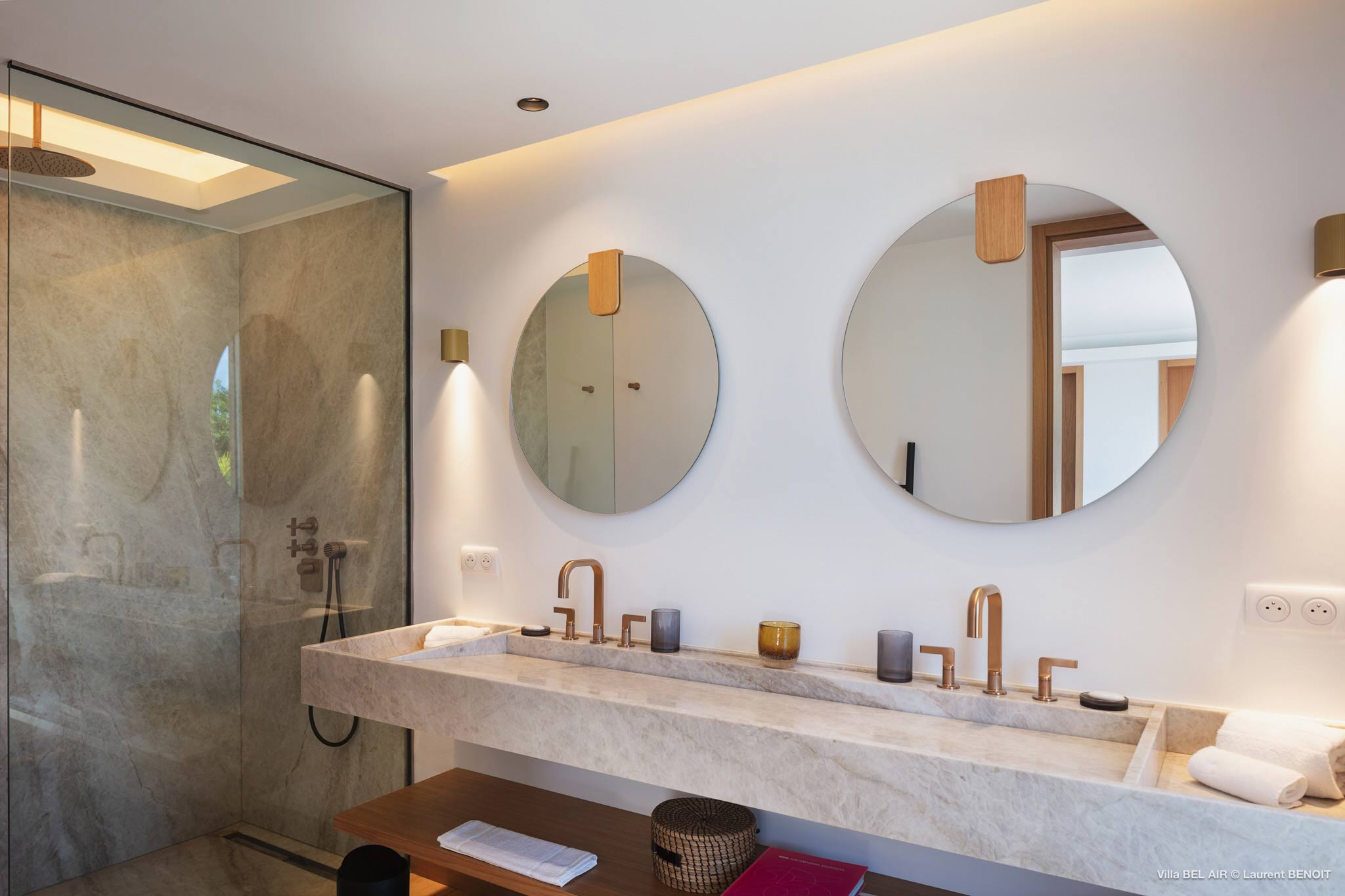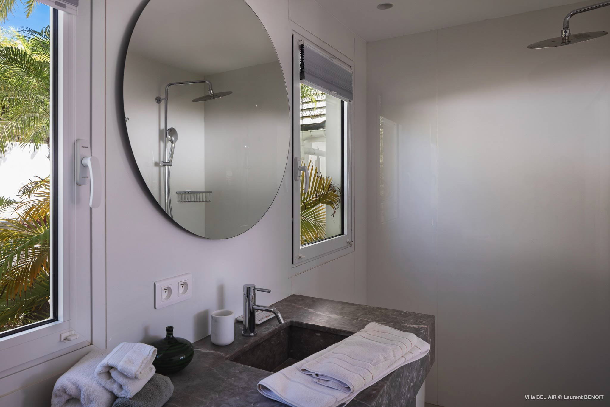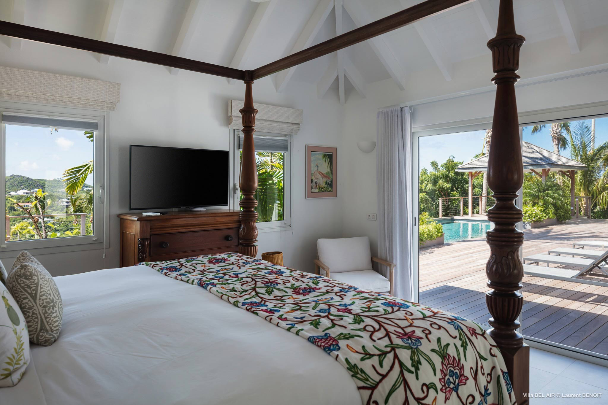 Features two identical master bedrooms, each boasting a king-sized four-poster bed, a dressing area, and an ensuite bathroom equipped with a shower. The third bedroom is located between the kitchen and one master bedroom, features versatile twin beds that can be combined into king-sized bed. All bedrooms have air-conditioning, and all three bedrooms have US satellite and Apple TV. All bedrooms have ensuite bathrooms.
