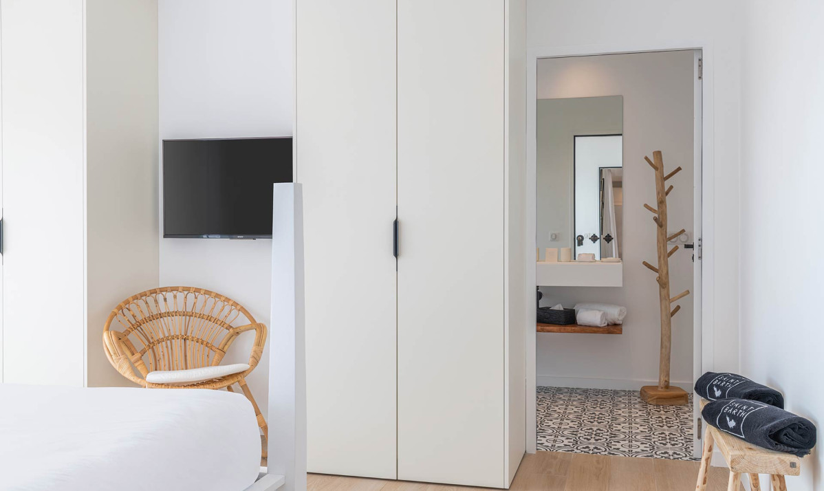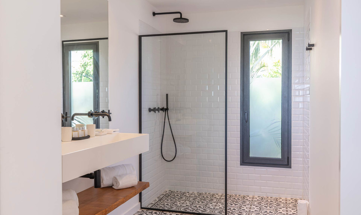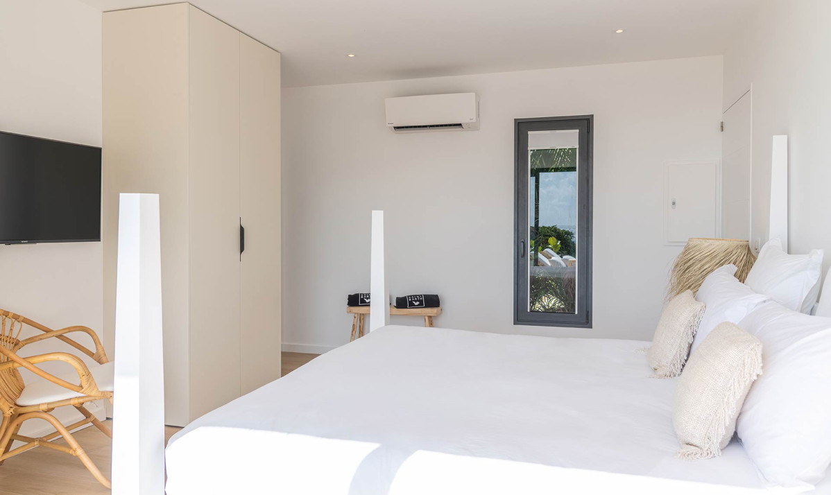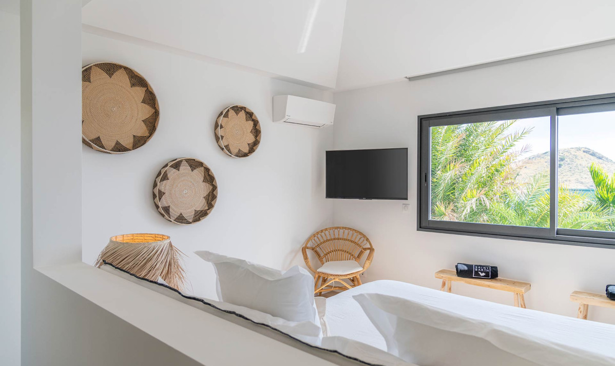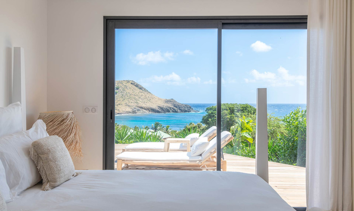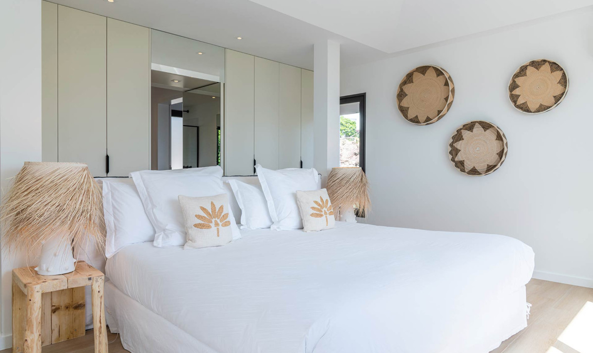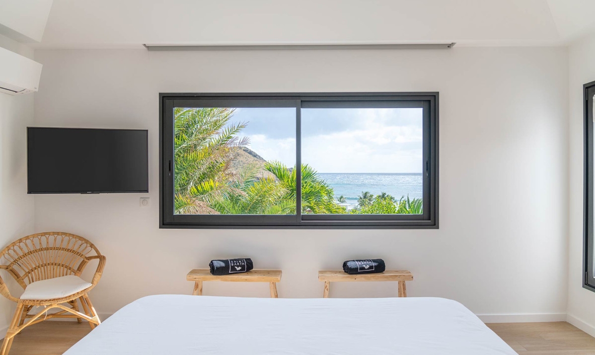 The property features two spacious bedrooms located on each side of the living room, each designed for comfort and relaxation. Both bedrooms are air-conditioned and include en-suite bathrooms, offering privacy and convenience for guests. The master bedroom boasts a king-sized bed and direct access to the outdoor terrace, perfect for enjoying the ocean breeze. The second bedroom is equally inviting, with a cozy ambiance. Thoughtfully decorated with soft linens and natural tones, the bedrooms provide a peaceful retreat after a day of exploring Saint Barts.