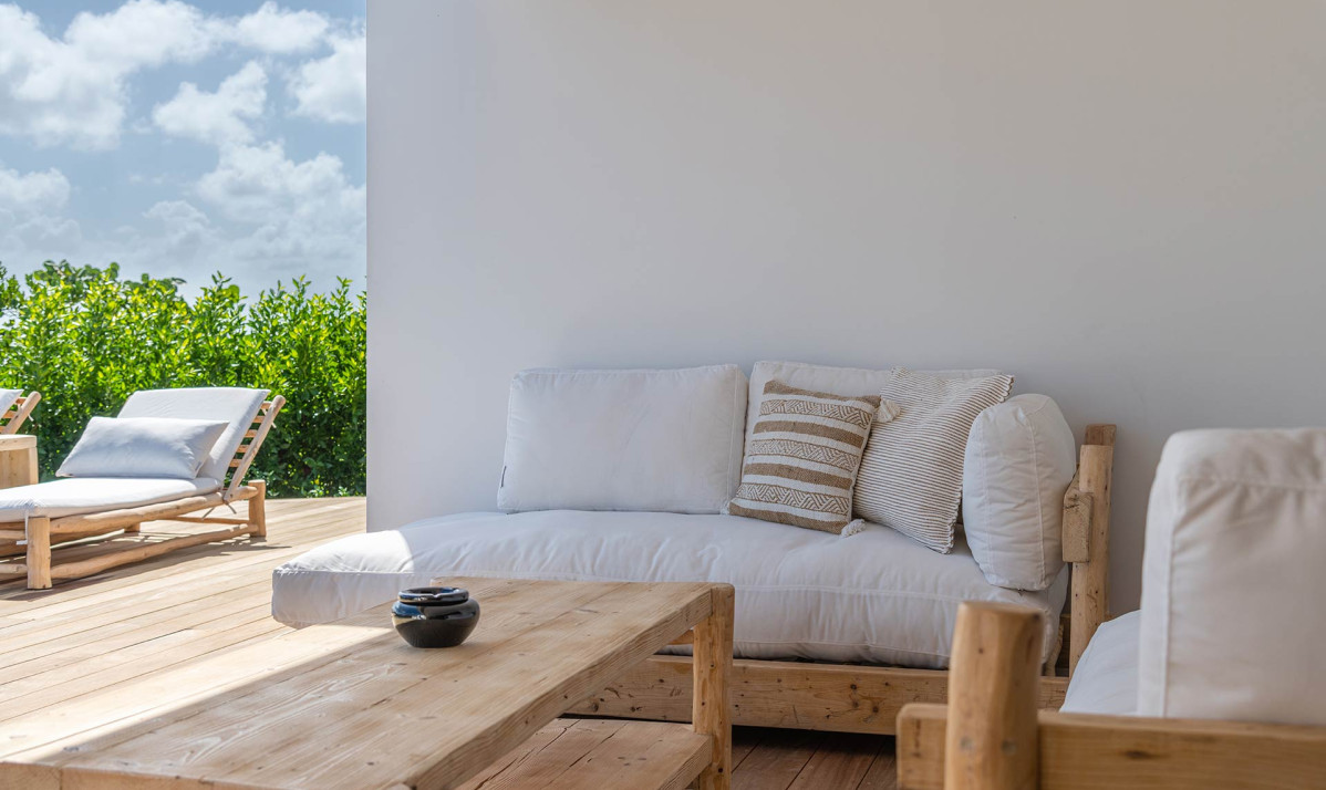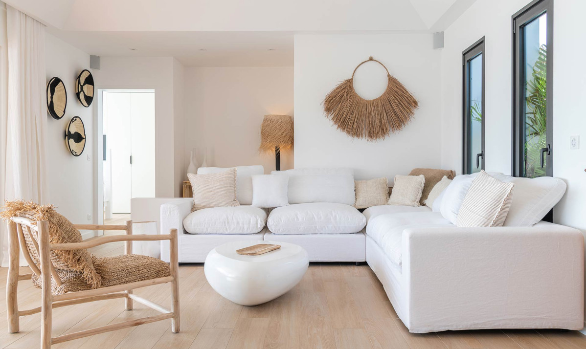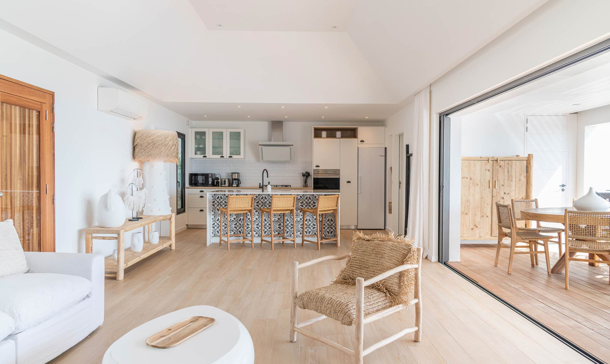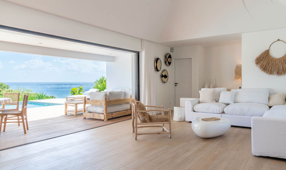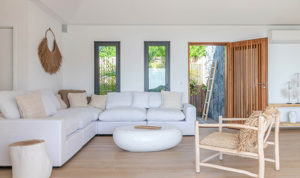 The interior of the property showcases a clean, light, and modern design with a touch of Caribbean charm. The living spaces are thoughtfully decorated with warm wooden furniture, creating a cozy yet elegant atmosphere. Plush white sofas add a sense of comfort and sophistication, while large windows allow natural light to fill the rooms. The open-concept layout seamlessly connects the living, dining, and kitchen areas, making it perfect for relaxation and entertaining.