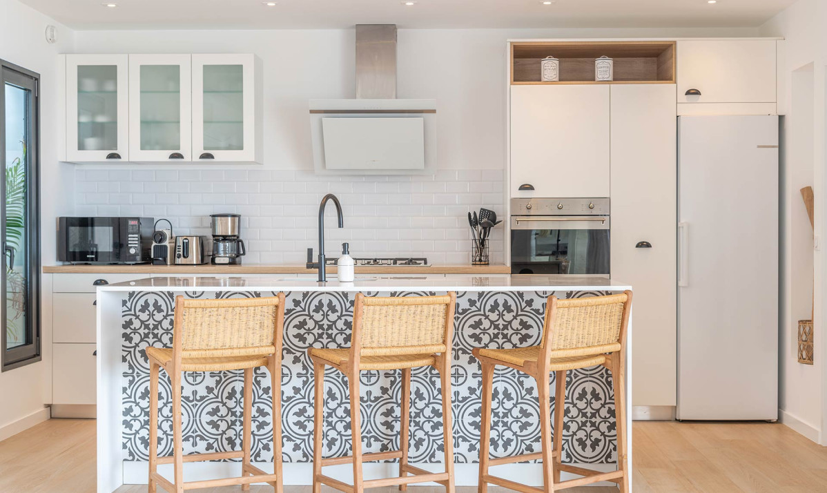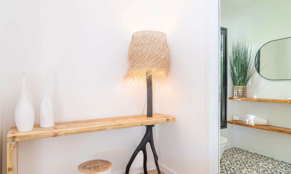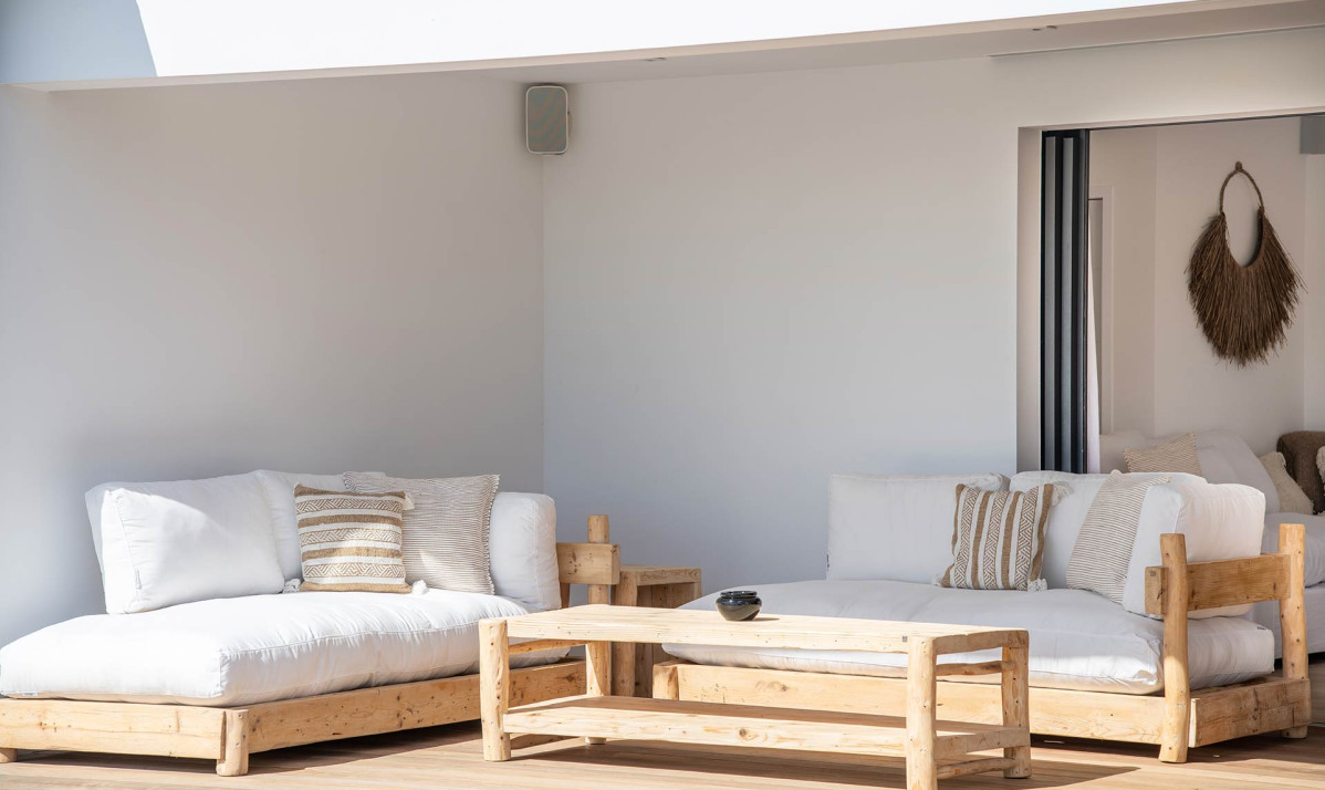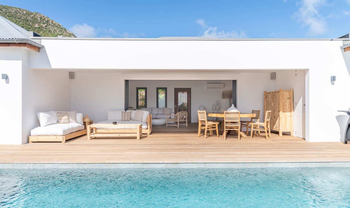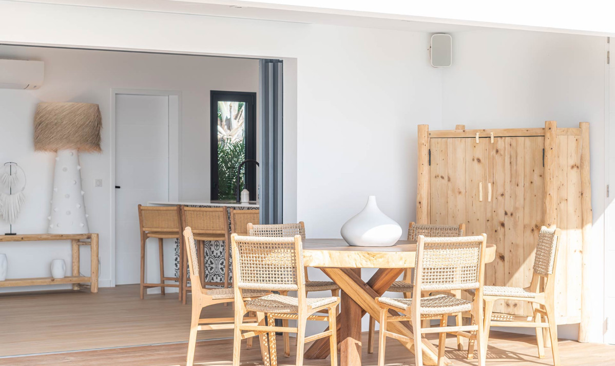 The interior of the property showcases a clean, light, and modern design with a touch of Caribbean charm. The living spaces are thoughtfully decorated with warm wooden furniture, creating a cozy yet elegant atmosphere. Plush white sofas add a sense of comfort and sophistication, while large windows allow natural light to fill the rooms. The open-concept layout seamlessly connects the living, dining, and kitchen areas, making it perfect for relaxation and entertaining.