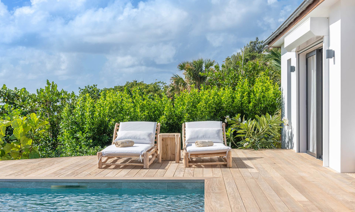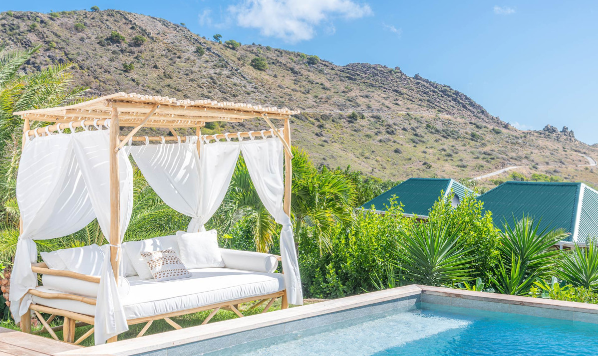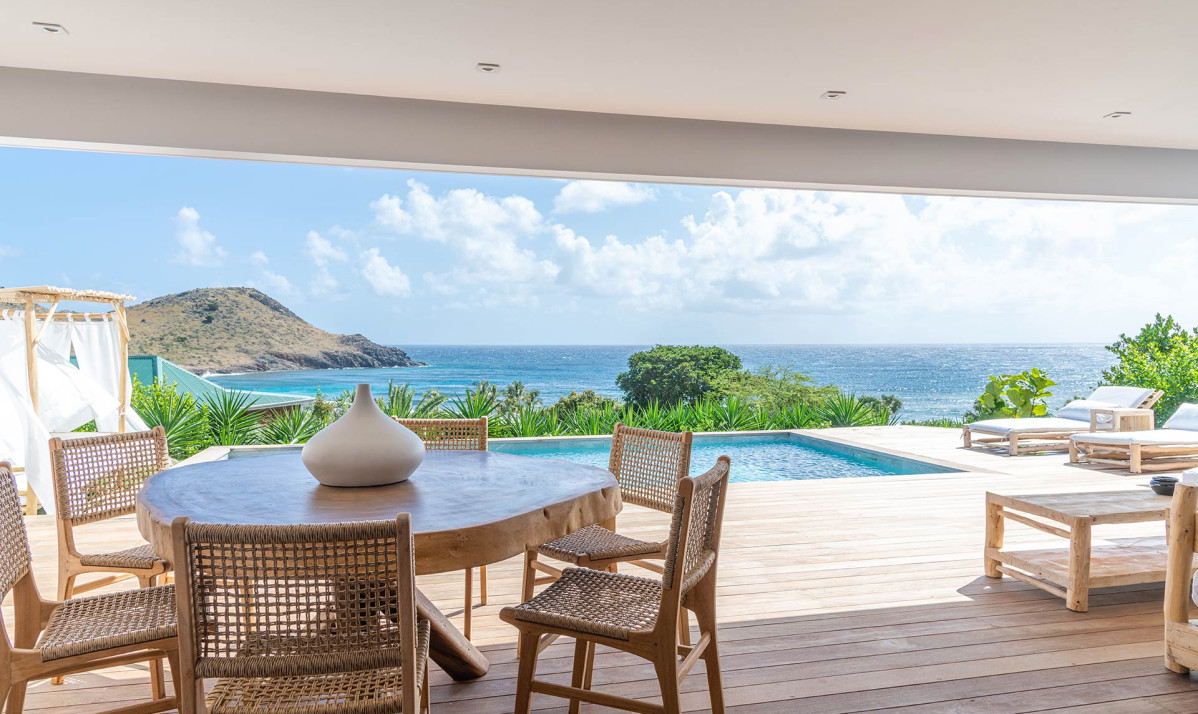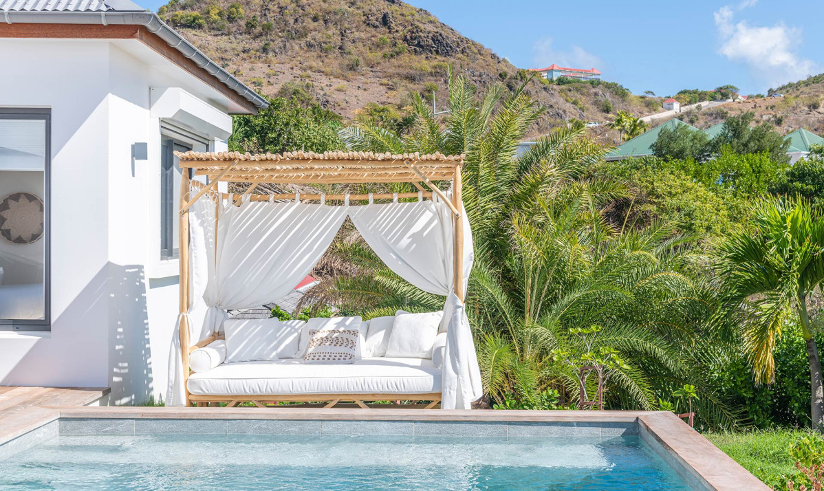 This beautiful property, located in Toiny, offers a charming exterior designed for relaxation and enjoyment. The house features a spacious swimming pool with a breathtaking ocean view, creating a serene atmosphere. Outside, guests can unwind on two comfortable sofas or gather around a table that seats six for al fresco dining. A stylish daybed with white curtains provides a cozy spot to relax in the shade. The house is surrounded by a well-maintained outdoor space, perfect for soaking in the natural beauty of Saint Barts.