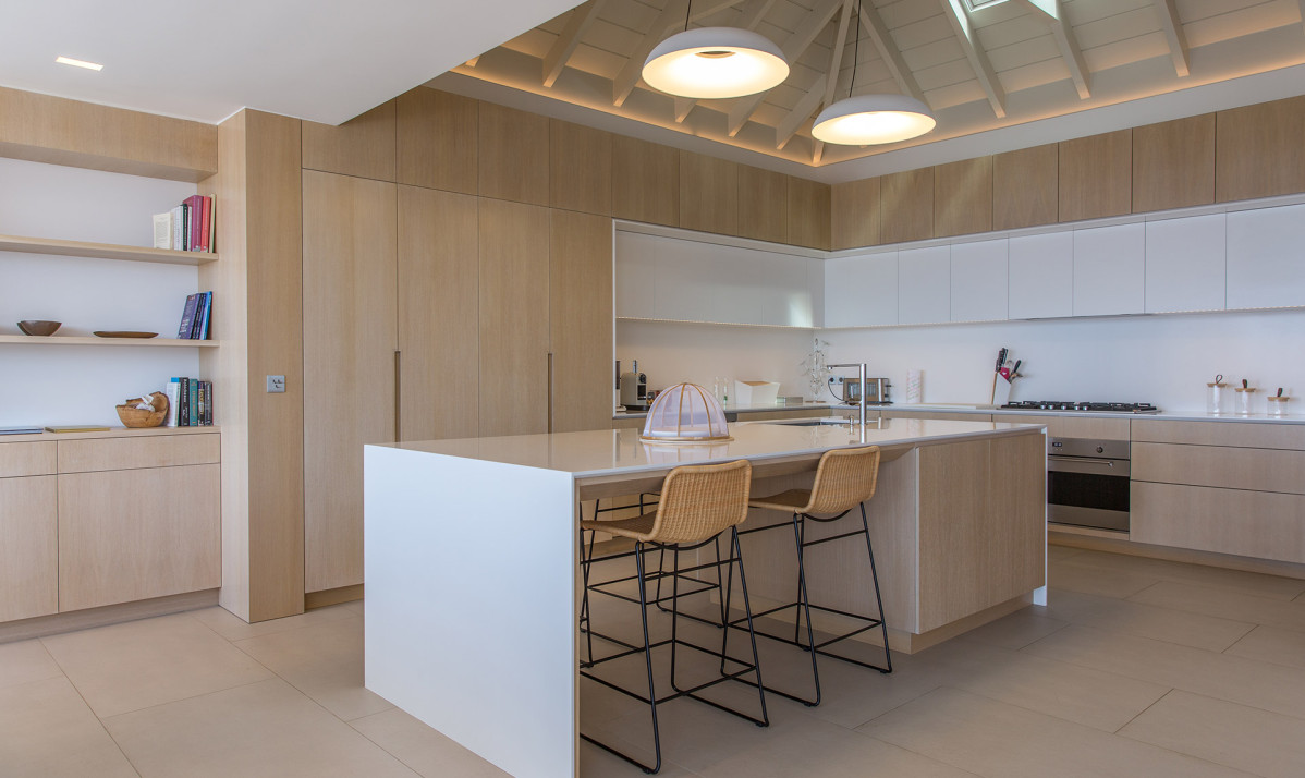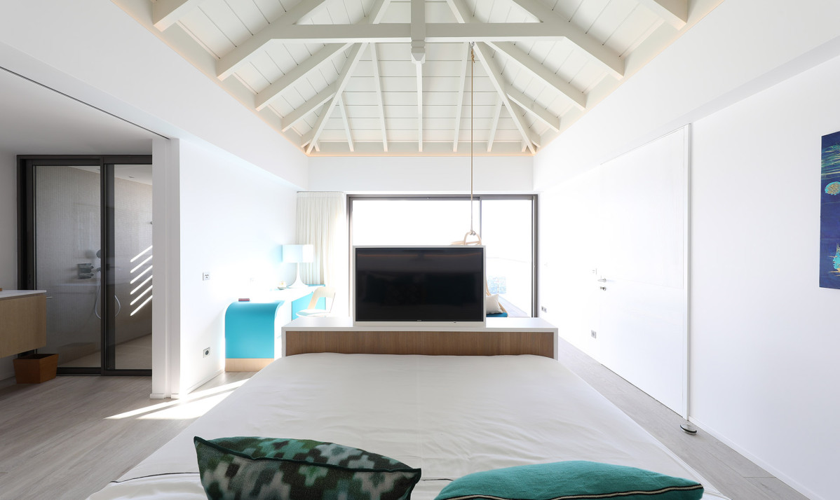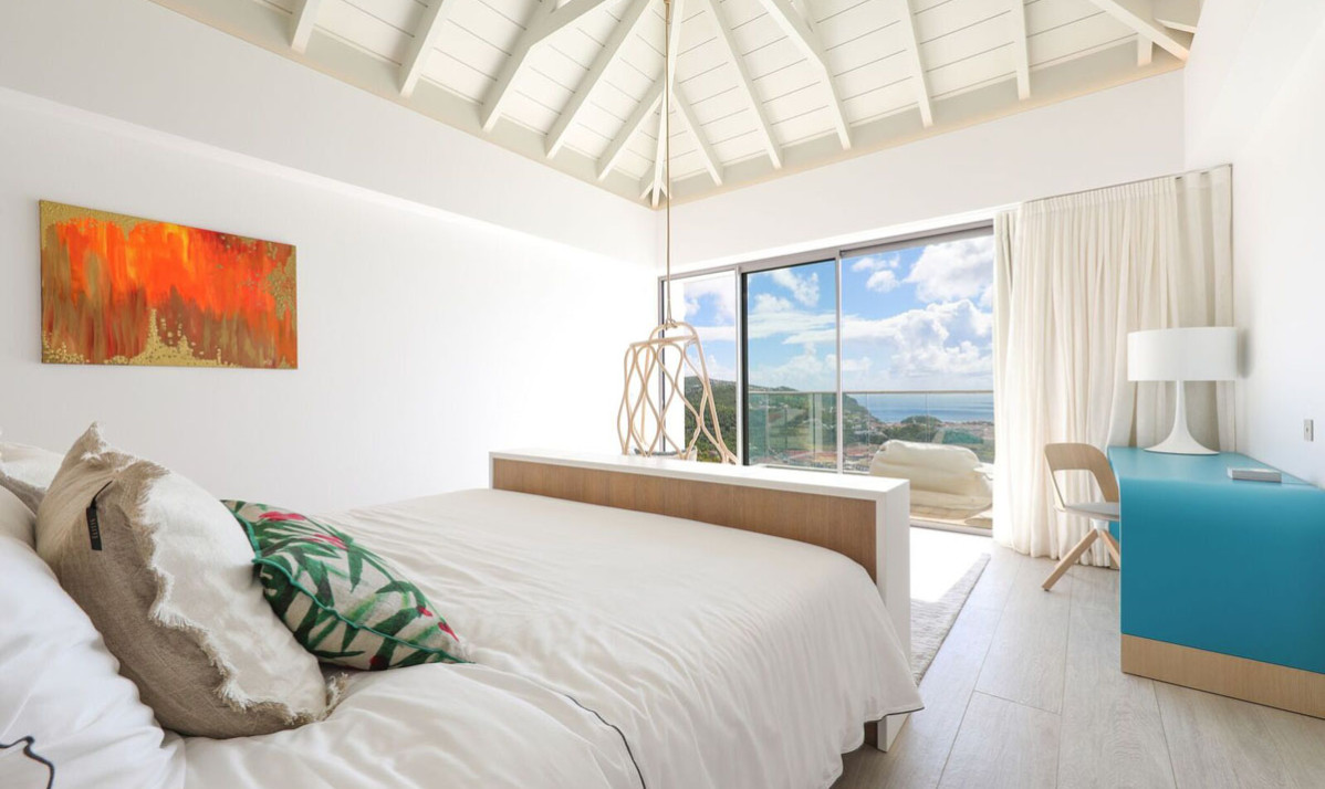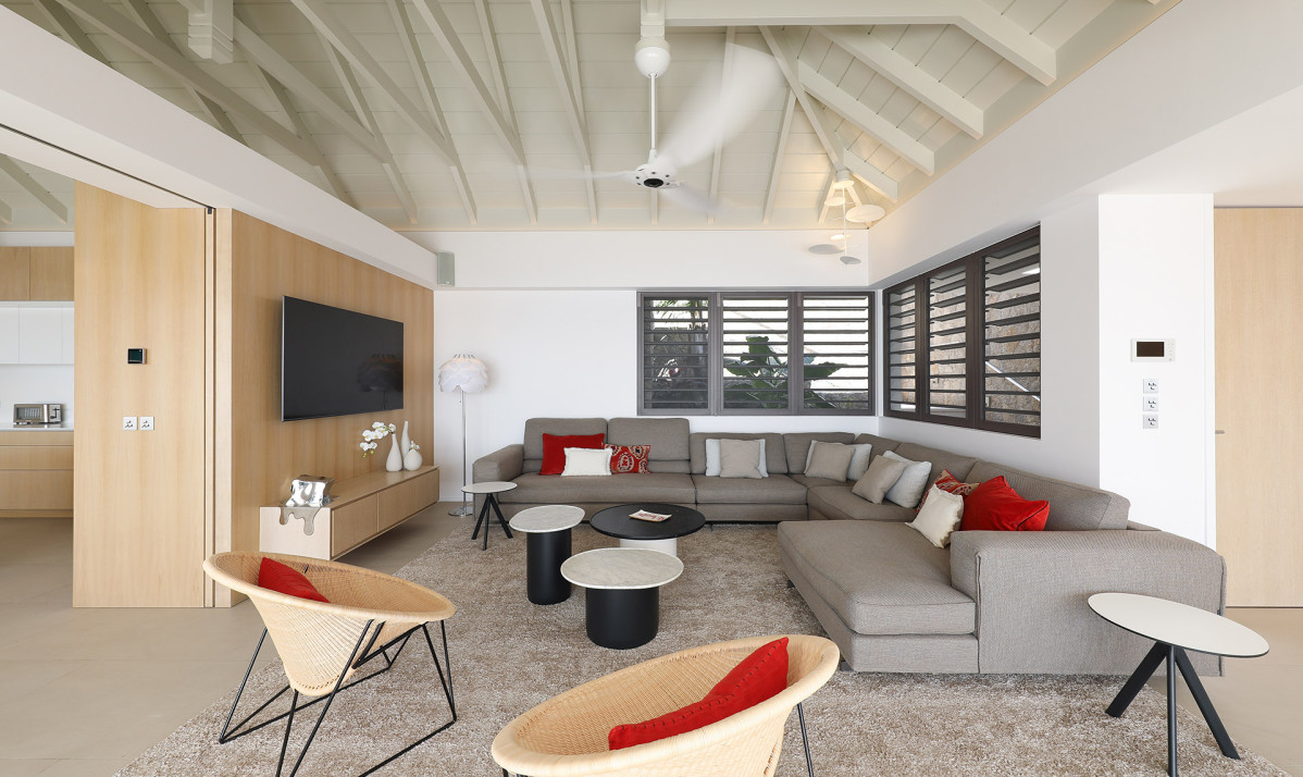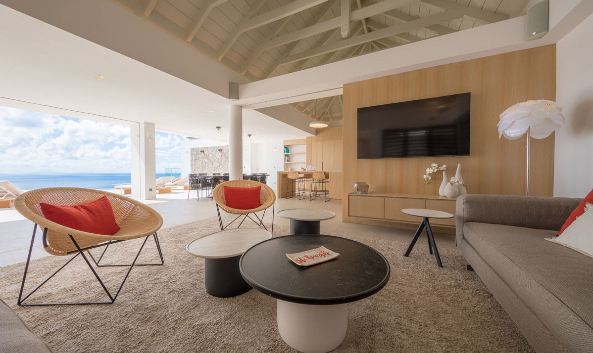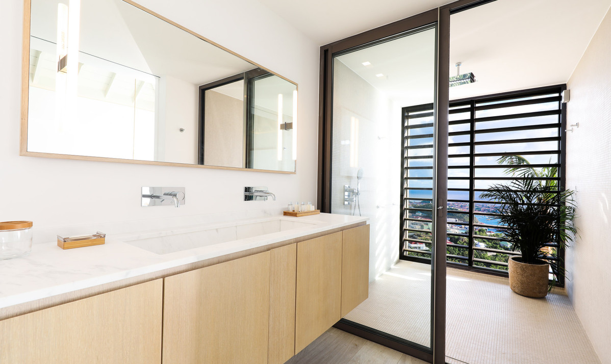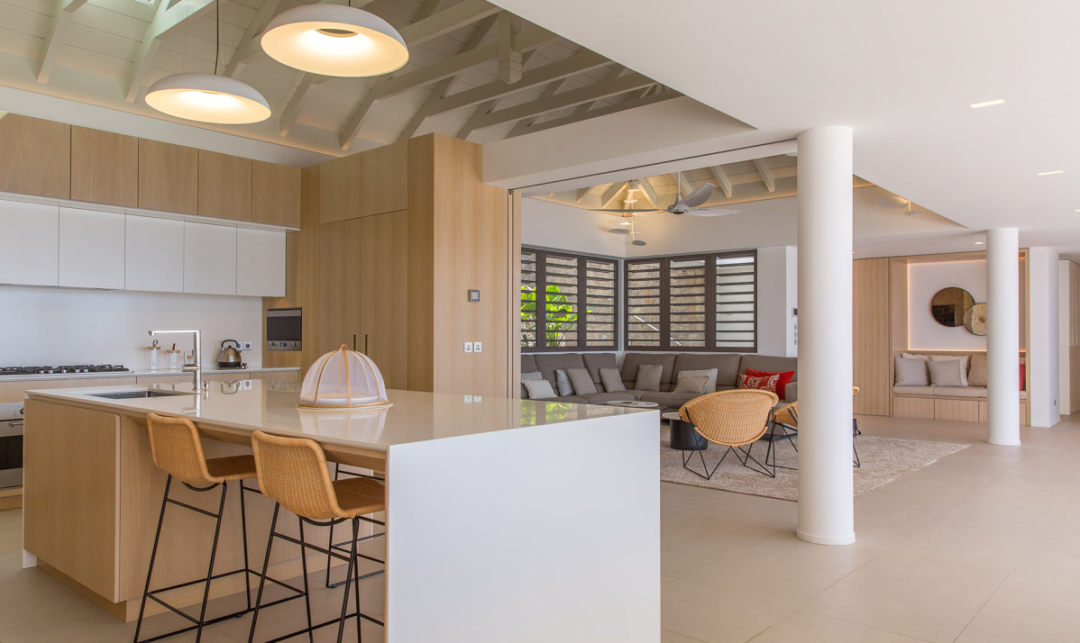 Inside, Villa D'zir is confidently modern, although its Caribbean roots haven’t been forgotten altogether. The central living space is cleverly designed, sitting under a high, vaulted white wood ceiling, it is one space that can be separated into two if desired. To one end, the large living room with spacious sectional sofa and TV, while to the other, a substantial kitchen with island, and a dining table facing the views for those meals at home. If you want to separate the kitchen from the living room, a sliding panel extends out quickly and easily to achieve this.