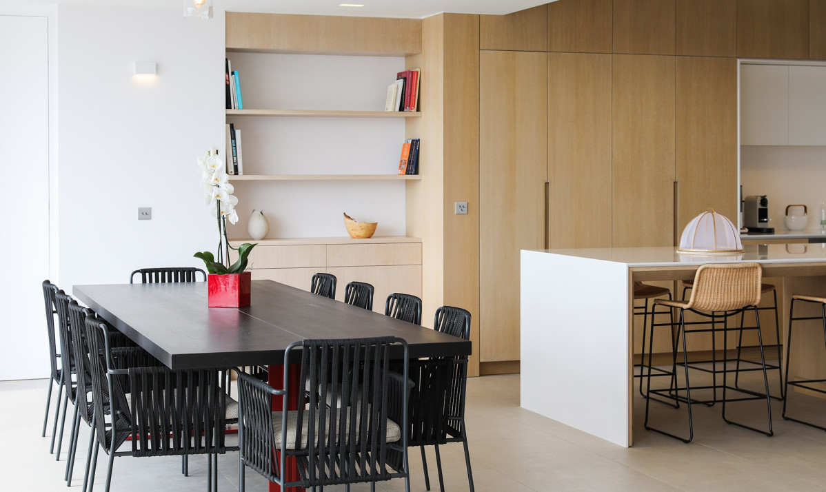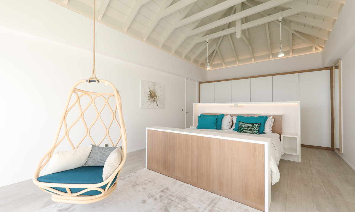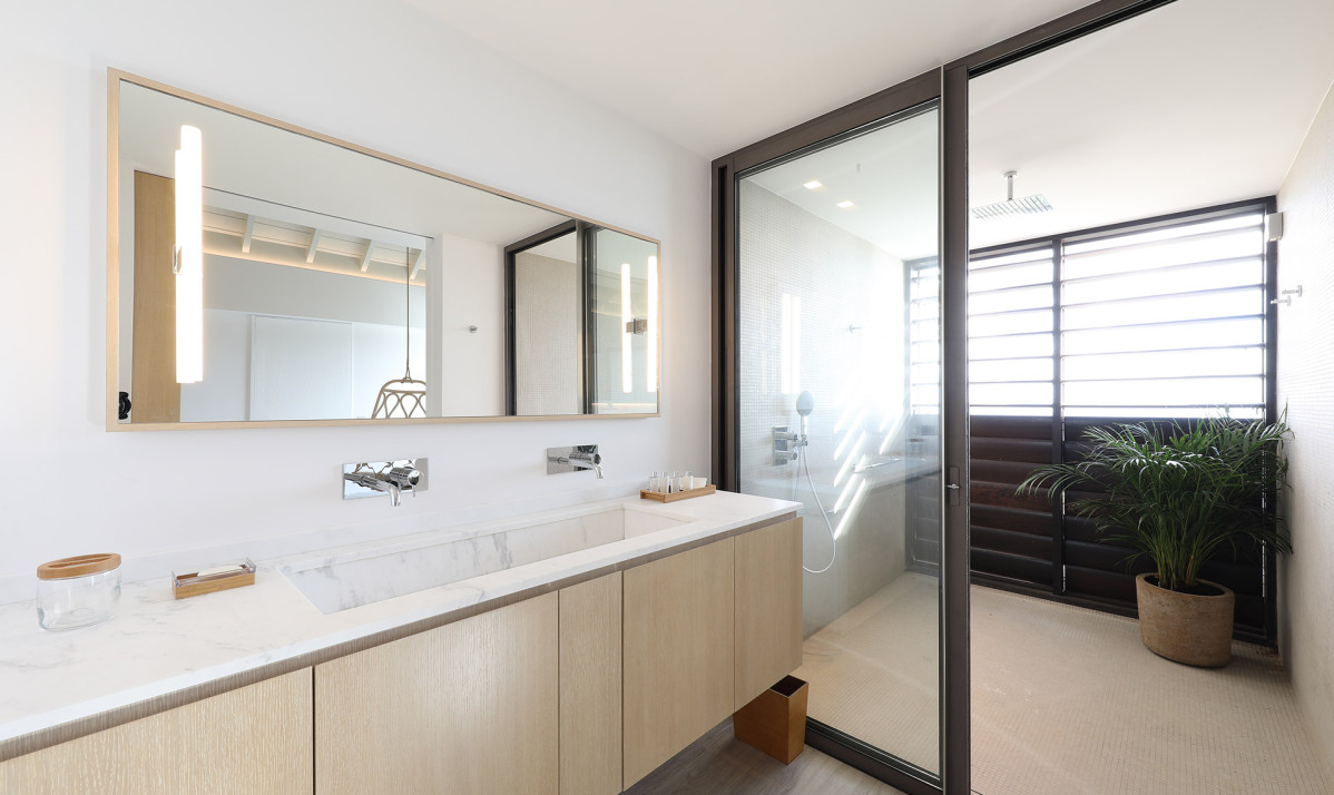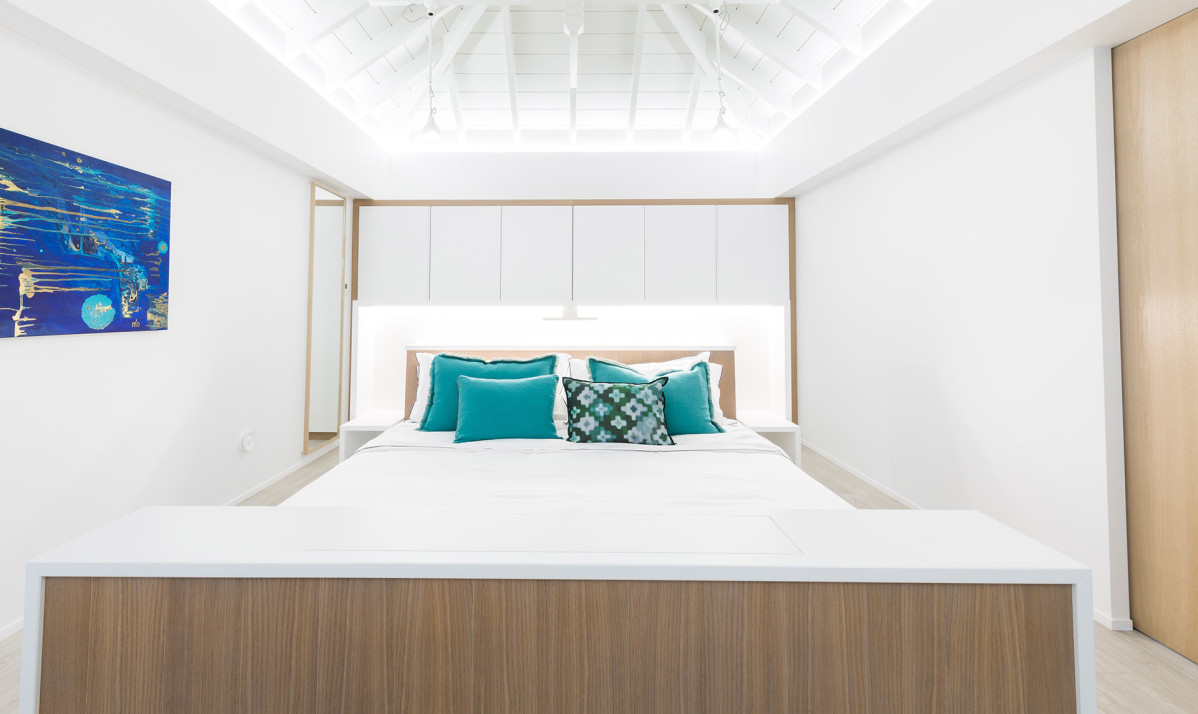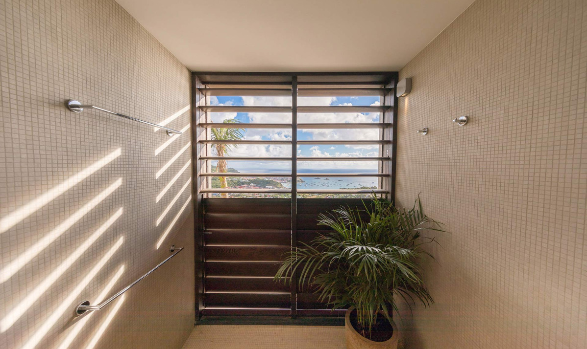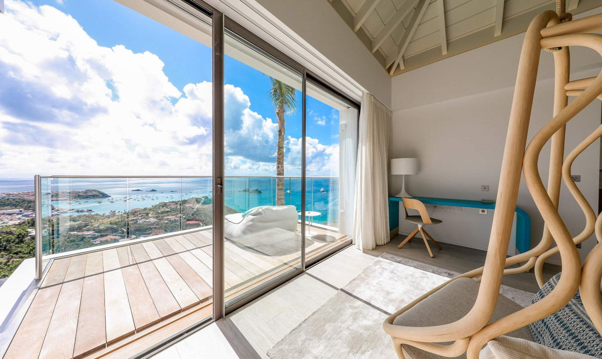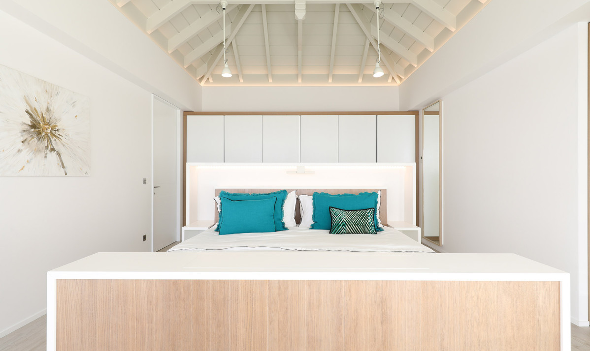 Inside, Villa D'zir is confidently modern, although its Caribbean roots haven’t been forgotten altogether. The central living space is cleverly designed, sitting under a high, vaulted white wood ceiling, it is one space that can be separated into two if desired. To one end, the large living room with spacious sectional sofa and TV, while to the other, a substantial kitchen with island, and a dining table facing the views for those meals at home. If you want to separate the kitchen from the living room, a sliding panel extends out quickly and easily to achieve this.