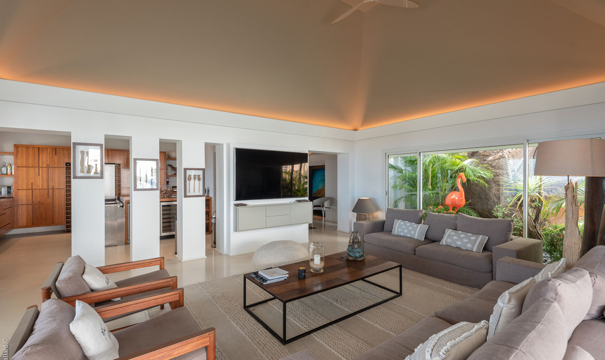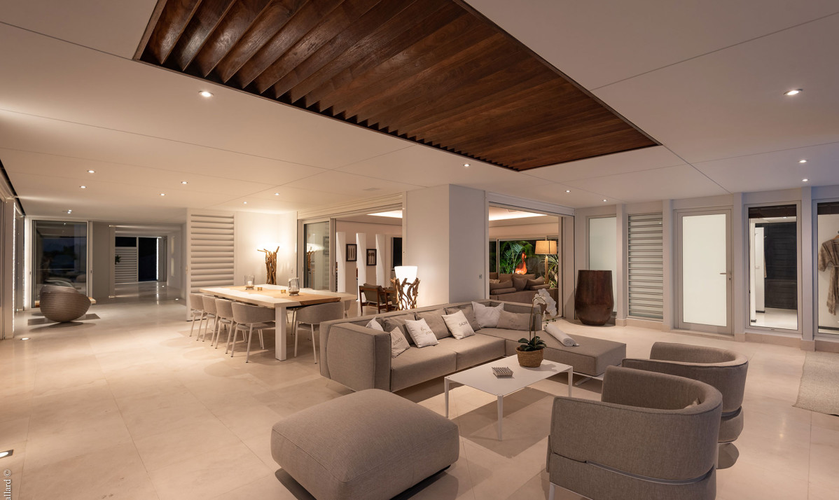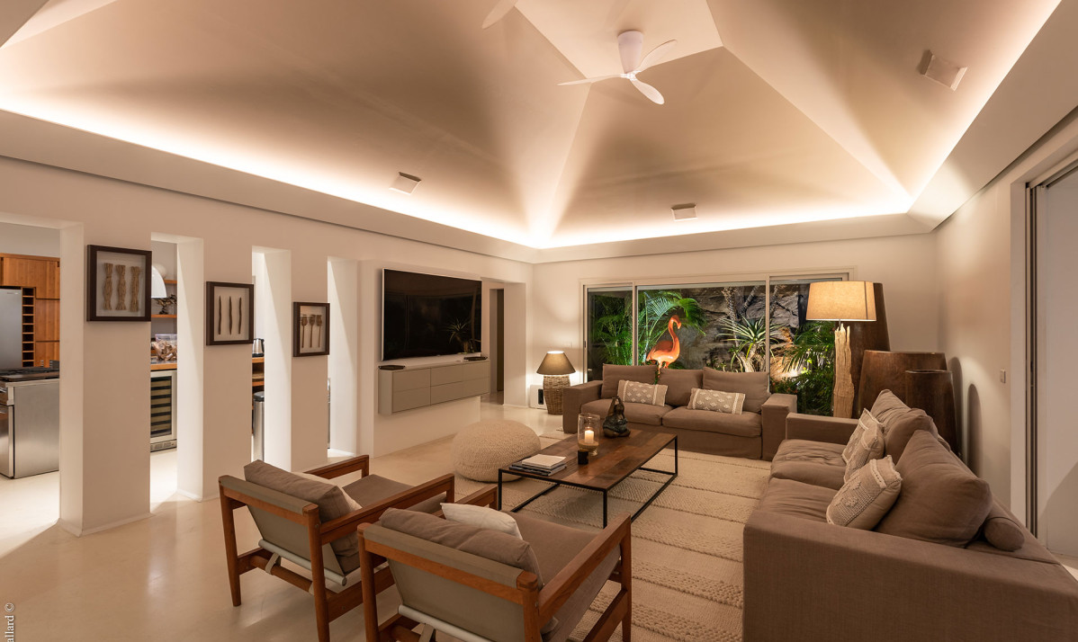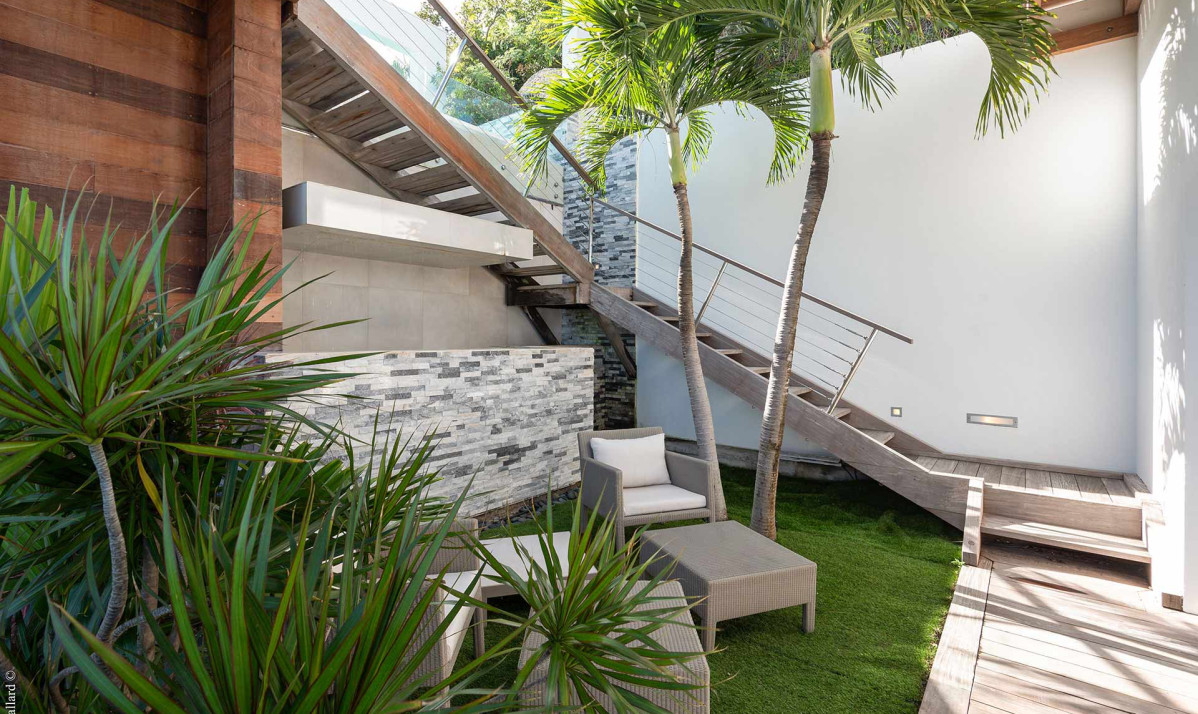With such a seamless flow from inside to outside spaces, it’s difficult to tell sometimes where one space ends and the other begins. Of course, this makes The property is the perfect place for families and friends to gather together and enjoy each other’s company. Perhaps the best place to do this is outside, whether around the swimming pool, on the large sun terrace, or the sprawling covered terrace that is home to the outdoor dining and living areas, and a fun little game zone. For an amazing sunset view, head up through the tropical gardens along a steep path to an elevated deck.
