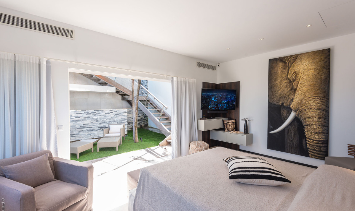 With 6 bedrooms in total, the house has space for up to 12 guests, and there’s plenty of separation between them. The Master suite is large and has its own sitting area and dressing room, and a lovely ensuite bathroom. Two more of the ensuite bedrooms are on this main level, and there are two further bedrooms on the lower floor. One, with kitchenette, offers a surprising self-contained studio space while the other has access to a serene cactus garden. The final bedroom is very private with a king four poster bed set in its own little bungalow, however, the bathroom is in an adjacent bungalow.