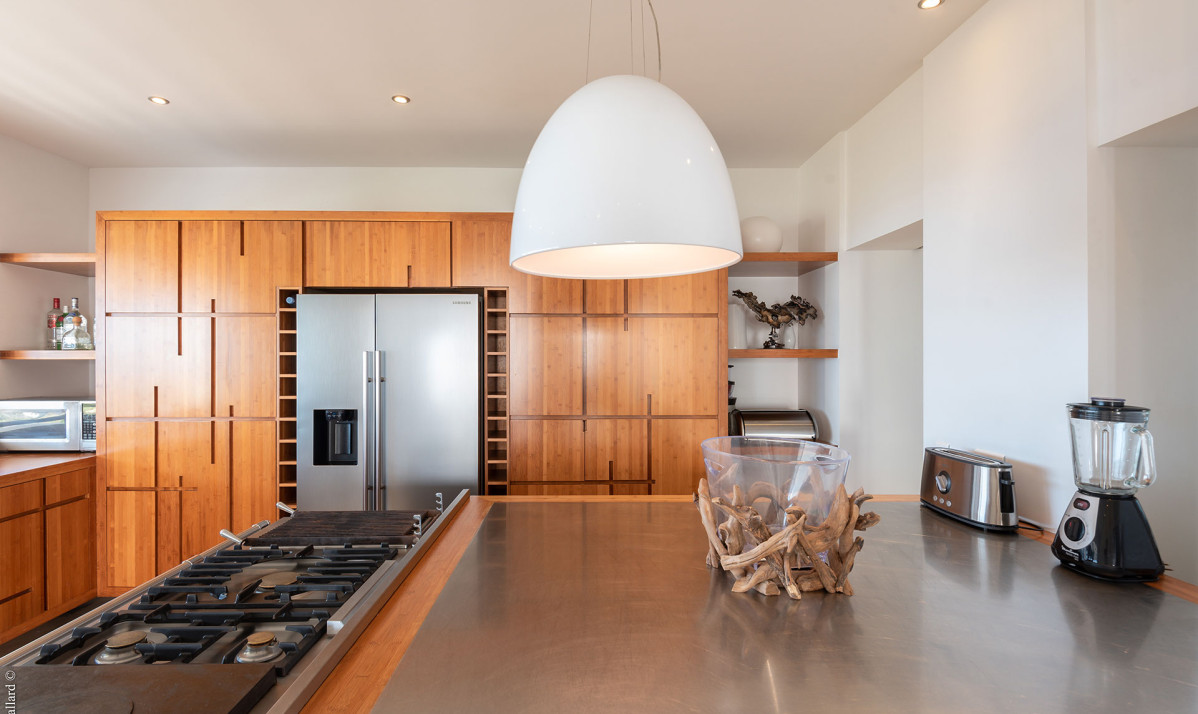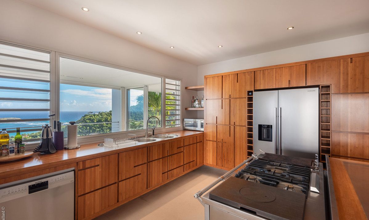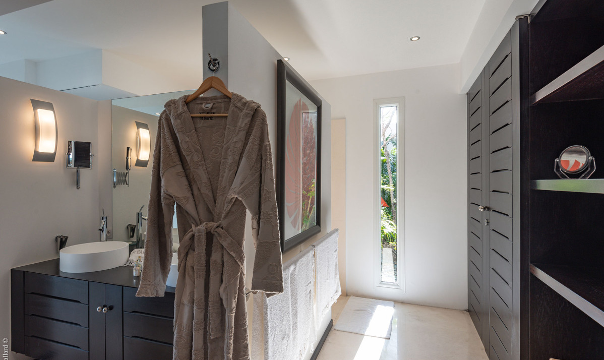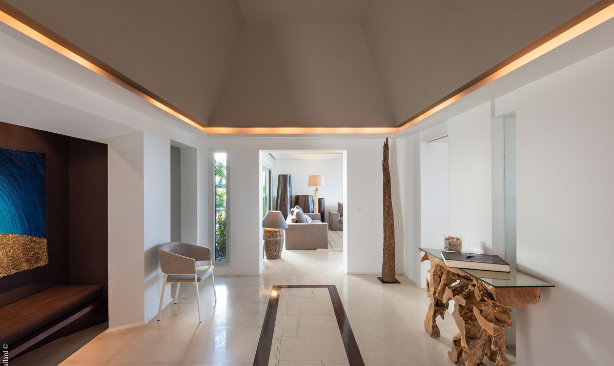 The contemporary styling is very evident on the inside of this villa where the main space is semi-open plan, providing a little break between living room and kitchen. The kitchen itself is stunning with its warm teak wood cabinetry contrasting against the sleek stainless steel appliances. Back in the living room there are comfy sofas for sitting back and watching TV or enjoying the views, while on a lower floor is the villa’s gym.