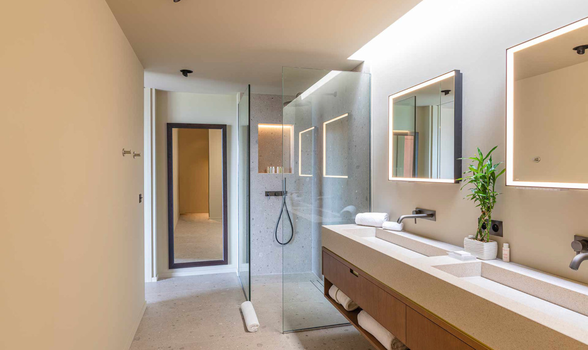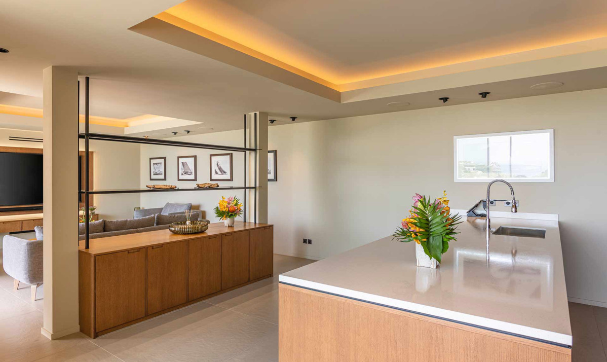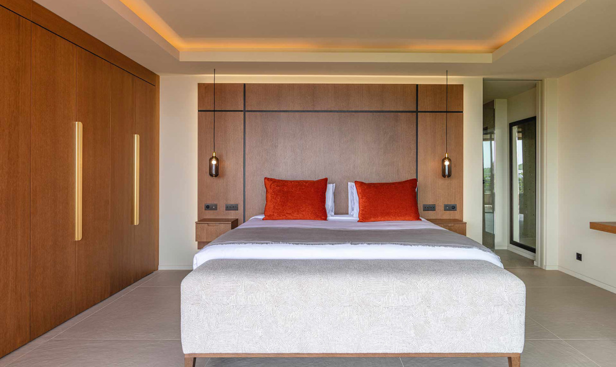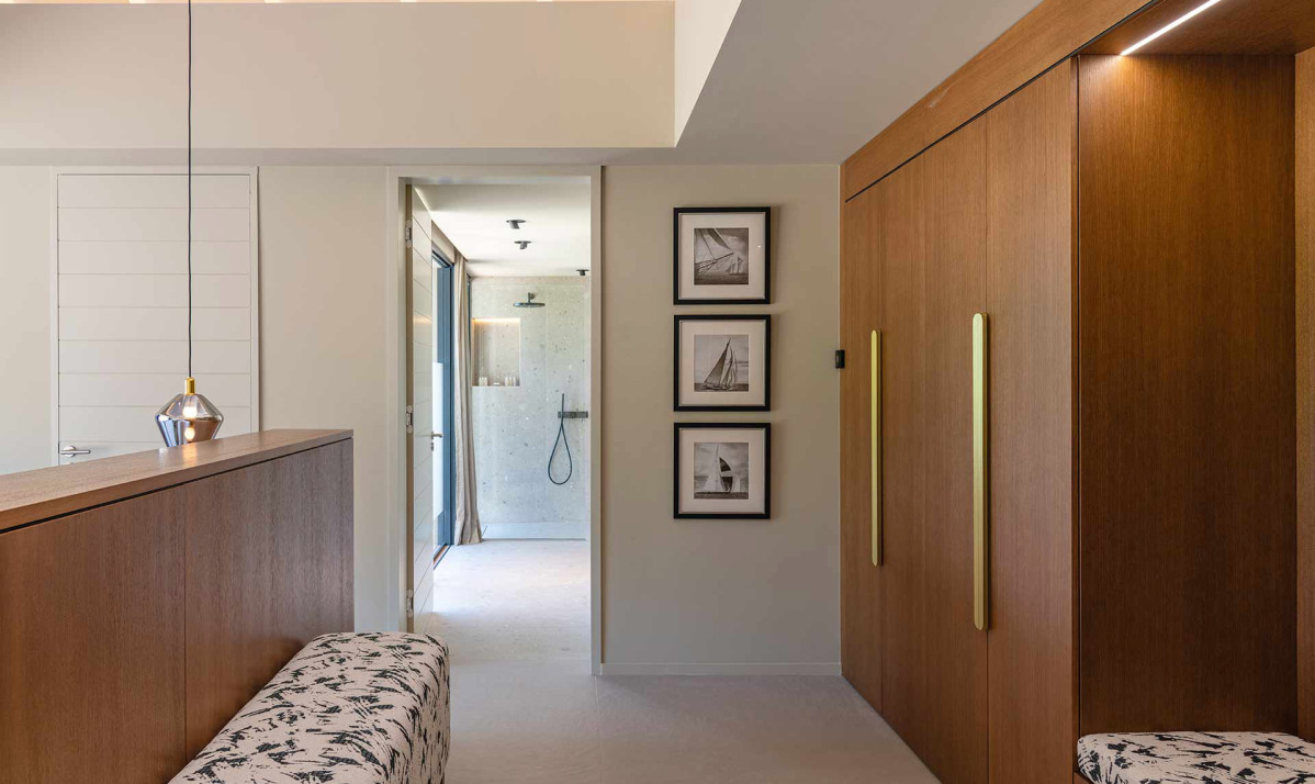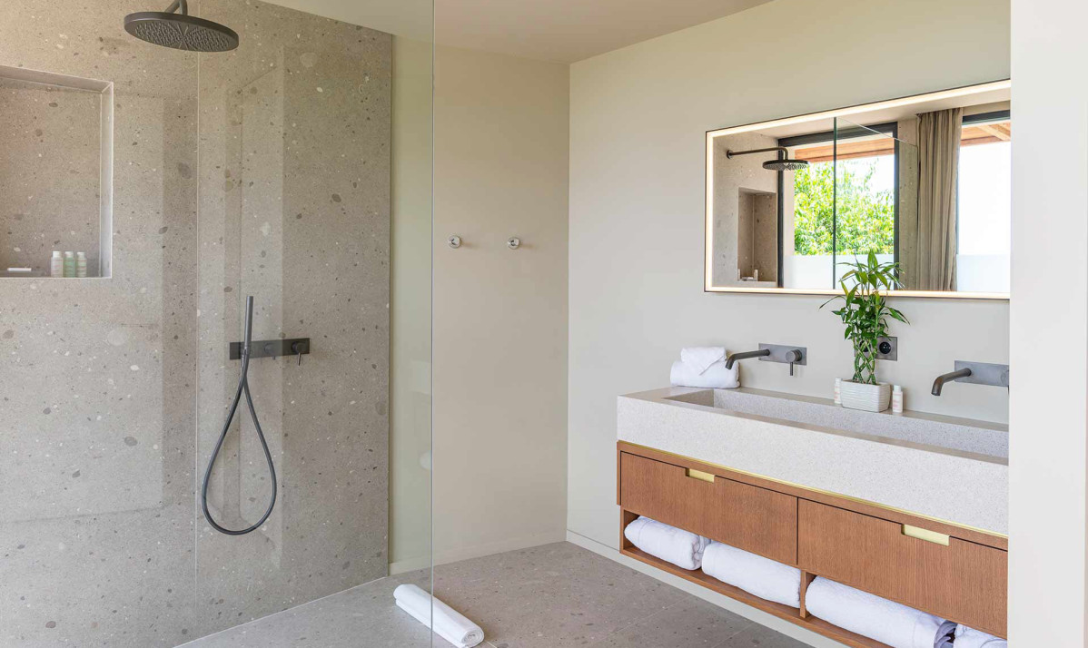 Inside Villa Eva, inviting open-plan living room seamlessly connects to the kitchen. The fully air-conditioned living room and kitchen ensure your comfort, while the terrace offers a seamless transition between the interior and exterior of the property. Relax on comfortable sofas in the living room, creating a cozy and spacious atmosphere for enjoying your time with your family and guests.