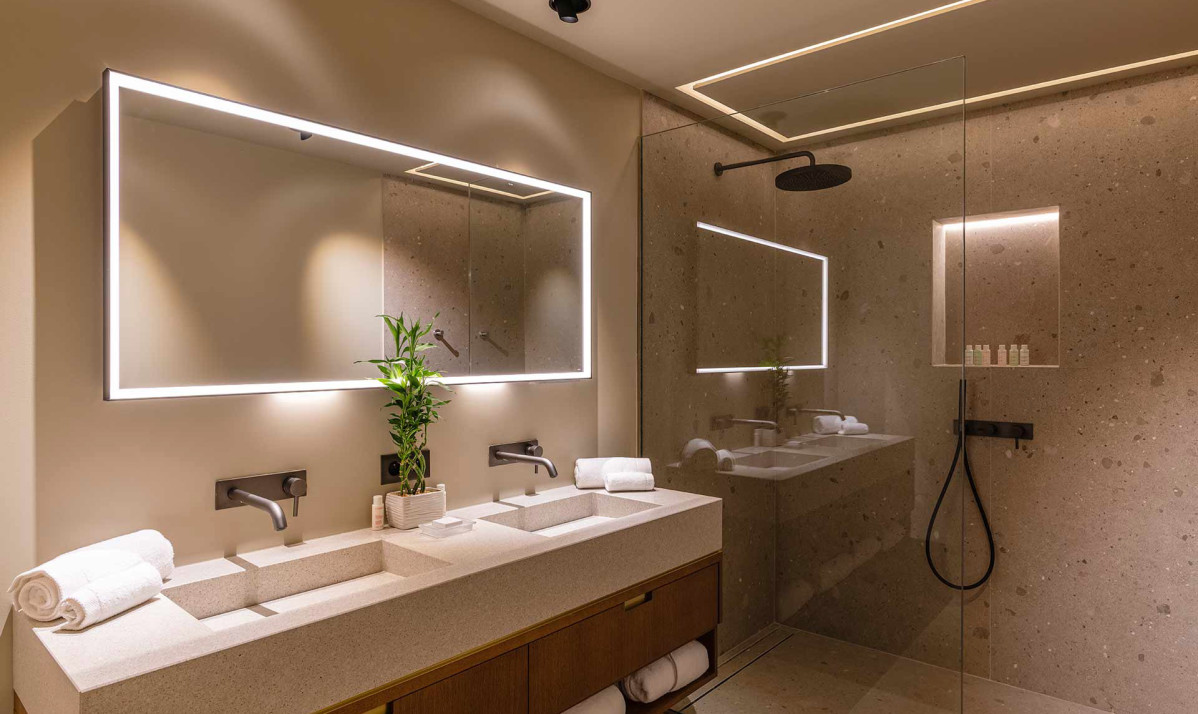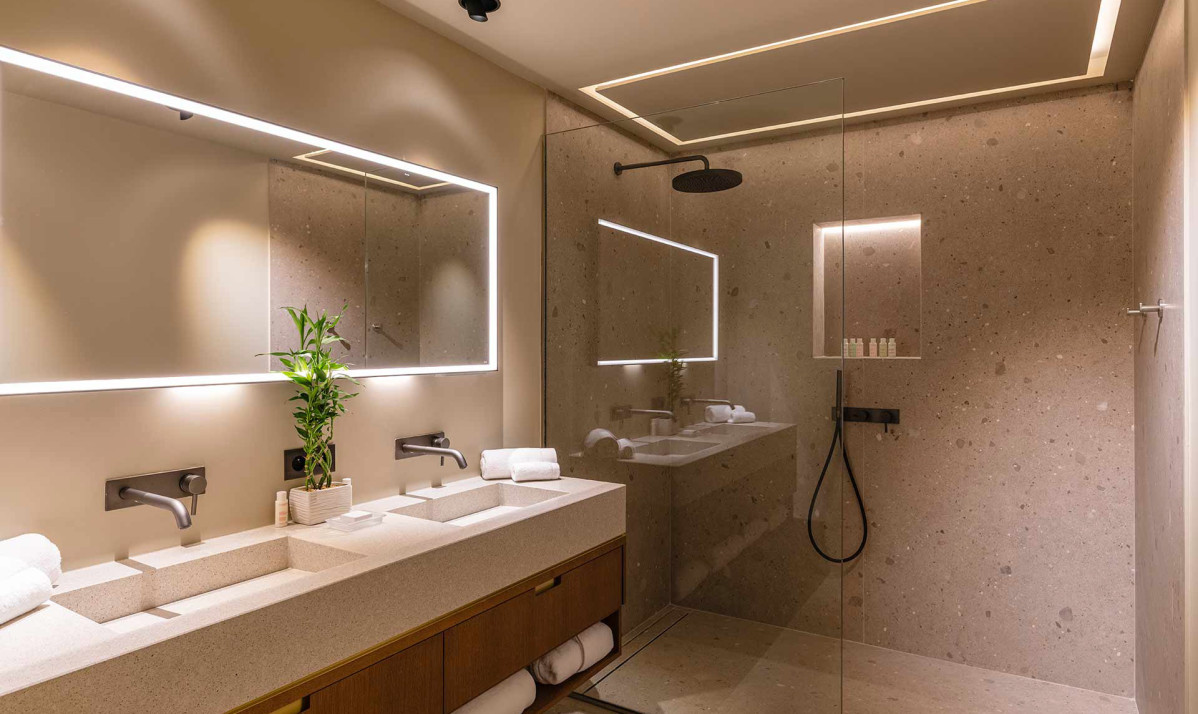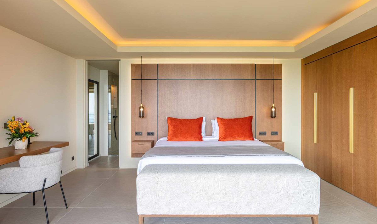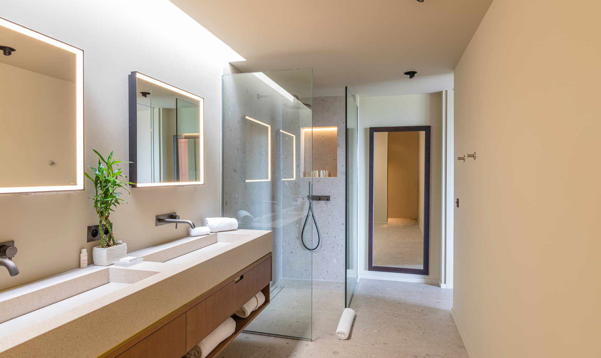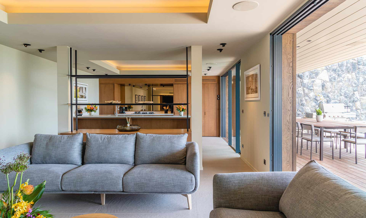 Inside Villa Eva, inviting open-plan living room seamlessly connects to the kitchen. The fully air-conditioned living room and kitchen ensure your comfort, while the terrace offers a seamless transition between the interior and exterior of the property. Relax on comfortable sofas in the living room, creating a cozy and spacious atmosphere for enjoying your time with your family and guests.