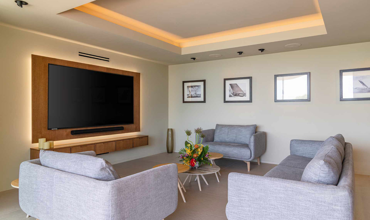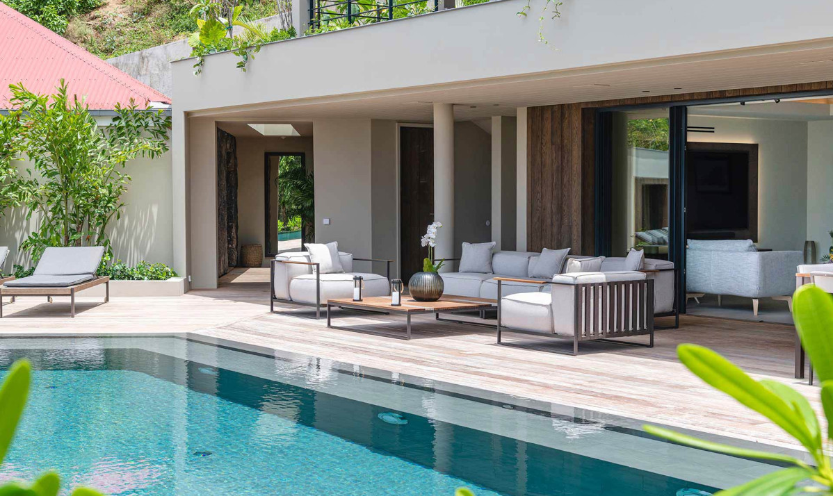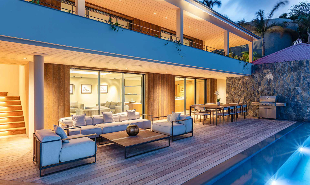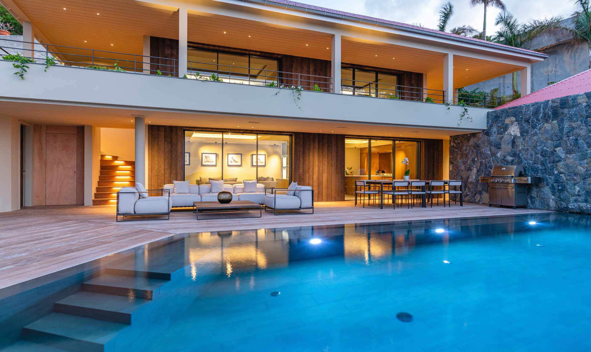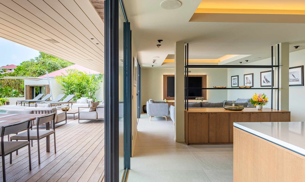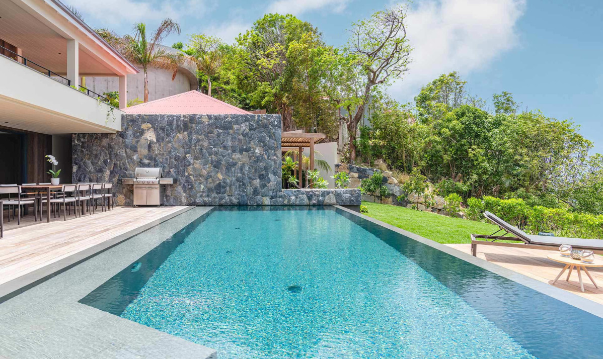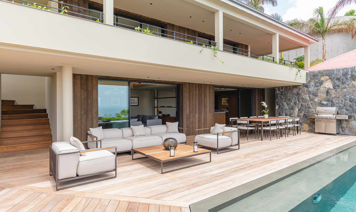 The property spans two levels, creating a practical yet relaxing outdoor space. Additionally, it features a heated swimming pool. On the main level, there are parking spaces for two cars, with an extra spot above the villa for added convenience. The expansive terrace offers comfortable sofas, a large dining table accommodating up to 10 guests, and sun-beds for enjoying the Caribbean sun. Adding to its family-friendly charm, the villa boasts a lush grass lawn where children can freely play and frolic, making it an ideal destination for both relaxation and recreation.