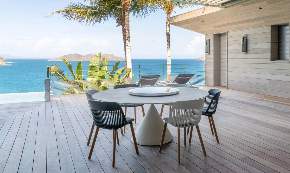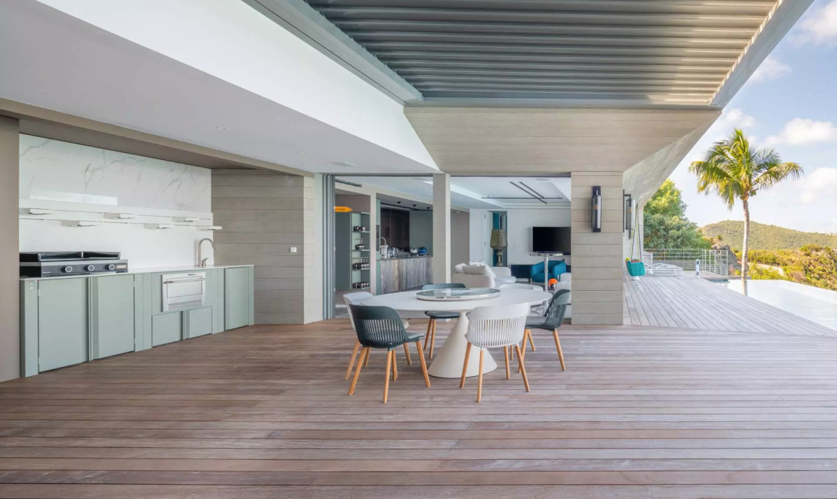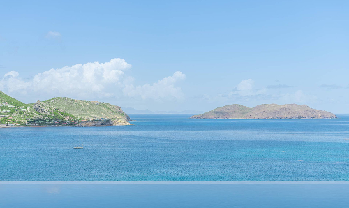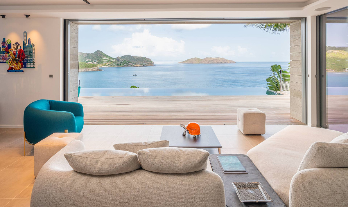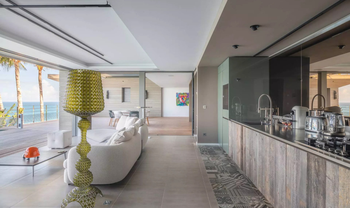 Inside, the interior is a testament to modern elegance and seamless integration with nature. The open-concept design combines the kitchen with the living room, creating a spacious and inviting atmosphere. A striking feature is the mirror backsplash in the kitchen, ingeniously reflecting the mesmerizing ocean views, blending the outside beauty with the interior decor. This thoughtful design accentuates the villa's connection to its stunning surroundings. The blend of indoor and outdoor living spaces, accentuated by natural light and contemporary furnishings, makes the interior of the villa not just sumptuous but also a serene retreat that resonates with the beauty of Saint Barts. The villa is fully air conditioned.