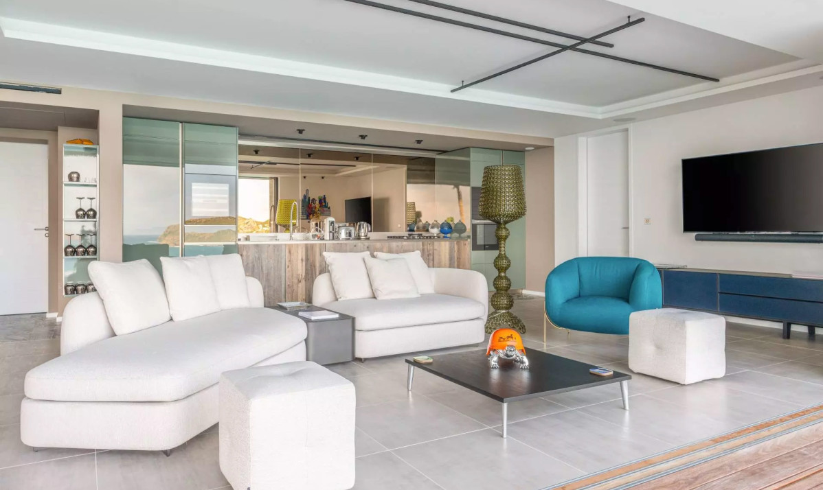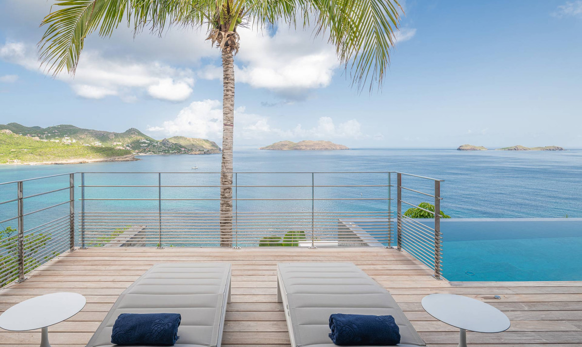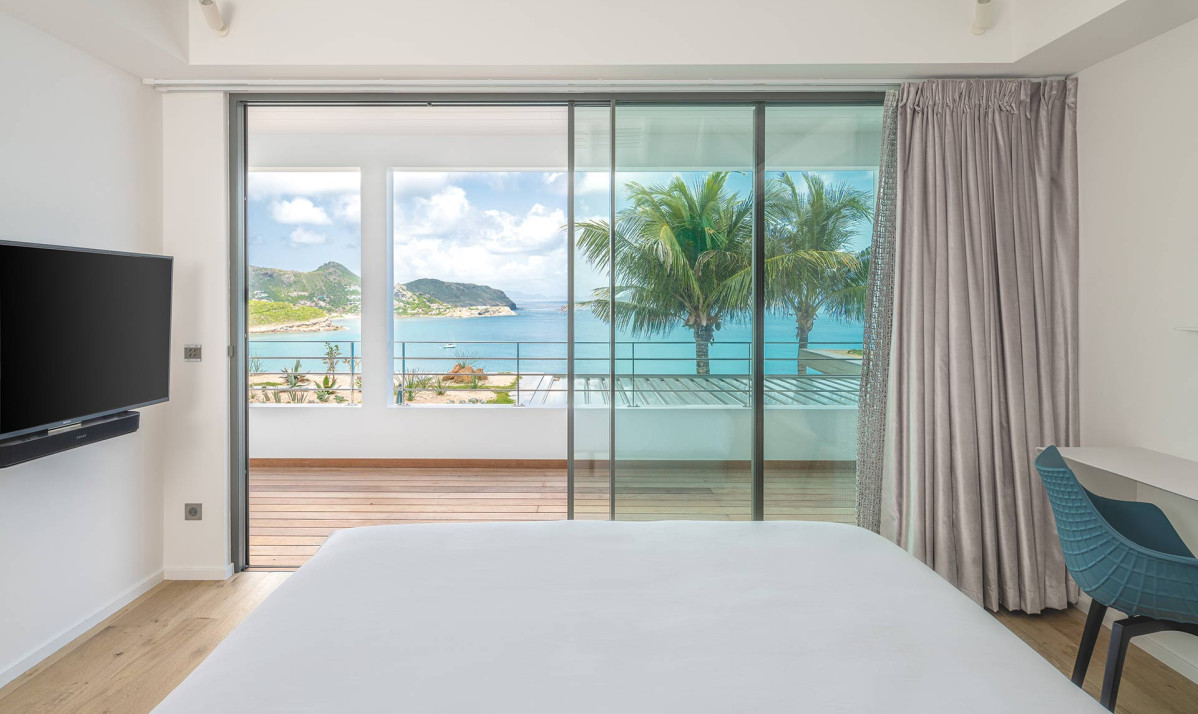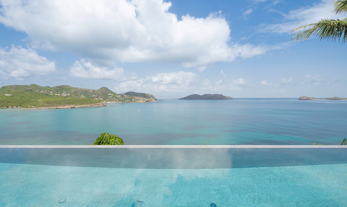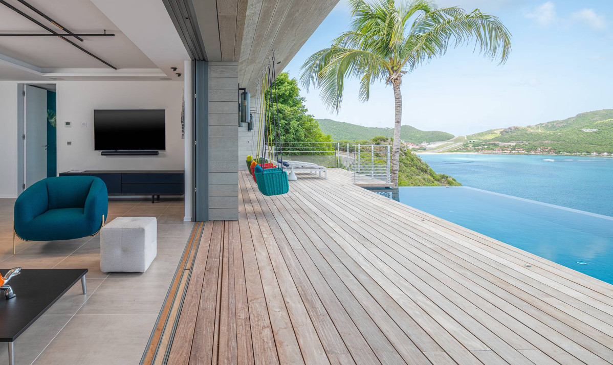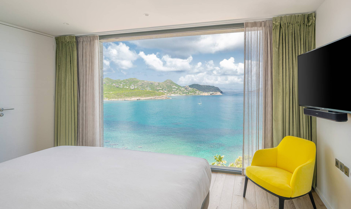 Inside, the interior is a testament to modern elegance and seamless integration with nature. The open-concept design combines the kitchen with the living room, creating a spacious and inviting atmosphere. A striking feature is the mirror backsplash in the kitchen, ingeniously reflecting the mesmerizing ocean views, blending the outside beauty with the interior decor. This thoughtful design accentuates the villa's connection to its stunning surroundings. The blend of indoor and outdoor living spaces, accentuated by natural light and contemporary furnishings, makes the interior of the villa not just sumptuous but also a serene retreat that resonates with the beauty of Saint Barts. The villa is fully air conditioned.
