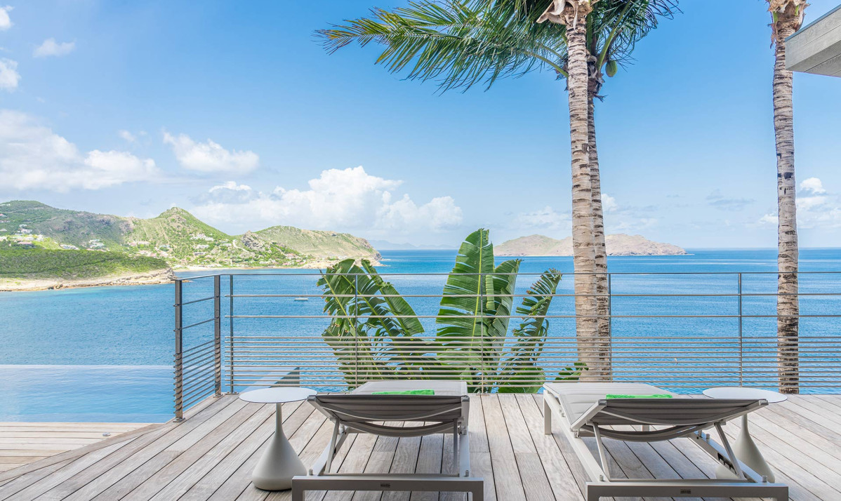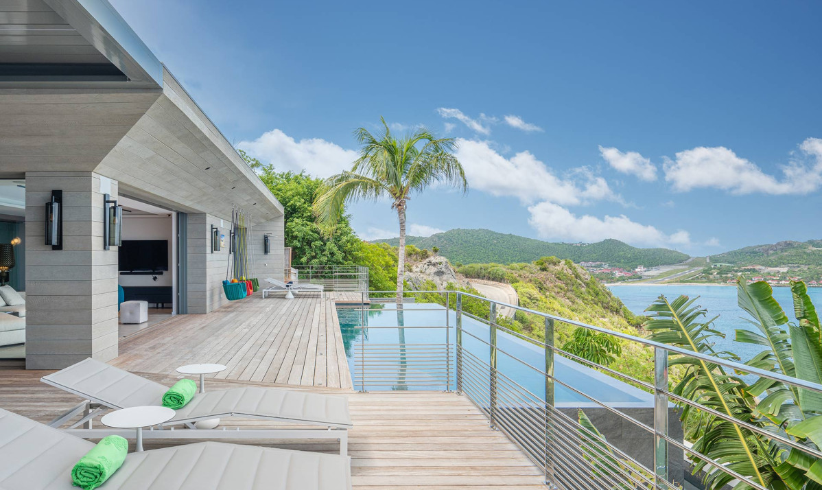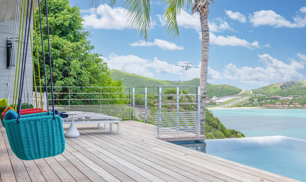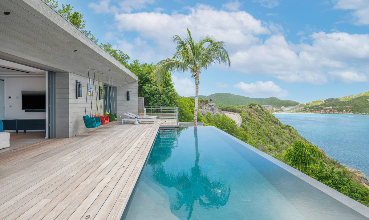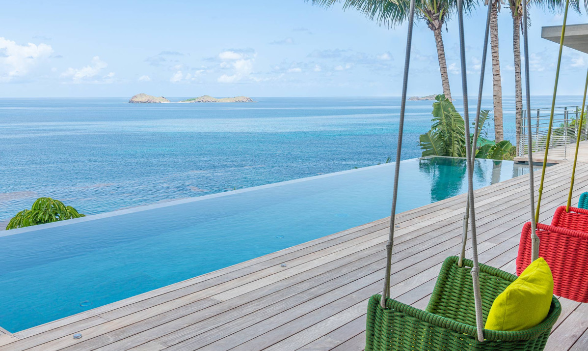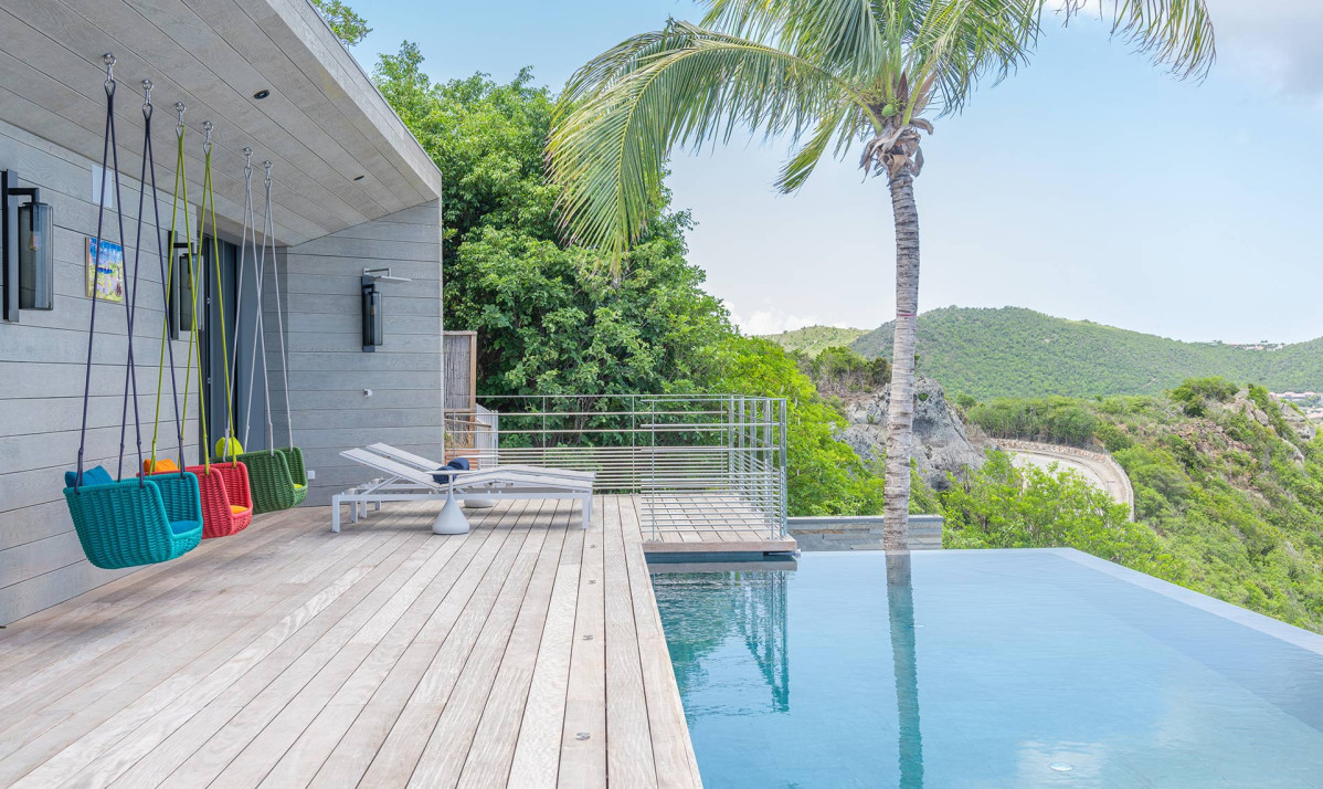 The exterior of property, crafted across two levels. On the main level, the living room, kitchen, pool, and two bedrooms create a seamless indoor-outdoor living experience. The heated pool, a centerpiece of the property, invites relaxation with stunning ocean view. Above, two additional bedrooms offer elevated vistas. The villa's covered terrace is adorned with three hanging chairs, perfect for ocean gazing. For al fresco dining, a table sits elegantly under a pergola, blending with the lush, tropical surroundings. This exquisite arrangement makes Villa Honu St Barts a haven of serenity and beauty.