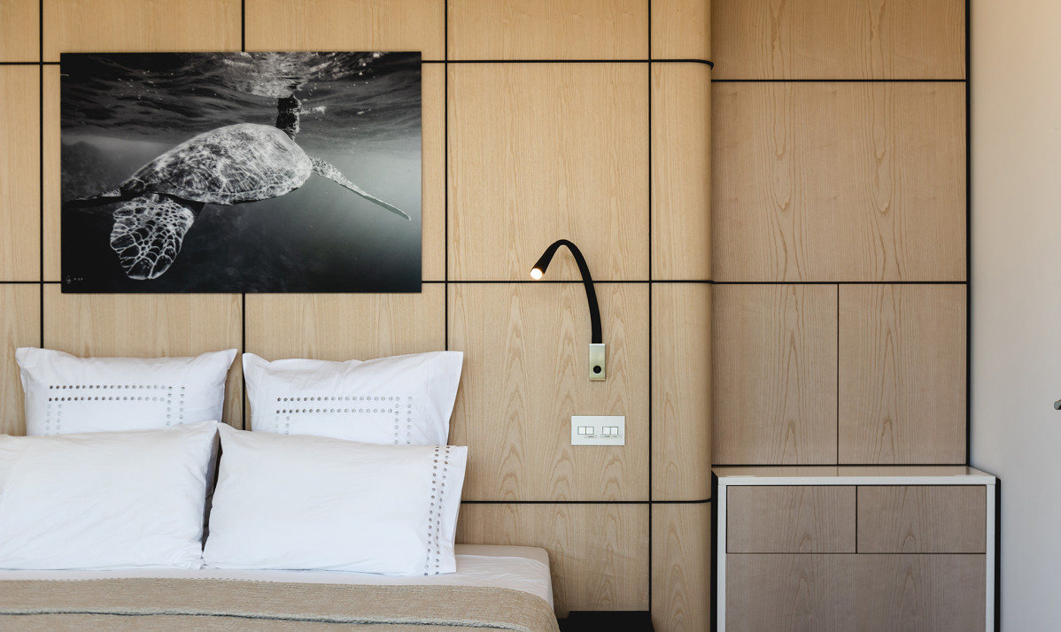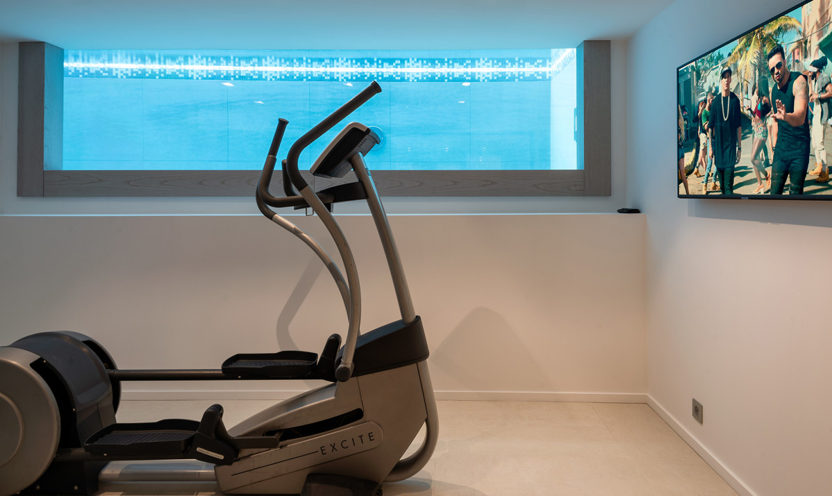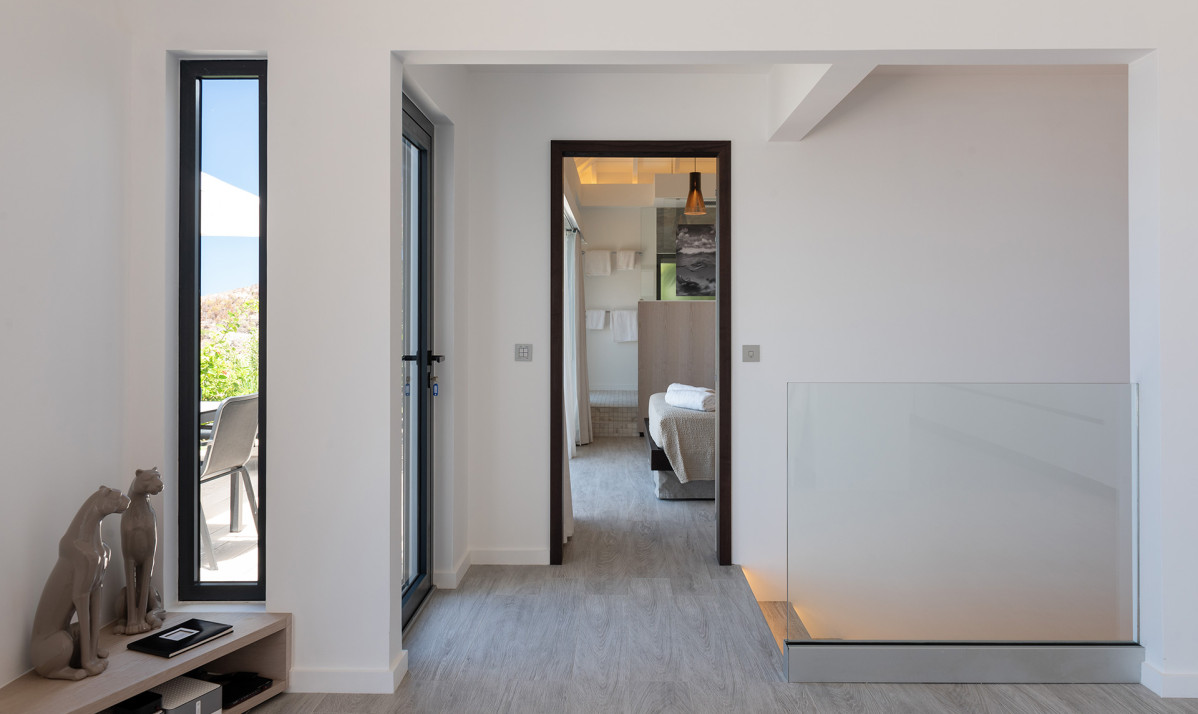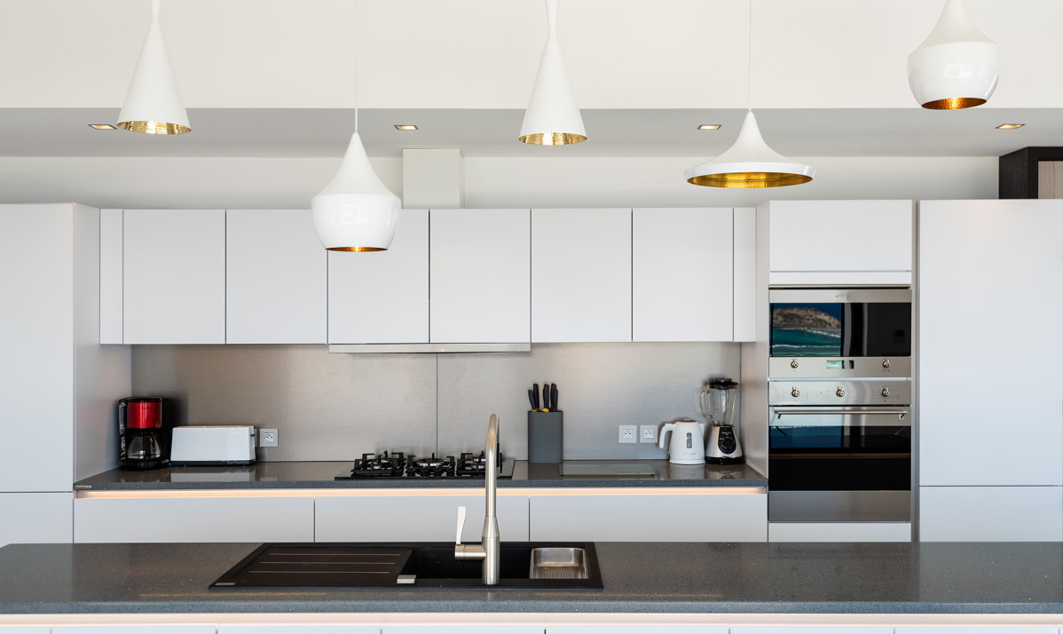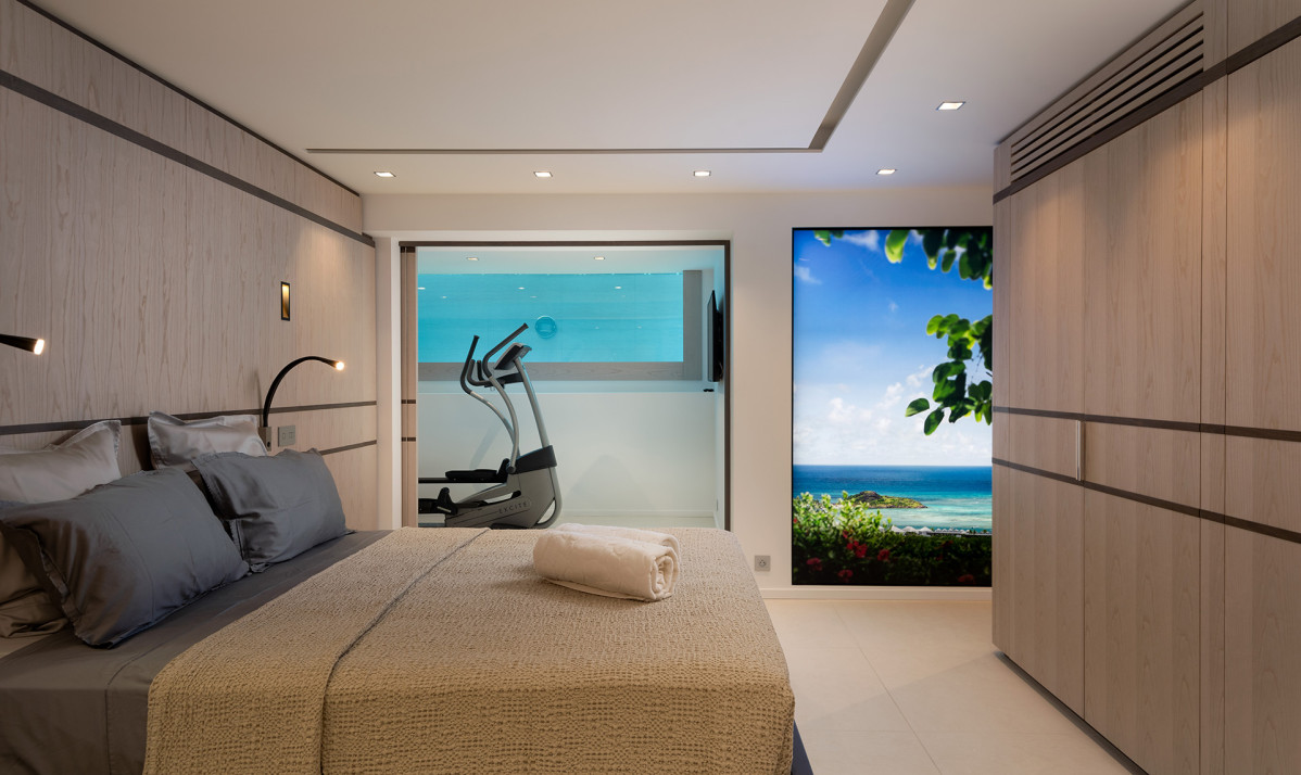 The three ensuite bedrooms are all very contemporary too, but homely thanks to warmer colors in the bed linens and furnishings, and with fantastic natural photography on the walls. Two of the bedrooms grace either side of the main living space and both feature jaw-dropping views to wake up to each morning. The third bedroom, one level below, offers a unique alternative – guests can still wake to ocean views, plus there’s an adjacent fitness room with a window into the swimming pool.