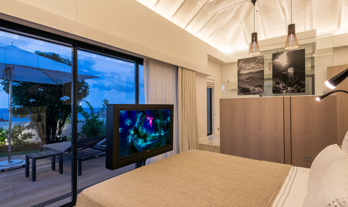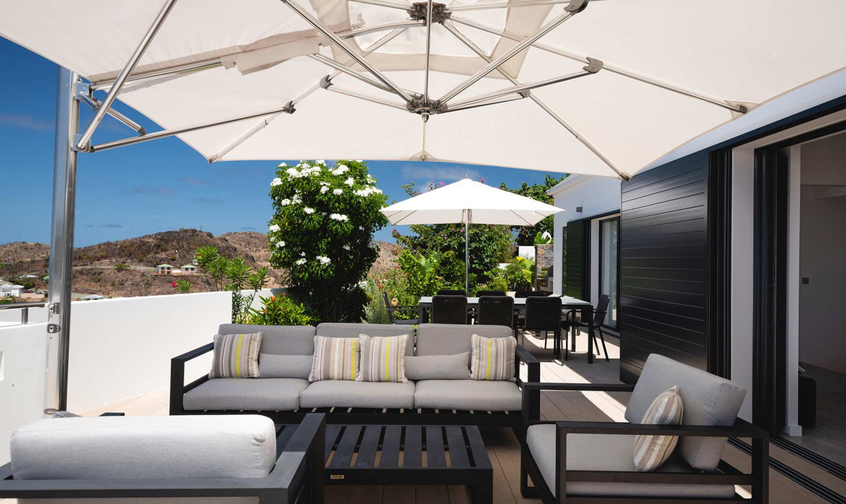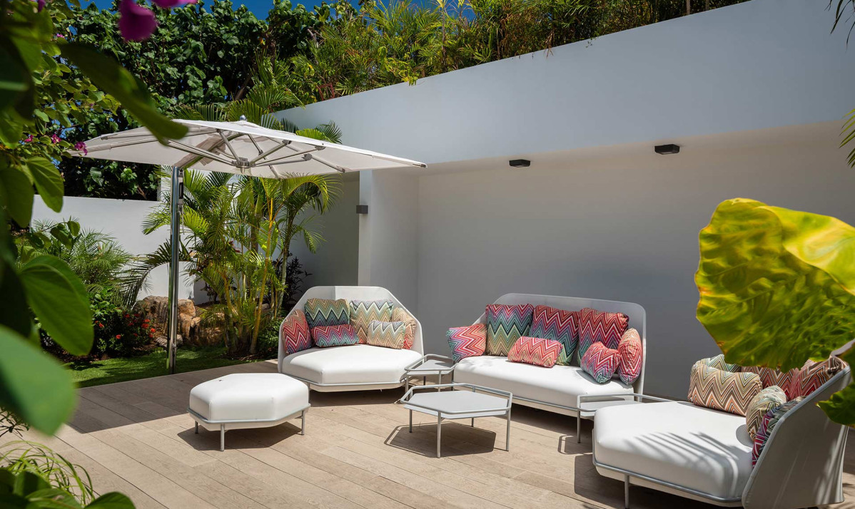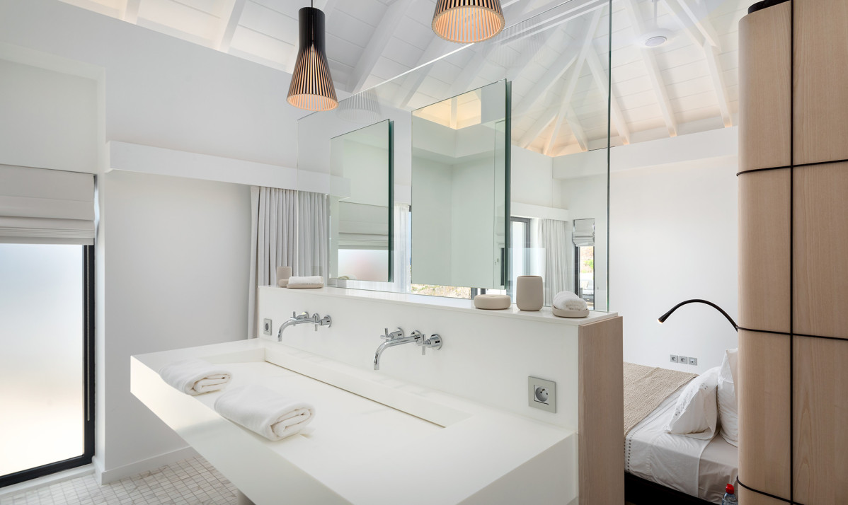 The whitewashed exterior of Villa Iris is broken up by Contemporary touches of grays and blacks, both inside and out. Reaching across the entire length of the villa, the main terrace has many spots where you can lounge, dine or sunbathe, all centered around a gorgeous infinity pool where large sunshades can be angled to provide shade or sun throughout the day. Continue past the main terrace and you come to a more secluded spot, sheltered by tropical plants where you can sit and lounge, day or night.