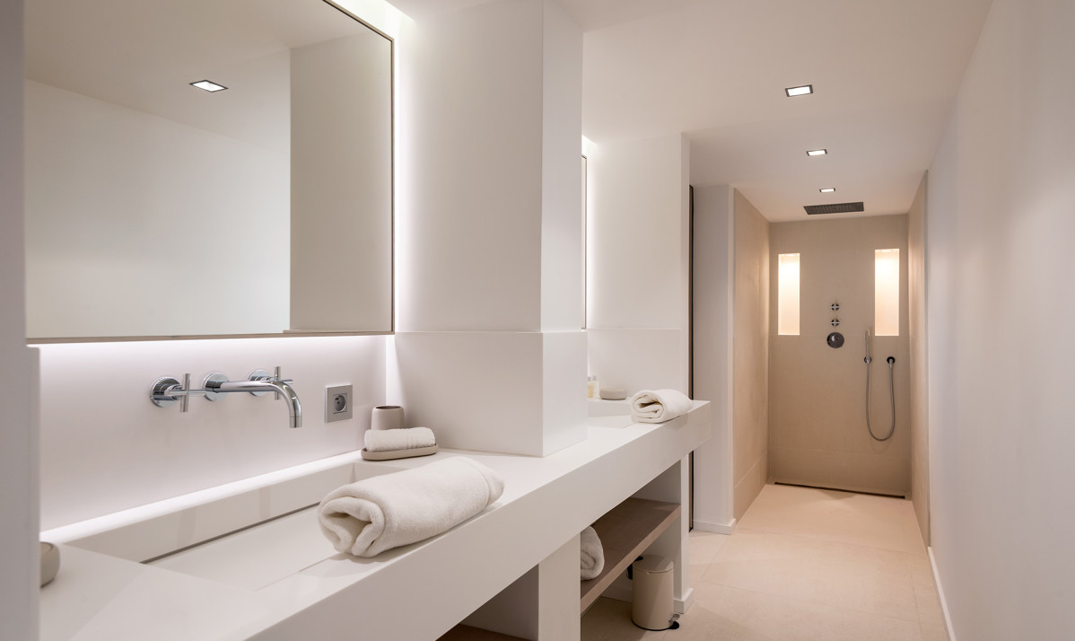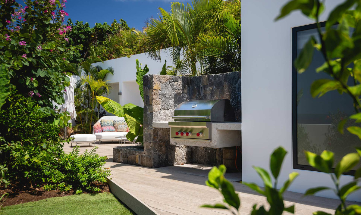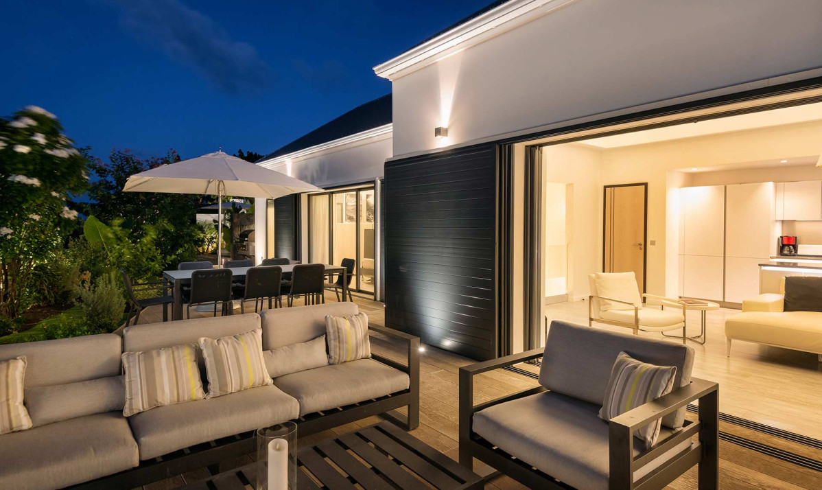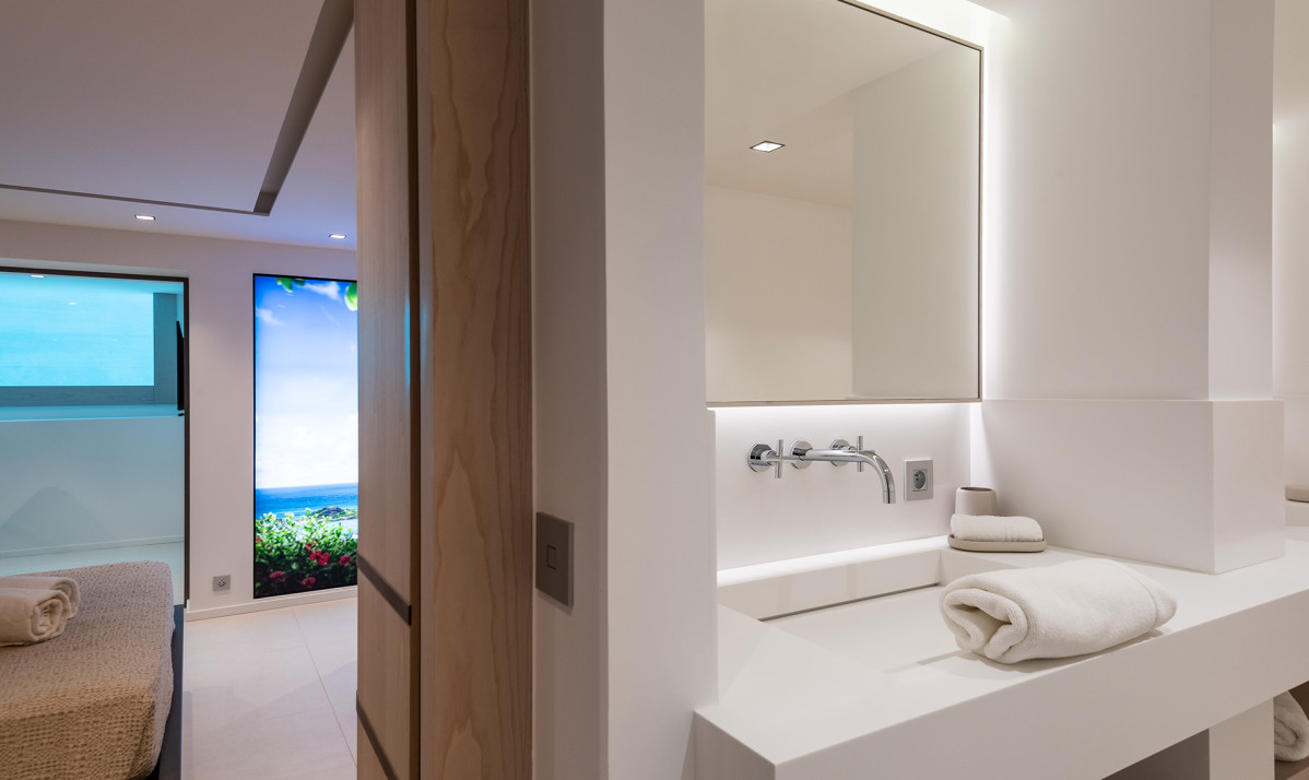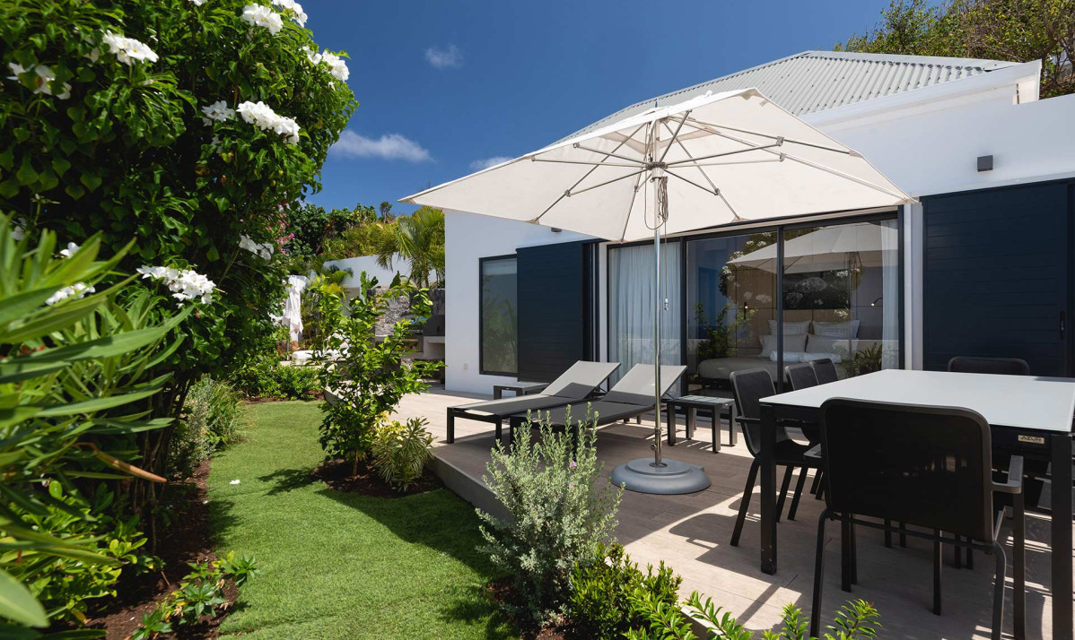 The whitewashed exterior of Villa Iris is broken up by Contemporary touches of grays and blacks, both inside and out. Reaching across the entire length of the villa, the main terrace has many spots where you can lounge, dine or sunbathe, all centered around a gorgeous infinity pool where large sunshades can be angled to provide shade or sun throughout the day. Continue past the main terrace and you come to a more secluded spot, sheltered by tropical plants where you can sit and lounge, day or night.