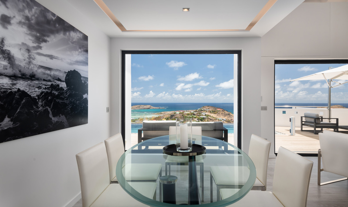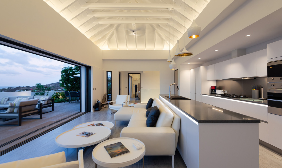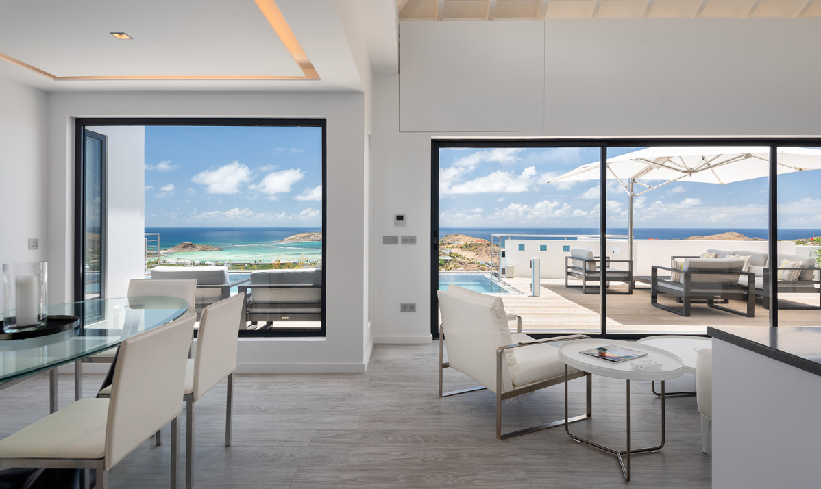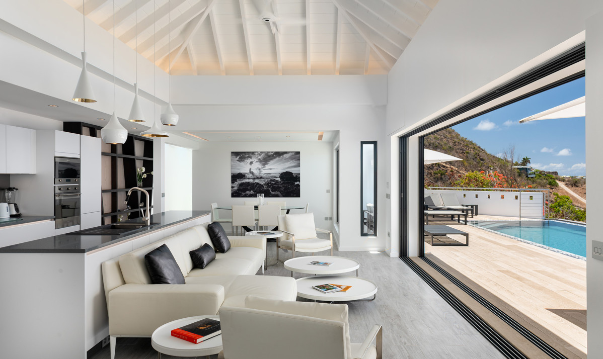 The internal living room is superbly designed to make the most of the space with a kitchen at the rear and sofas in front, all oriented to the views. Following the modern theme and the white and gray color scheme, the kitchen is sleek and clean with everything several couples or a family could need. Walls of windows let the light in and maximize the views, and to one side of the living area is the indoor dining room, great for formal dinners, while dining tables outside offer an alfresco alternative.