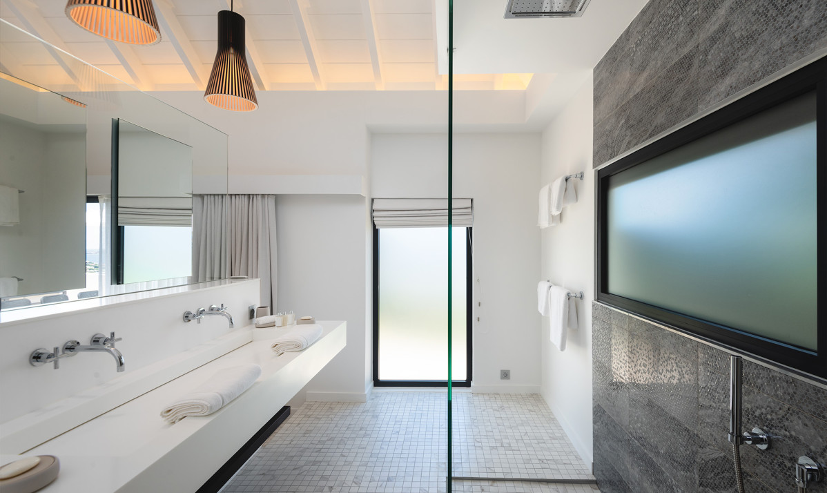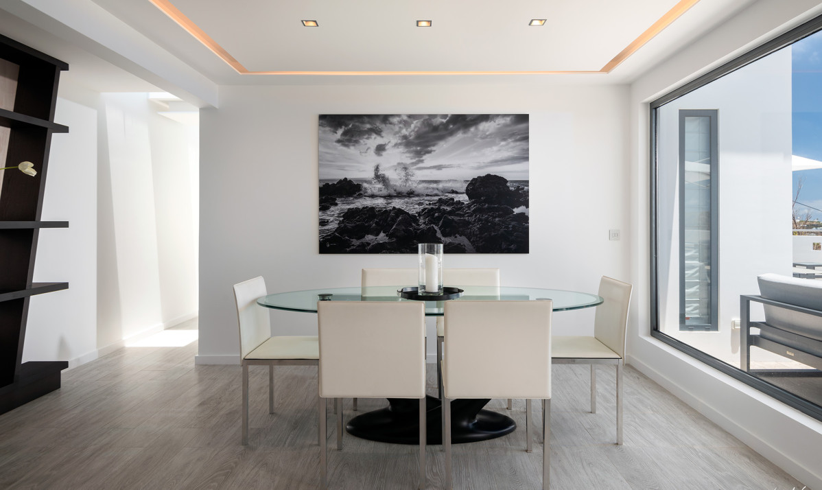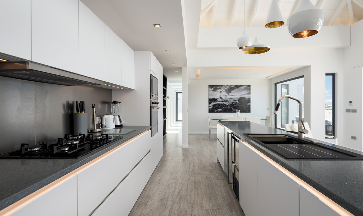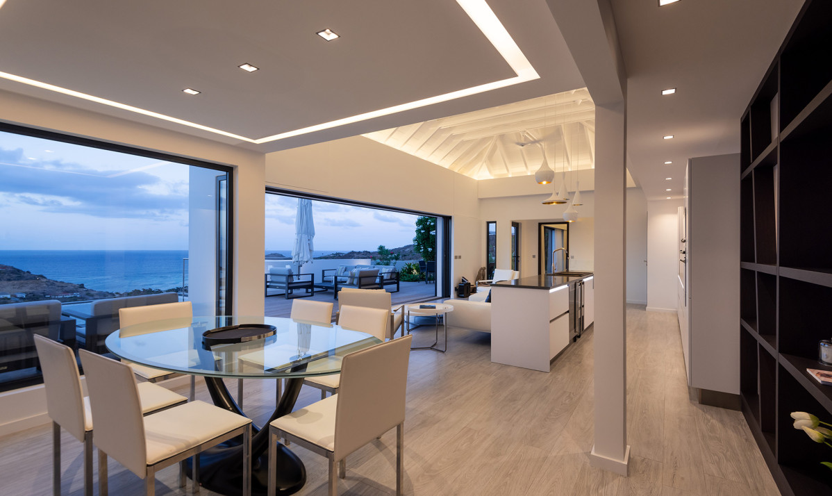 The internal living room is superbly designed to make the most of the space with a kitchen at the rear and sofas in front, all oriented to the views. Following the modern theme and the white and gray color scheme, the kitchen is sleek and clean with everything several couples or a family could need. Walls of windows let the light in and maximize the views, and to one side of the living area is the indoor dining room, great for formal dinners, while dining tables outside offer an alfresco alternative.