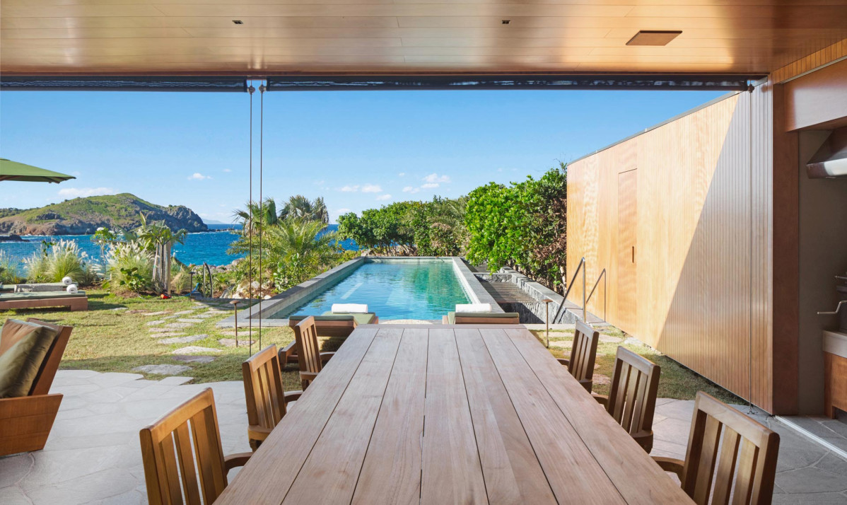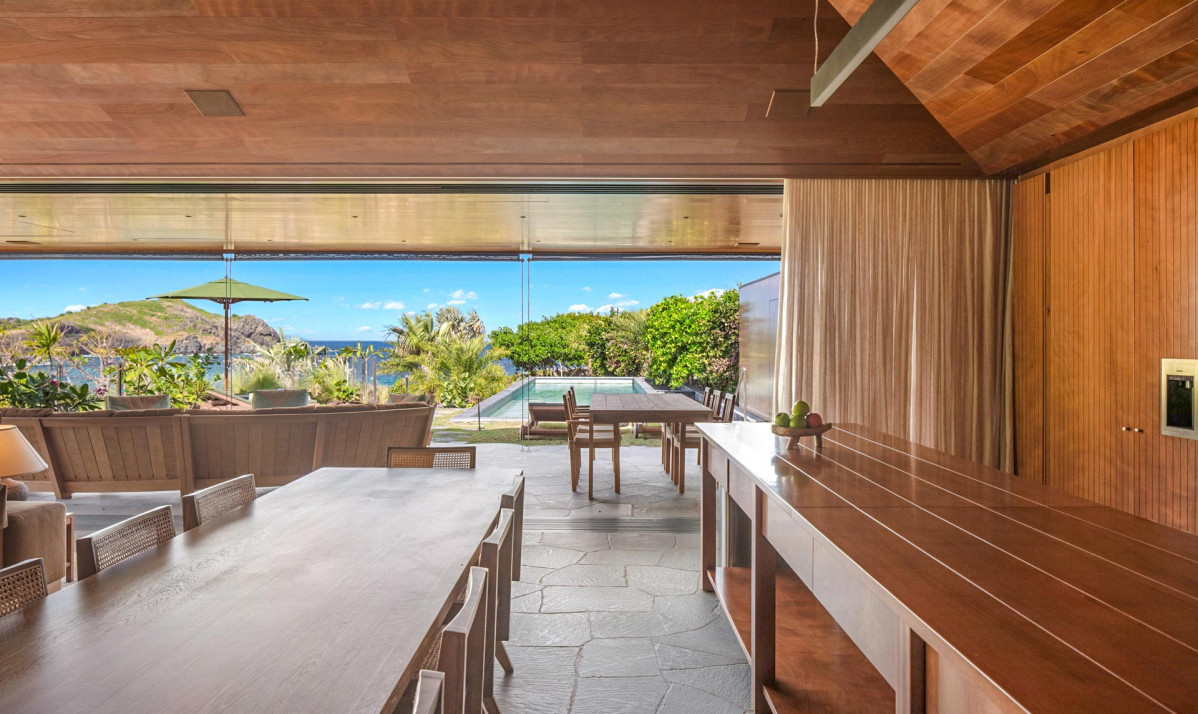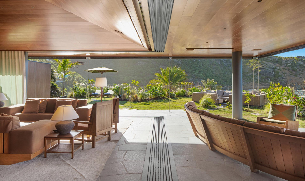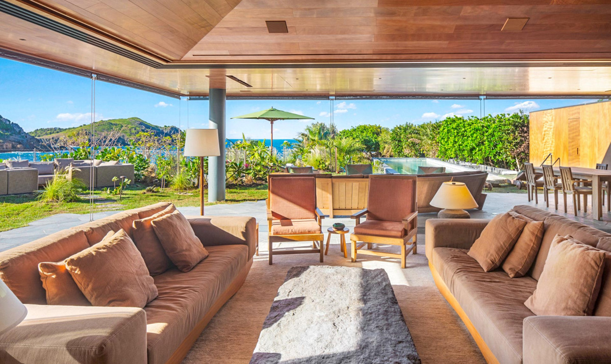 The home features an exceptional interior that seamlessly blends with its natural surroundings. The main great space, crowned by a four-sided roof, offers an open and airy ambiance with warm wood and natural stone finishes. A hidden entrance leads to a unique atrium-like garage, which doubles as an exclusive event space, accommodating up to 150 guests for private gatherings. The home's design prioritizes fluidity between indoor and outdoor spaces, creating a refined yet inviting atmosphere. Its one-of-a-kind architecture sets it apart as a true masterpiece among private villas in St Barts.