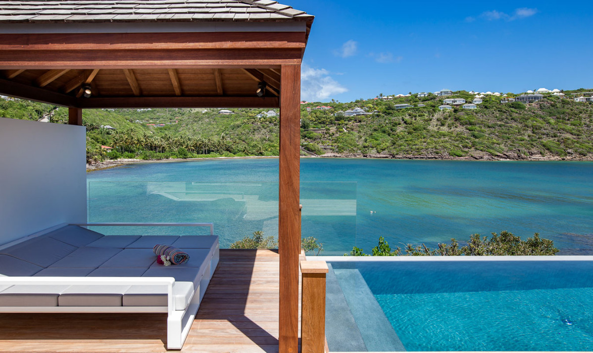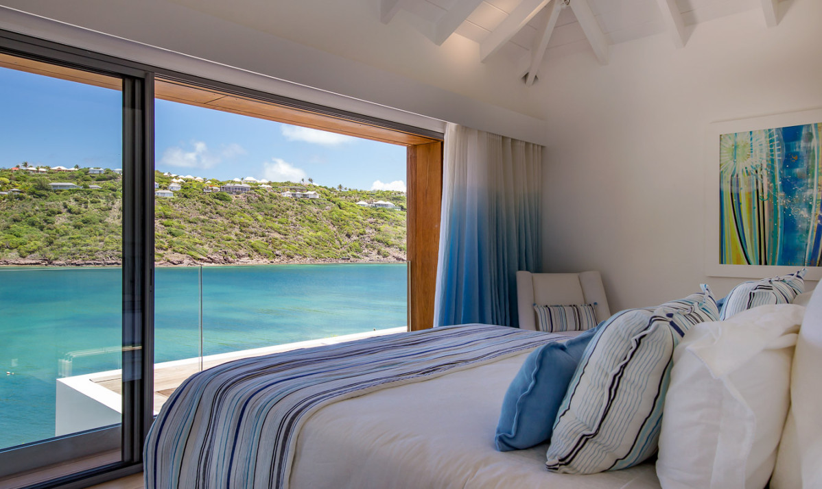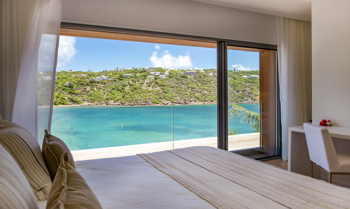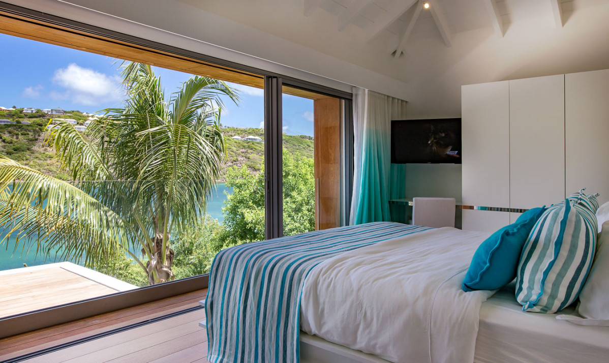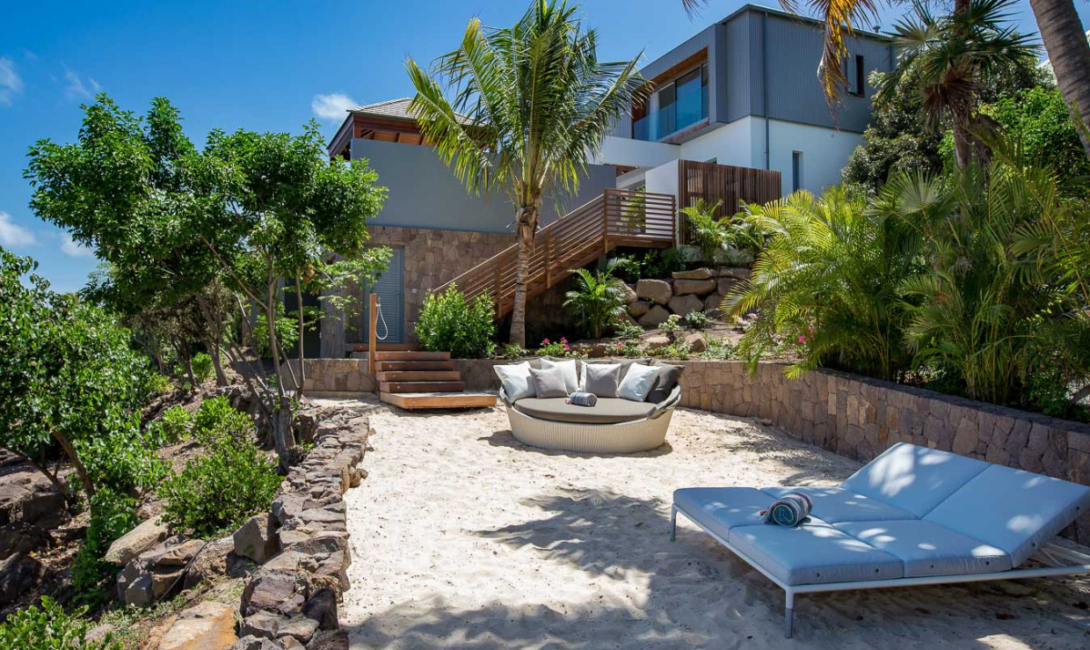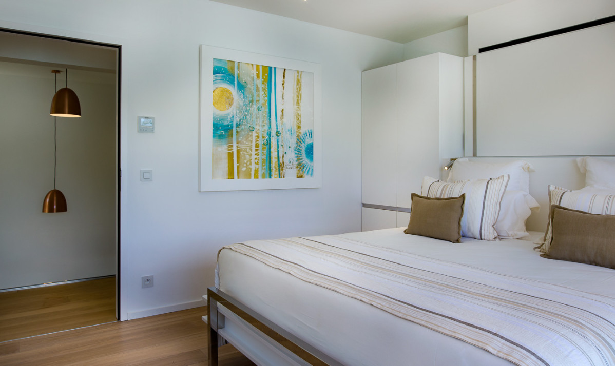 This 2-story villa is light, bright and inviting in every way. Set just about at eye level with the bay, the views are one of the biggest highlights to this villa. Watch boats and people come and go from your own private piece of paradise, while from inside the infinity pool it feels as though guests can swim right into the bay. At one end of the pool deck there’s a gazebo with massive day-bed, and under the terrace a huge swinging day-bed provides the ultimate place to relax. A dining area and outdoor living area rounds off the exterior spaces, without forgetting the steps down to your private beach where you can feel the sand beneath your feet.