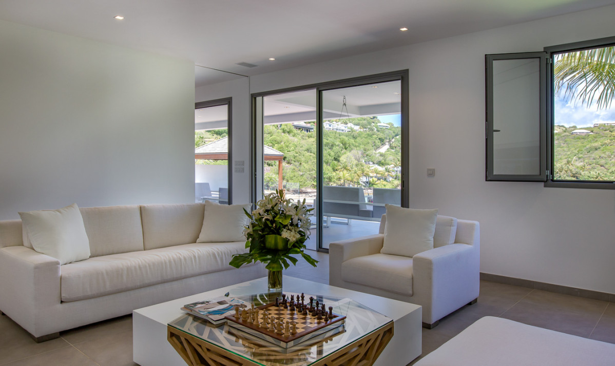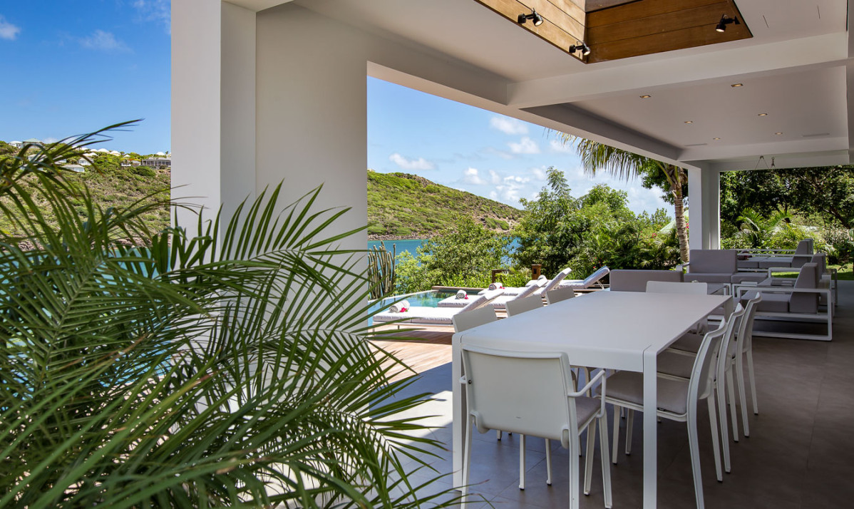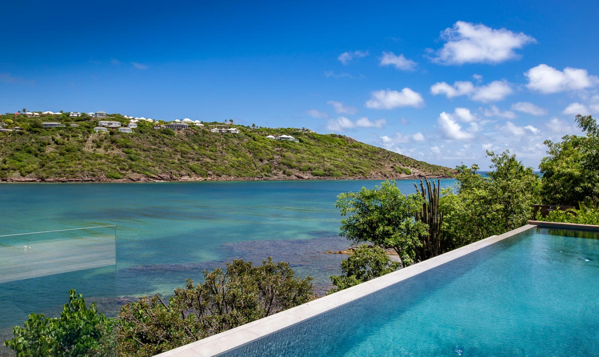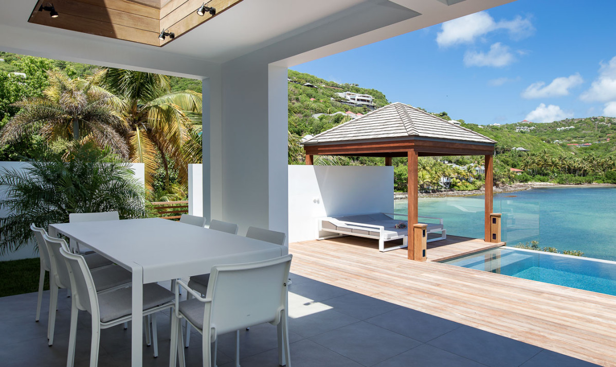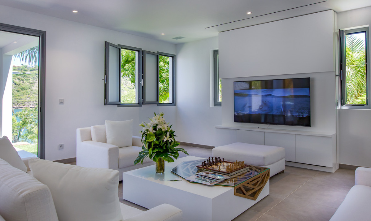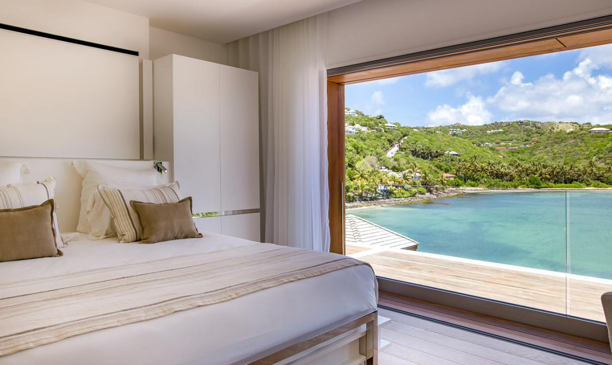 This 2-story villa is light, bright and inviting in every way. Set just about at eye level with the bay, the views are one of the biggest highlights to this villa. Watch boats and people come and go from your own private piece of paradise, while from inside the infinity pool it feels as though guests can swim right into the bay. At one end of the pool deck there’s a gazebo with massive day-bed, and under the terrace a huge swinging day-bed provides the ultimate place to relax. A dining area and outdoor living area rounds off the exterior spaces, without forgetting the steps down to your private beach where you can feel the sand beneath your feet.