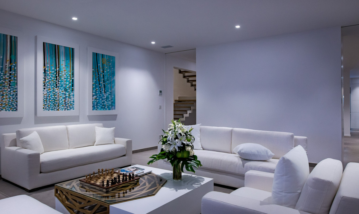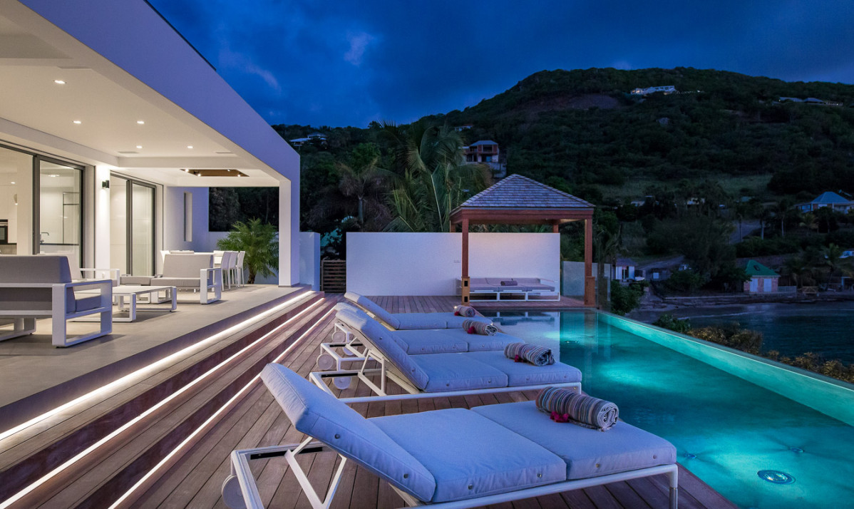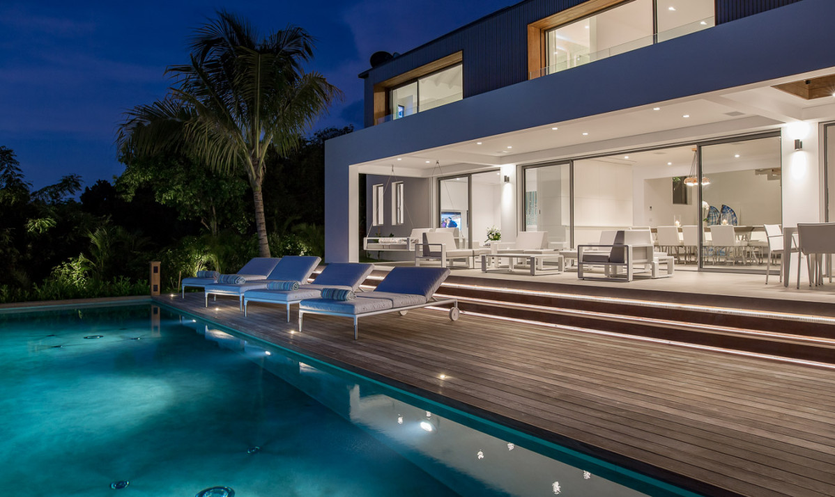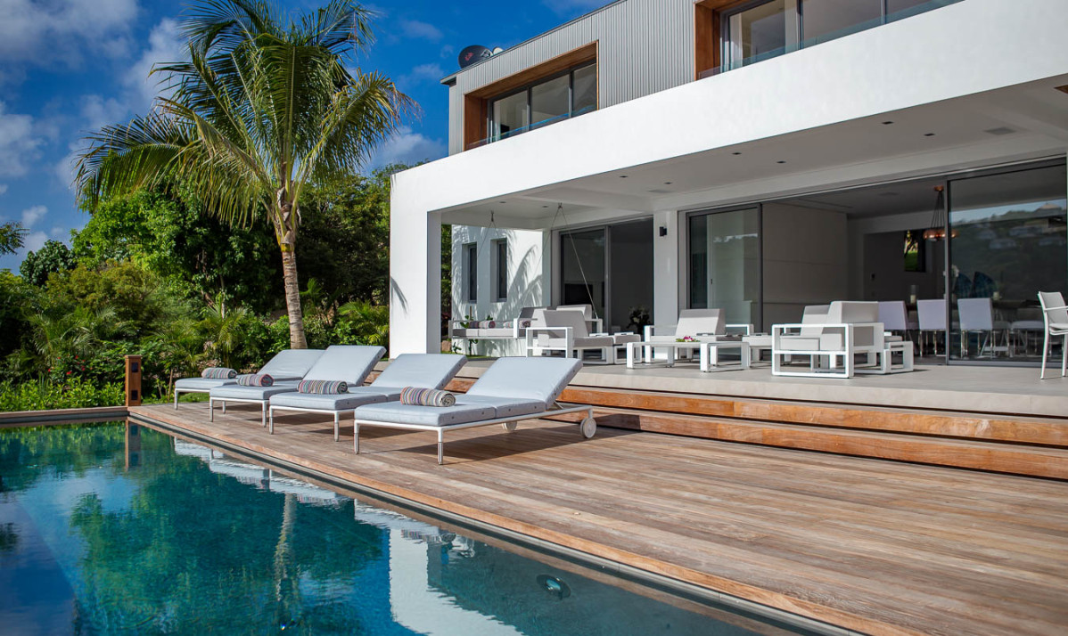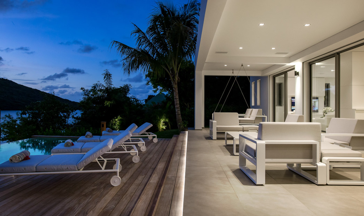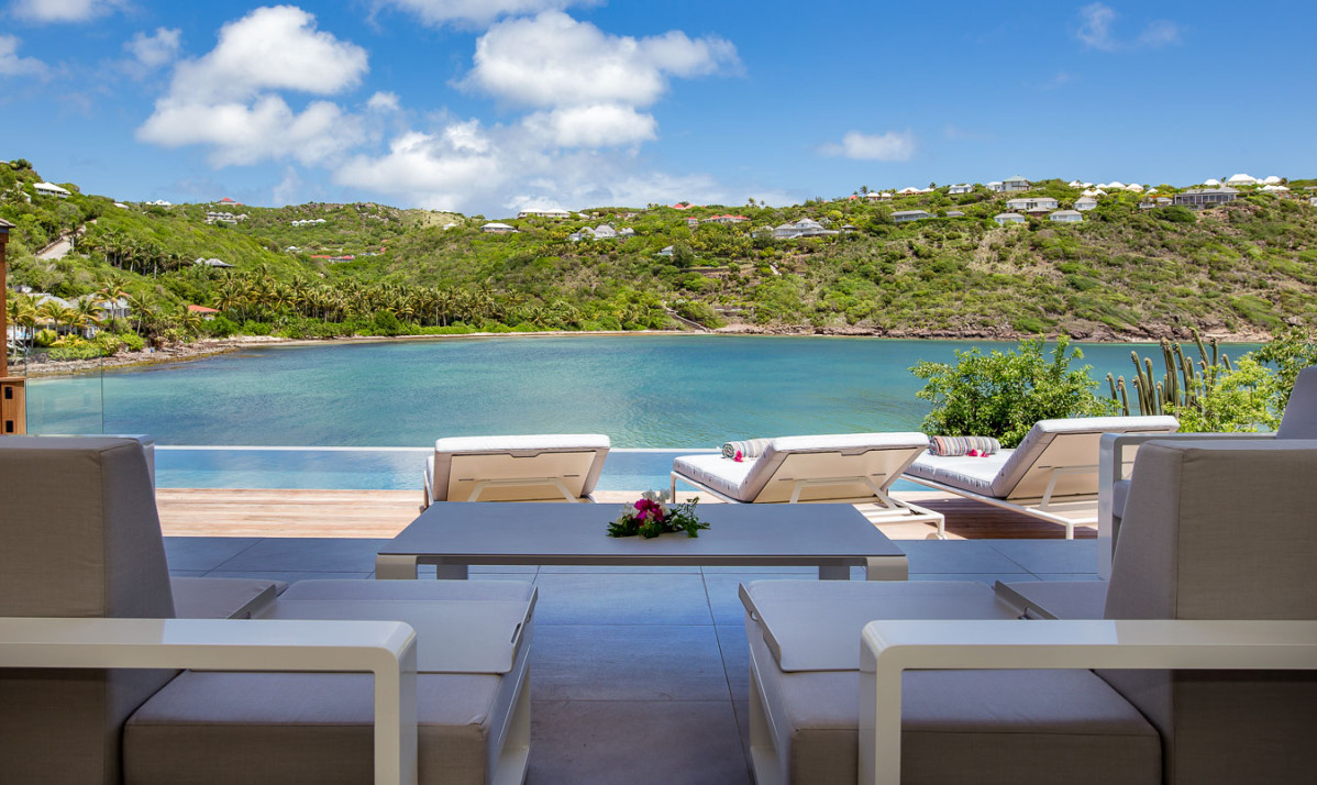 This 2-story villa is light, bright and inviting in every way. Set just about at eye level with the bay, the views are one of the biggest highlights to this villa. Watch boats and people come and go from your own private piece of paradise, while from inside the infinity pool it feels as though guests can swim right into the bay. At one end of the pool deck there’s a gazebo with massive day-bed, and under the terrace a huge swinging day-bed provides the ultimate place to relax. A dining area and outdoor living area rounds off the exterior spaces, without forgetting the steps down to your private beach where you can feel the sand beneath your feet.