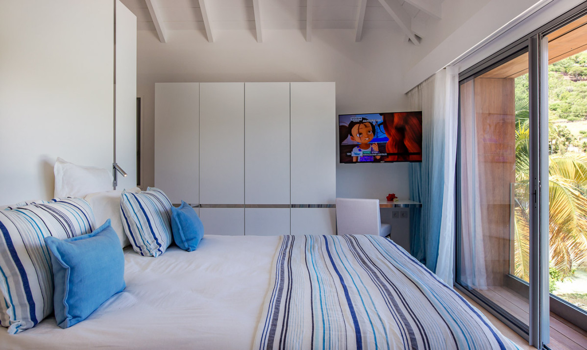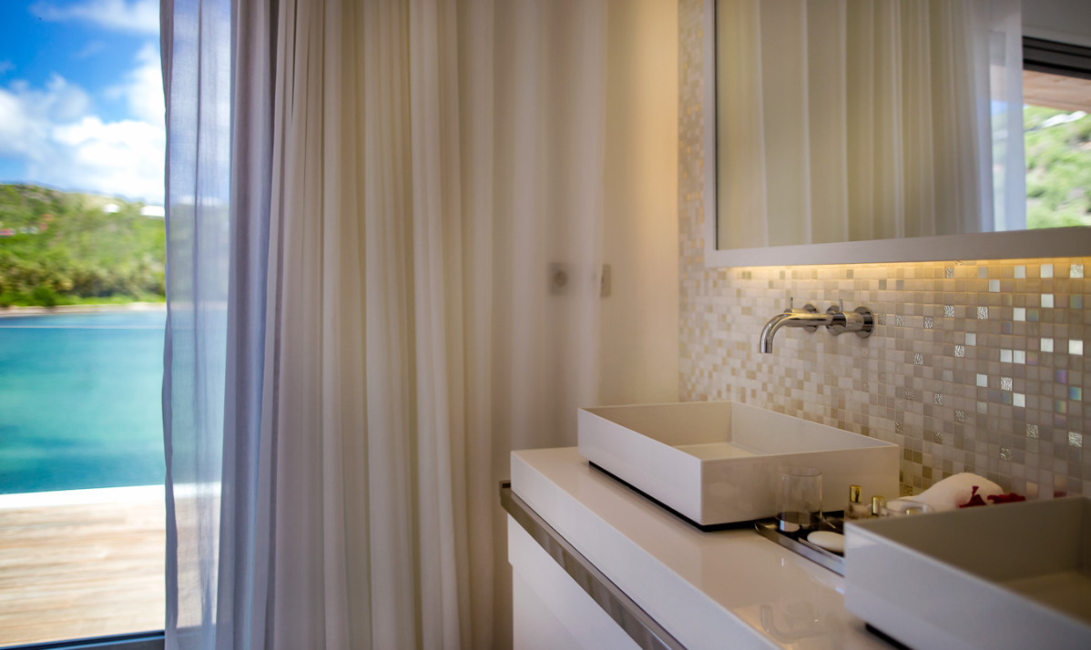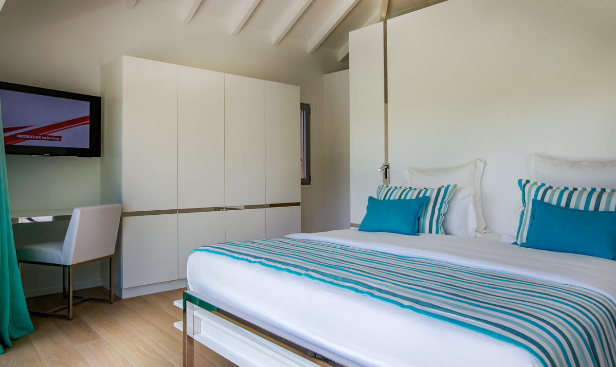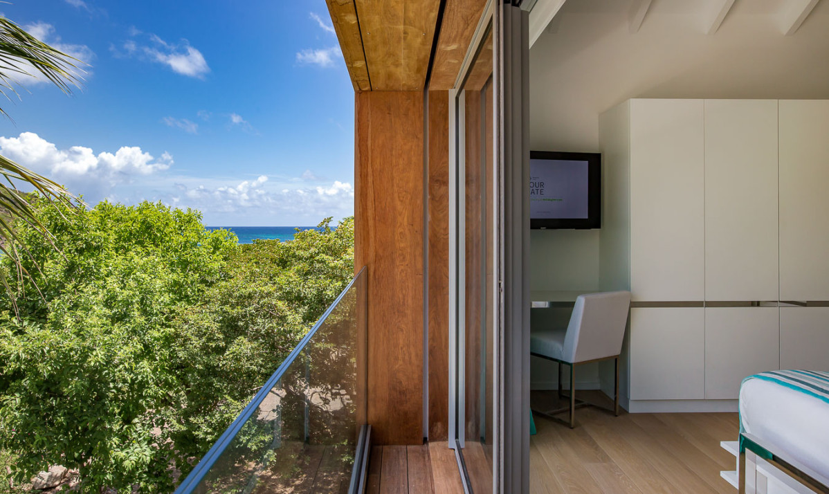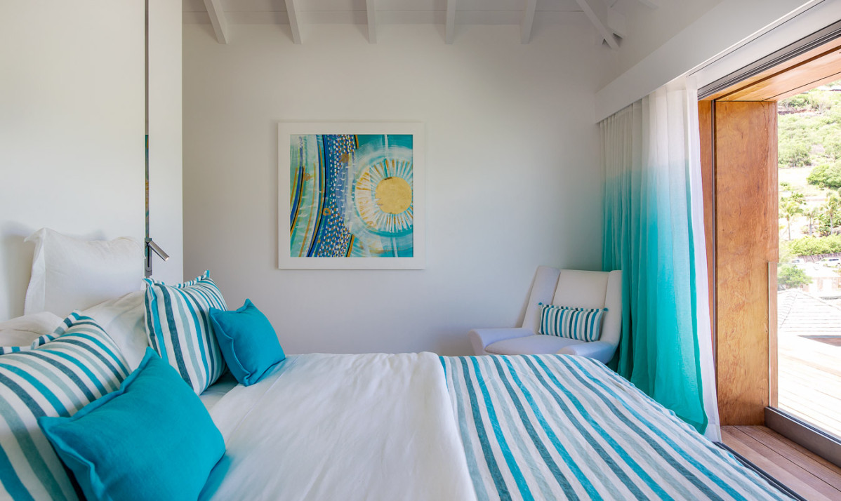 Reached via a very stylish floating staircase, the villa’s three bedroom suites are all upstairs. These are relaxing spaces that are not overly cluttered, feeling bright and inviting. Touches of color accent the white and there’s a small desk in each of the three suites plus a Juliet balcony so you can open the floor to ceiling windows all the way and allow the sea breezes to blow through. Each bathroom follows the same color scheme as its corresponding bedroom and is modern and bright.