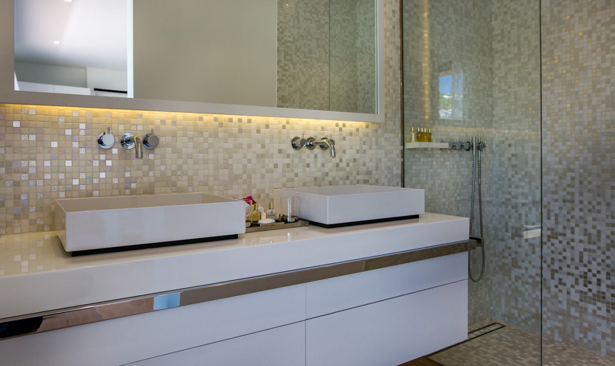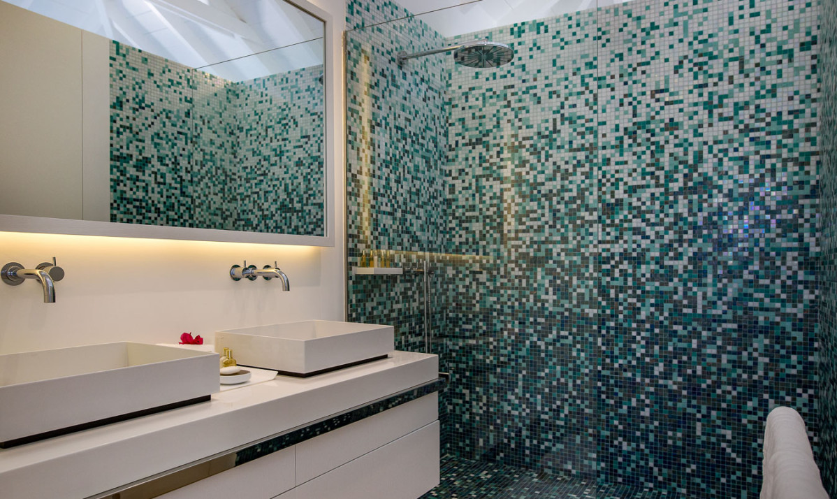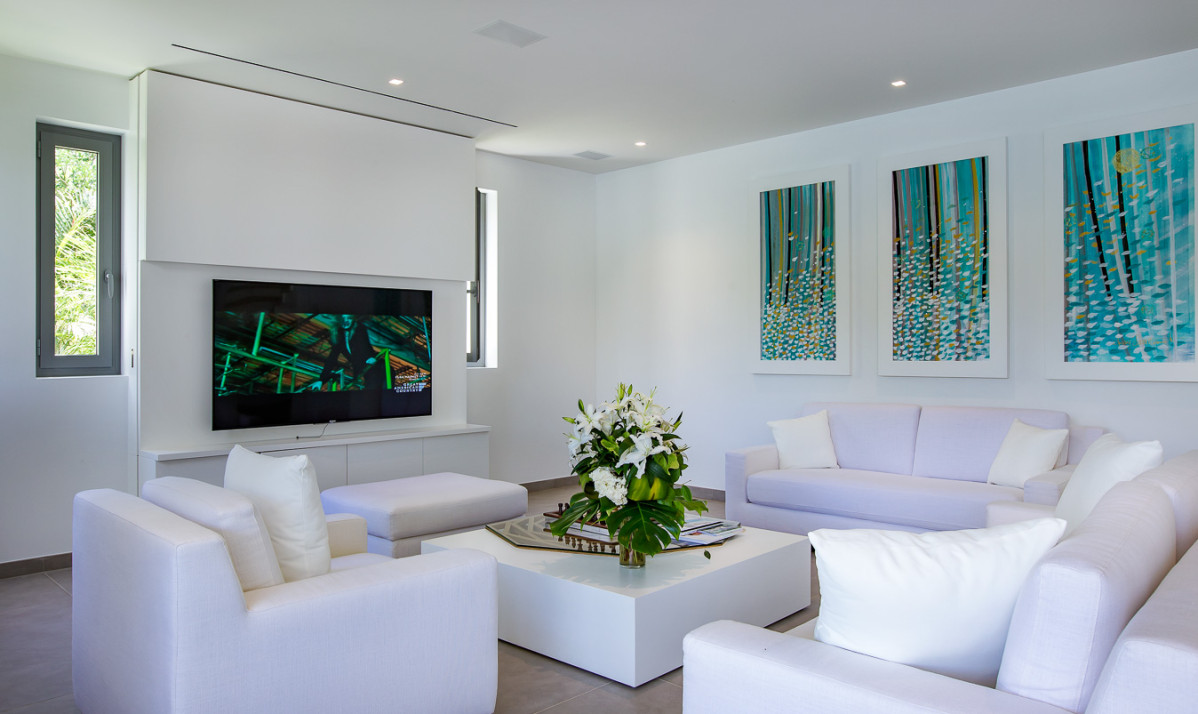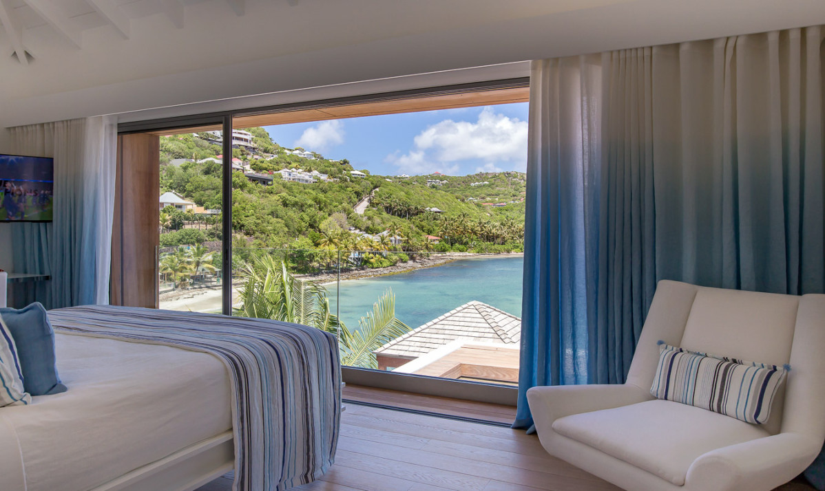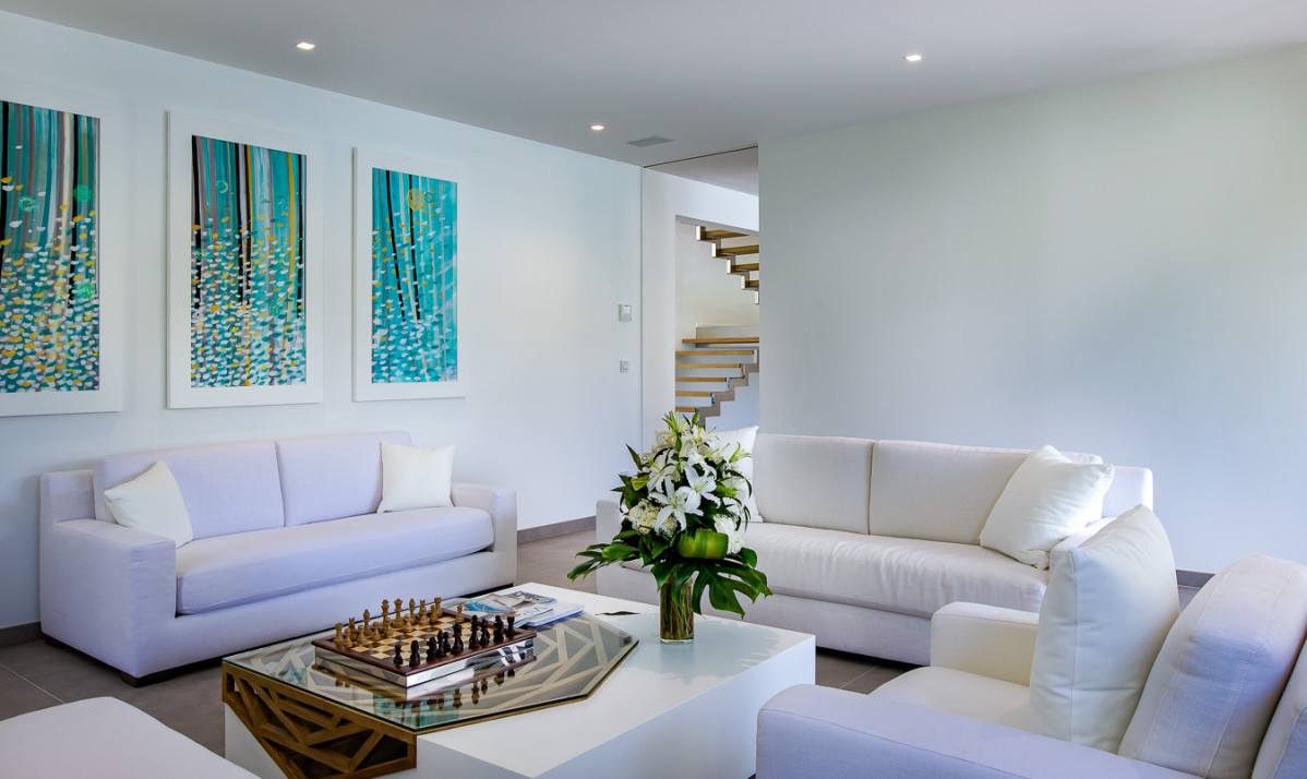Reached via a very stylish floating staircase, the villa’s three bedroom suites are all upstairs. These are relaxing spaces that are not overly cluttered, feeling bright and inviting. Touches of color accent the white and there’s a small desk in each of the three suites plus a Juliet balcony so you can open the floor to ceiling windows all the way and allow the sea breezes to blow through. Each bathroom follows the same color scheme as its corresponding bedroom and is modern and bright.
